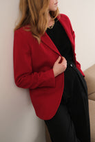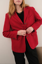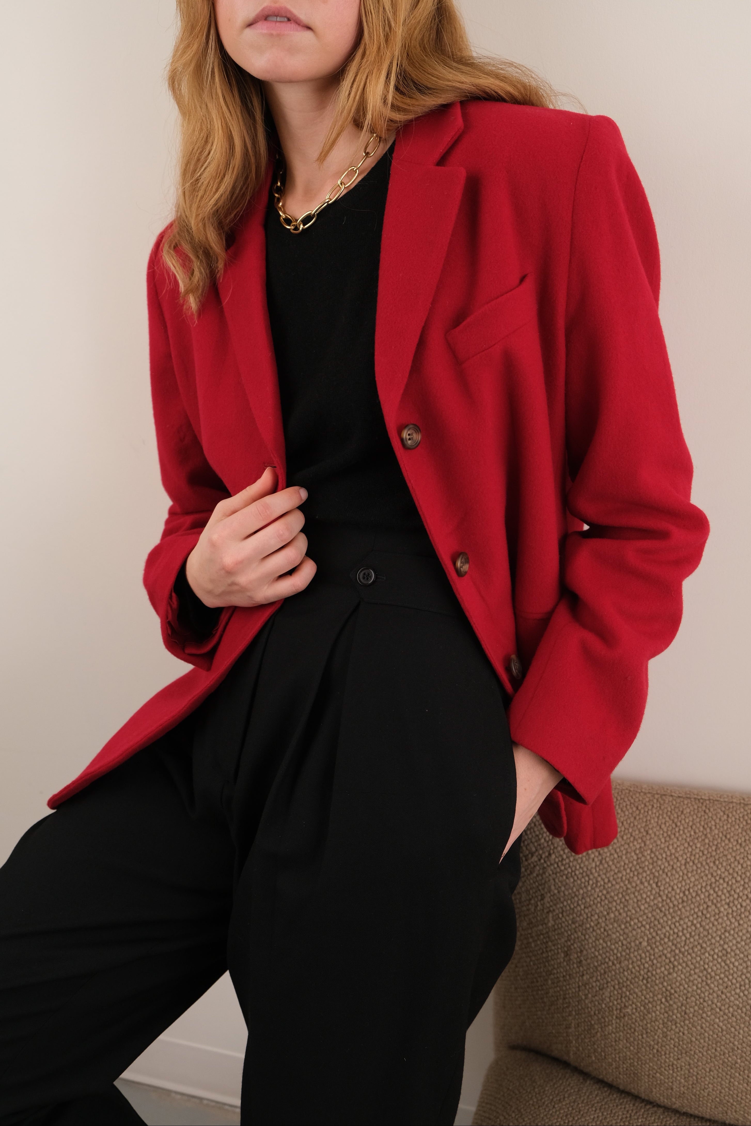 In stunning red wool and cashmere suiting (80% wool, 20% cashmere), this blazer feels softly structured and substantial, with a smooth surface that holds its shape. Cut with a tailored shoulder and straight body, it features notched lapels, flap pockets, a welted chest pocket, and tortoise buttons at the front and cuffs for warm contrast.