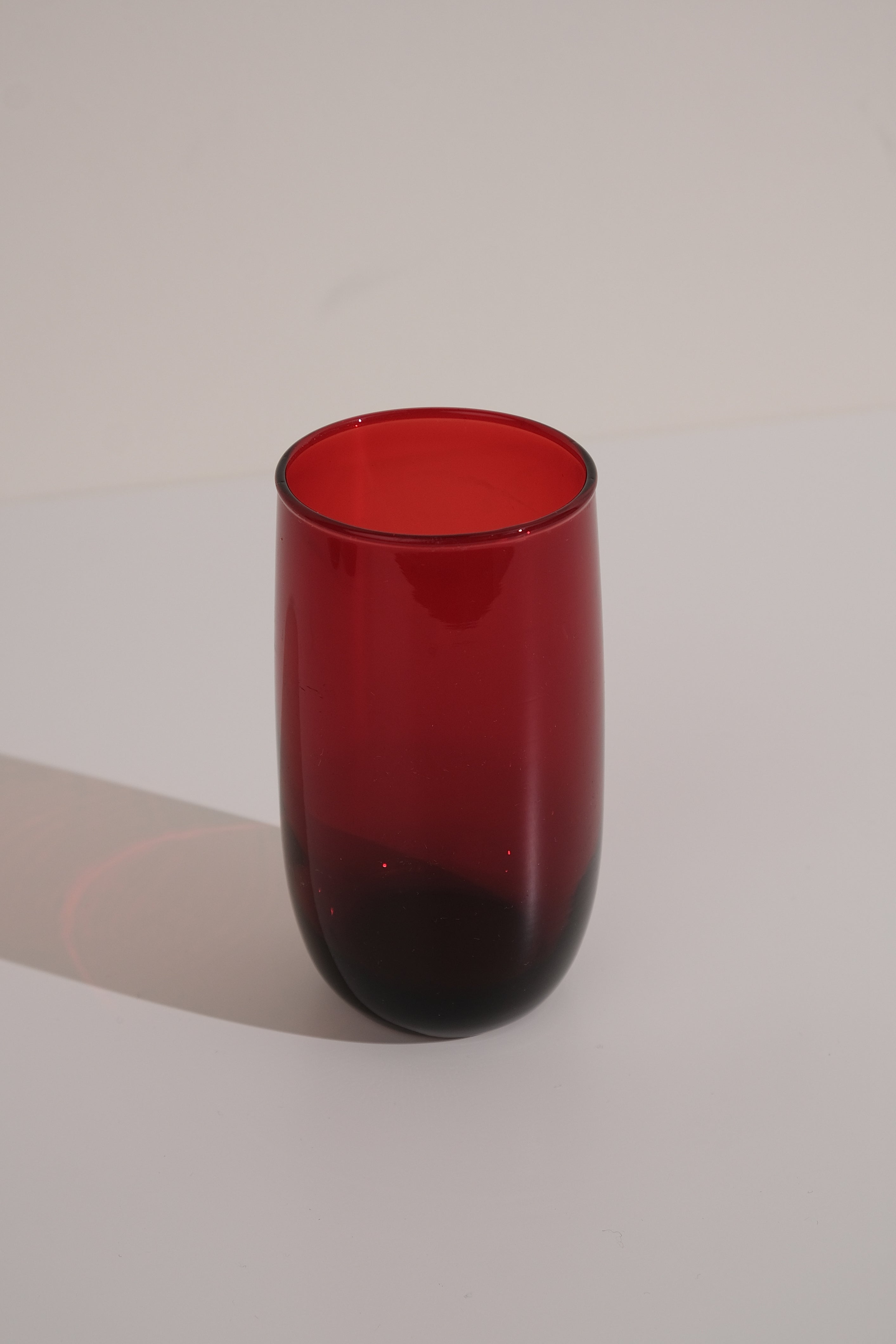 In deep red glass, this set of eight hand blown tumblers captures light with striking warmth and translucence. Each glass features subtle irregularities and pontil marks at the base, attesting to its handmade nature. The walls are smooth and slightly tapered, with a gentle weight that feels balanced in hand. Their rich tone deepens toward the base, lending a sense of quiet drama when filled or displayed.