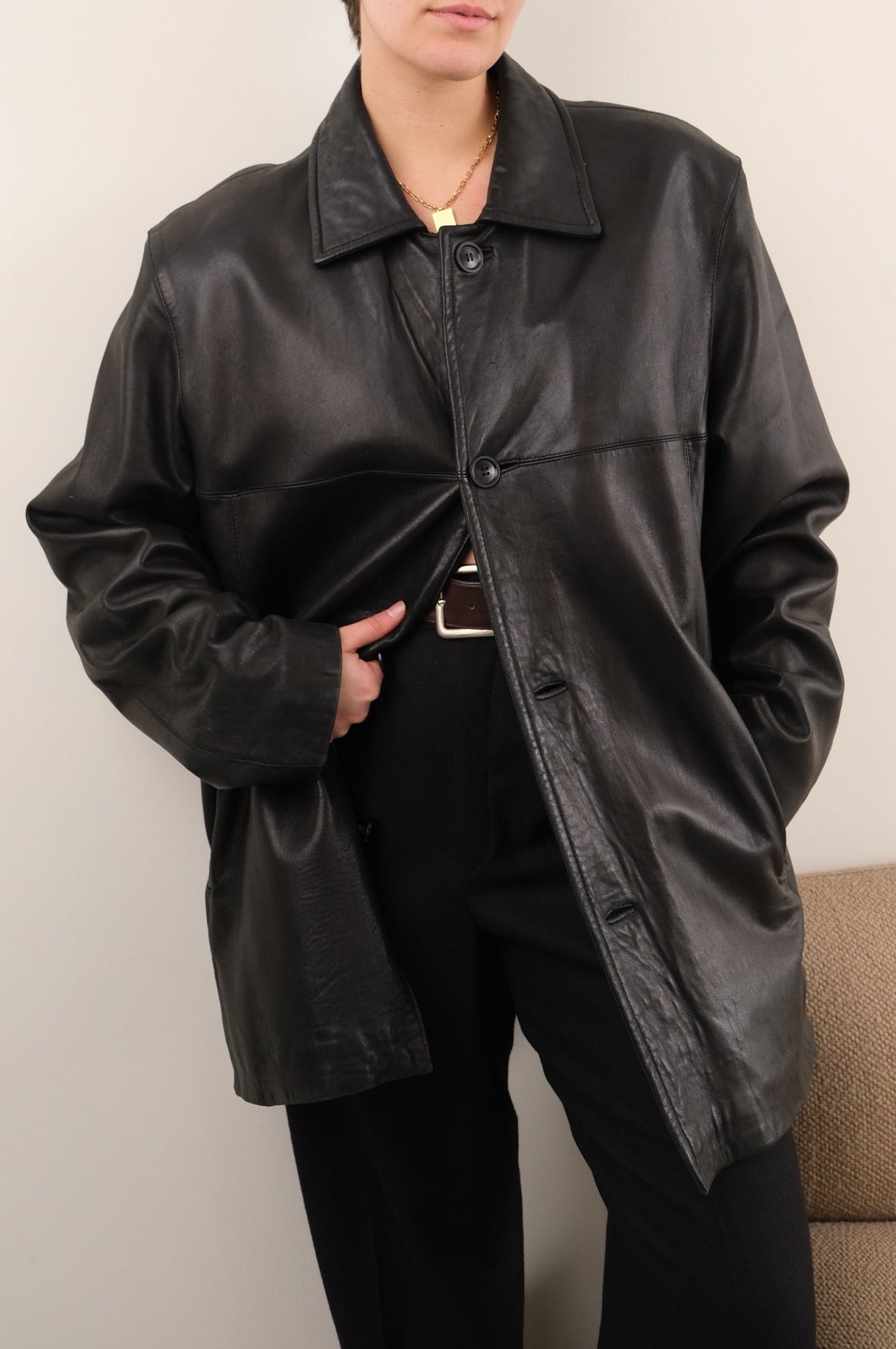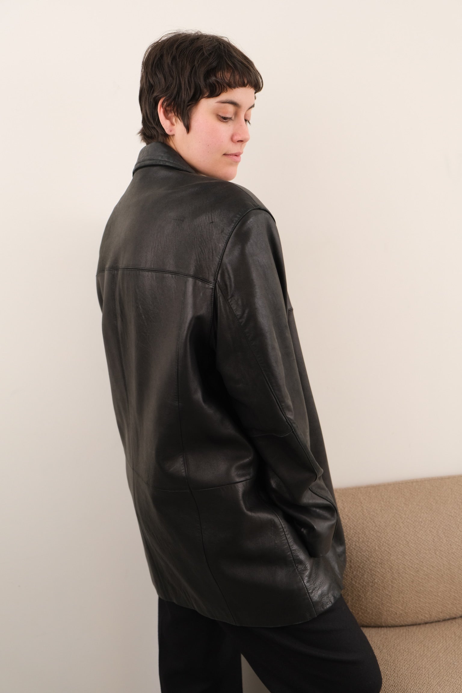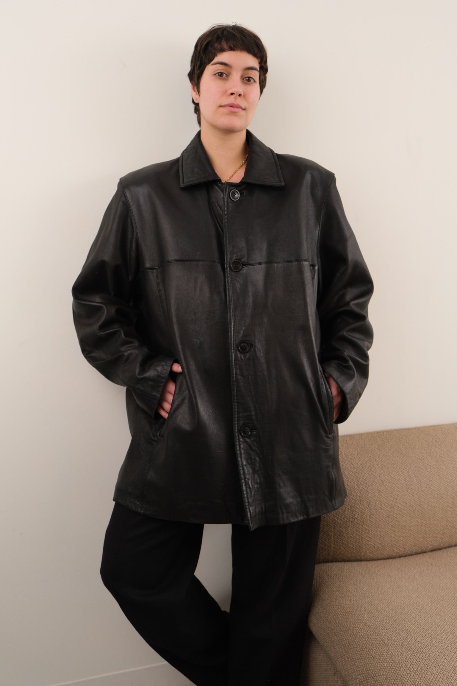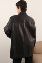 In sleek black genuine leather, this jacket feels smooth and soft to the touch, with a beautiful broken-in finish through the body and sleeves. The front closes with buttons over an additional hidden zipper, and the interior is quilted for extra insulation and warmth. Cut with a clean point collar and a relaxed, roomy shape, it layers easily without losing structure.