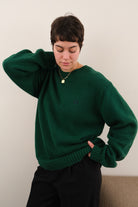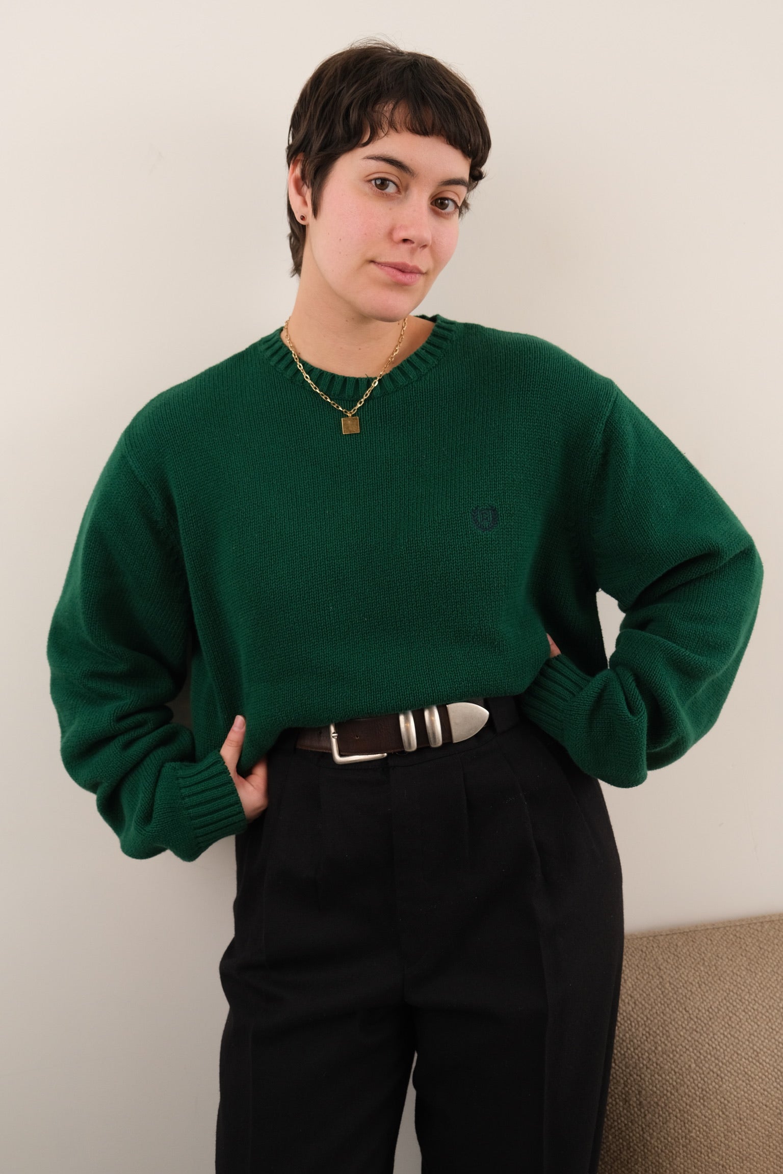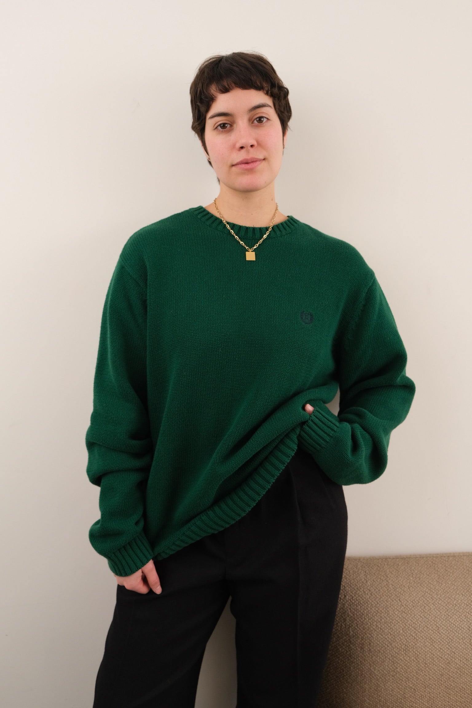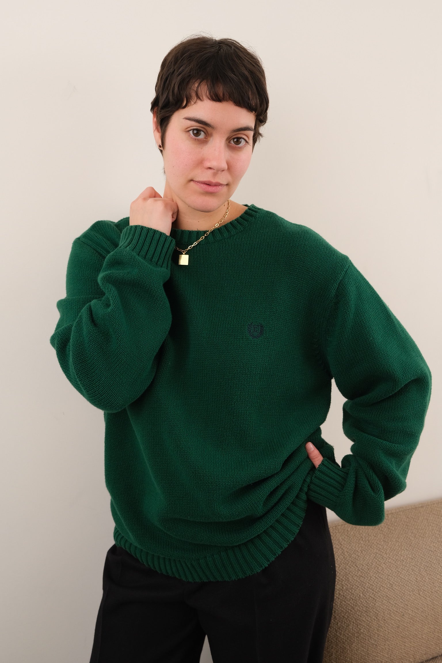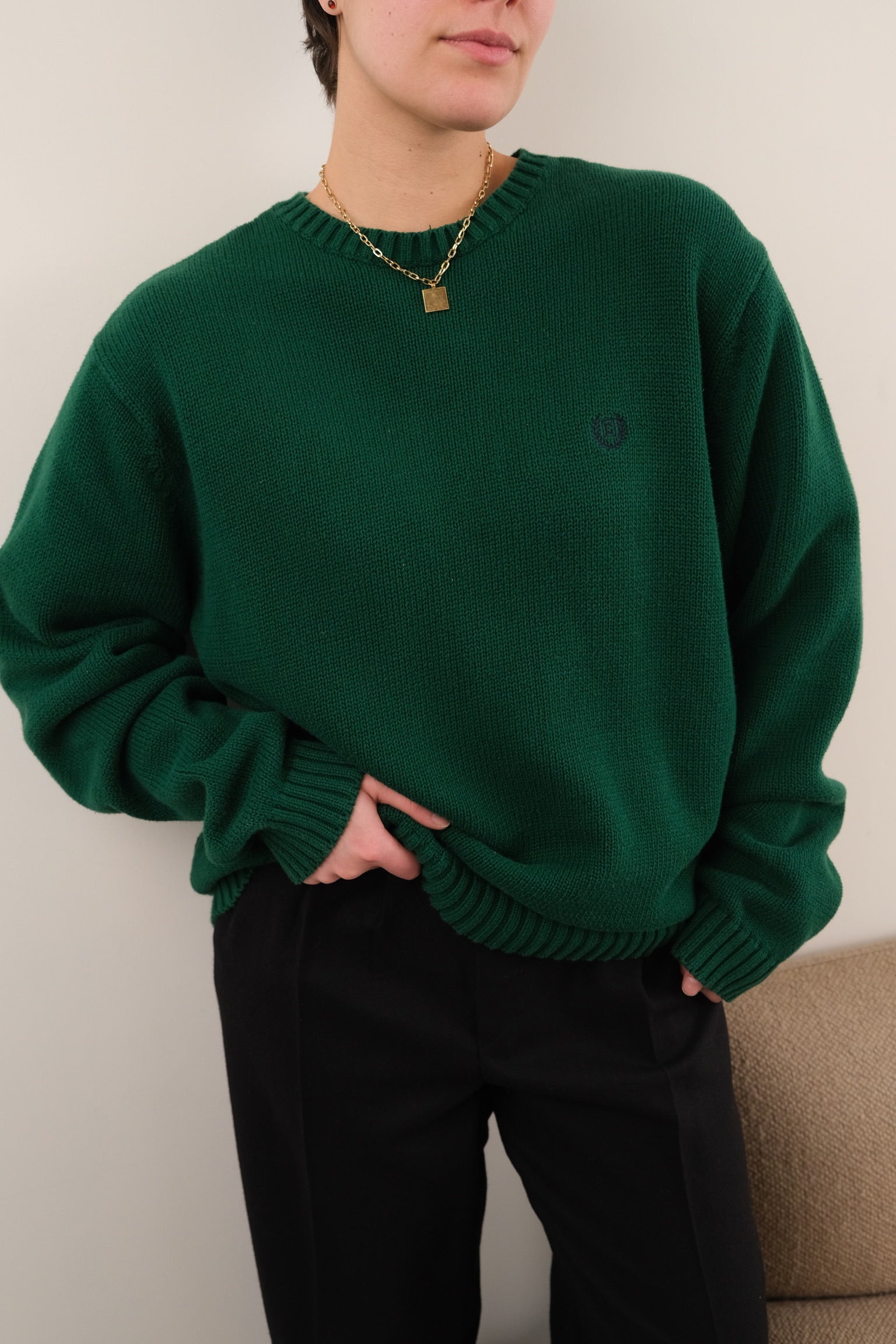 In deep green 100% cotton knit, this sweater feels soft and sturdy with a beautifully even, midweight weave. Finished with a ribbed crew neckline, rib-knit cuffs and hem, and a small Chaps crest embroidery at the chest, it wears with a clean, relaxed drape.