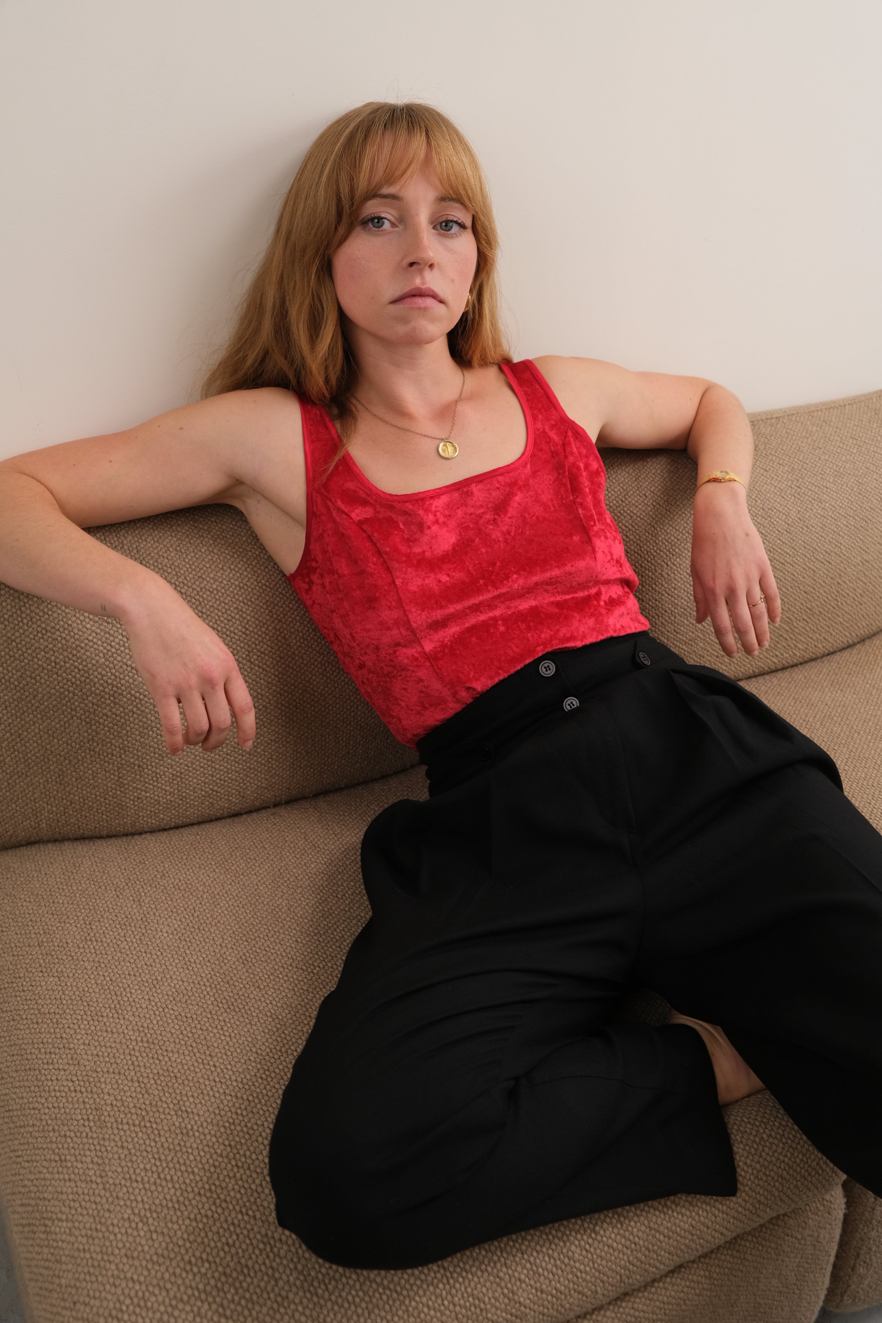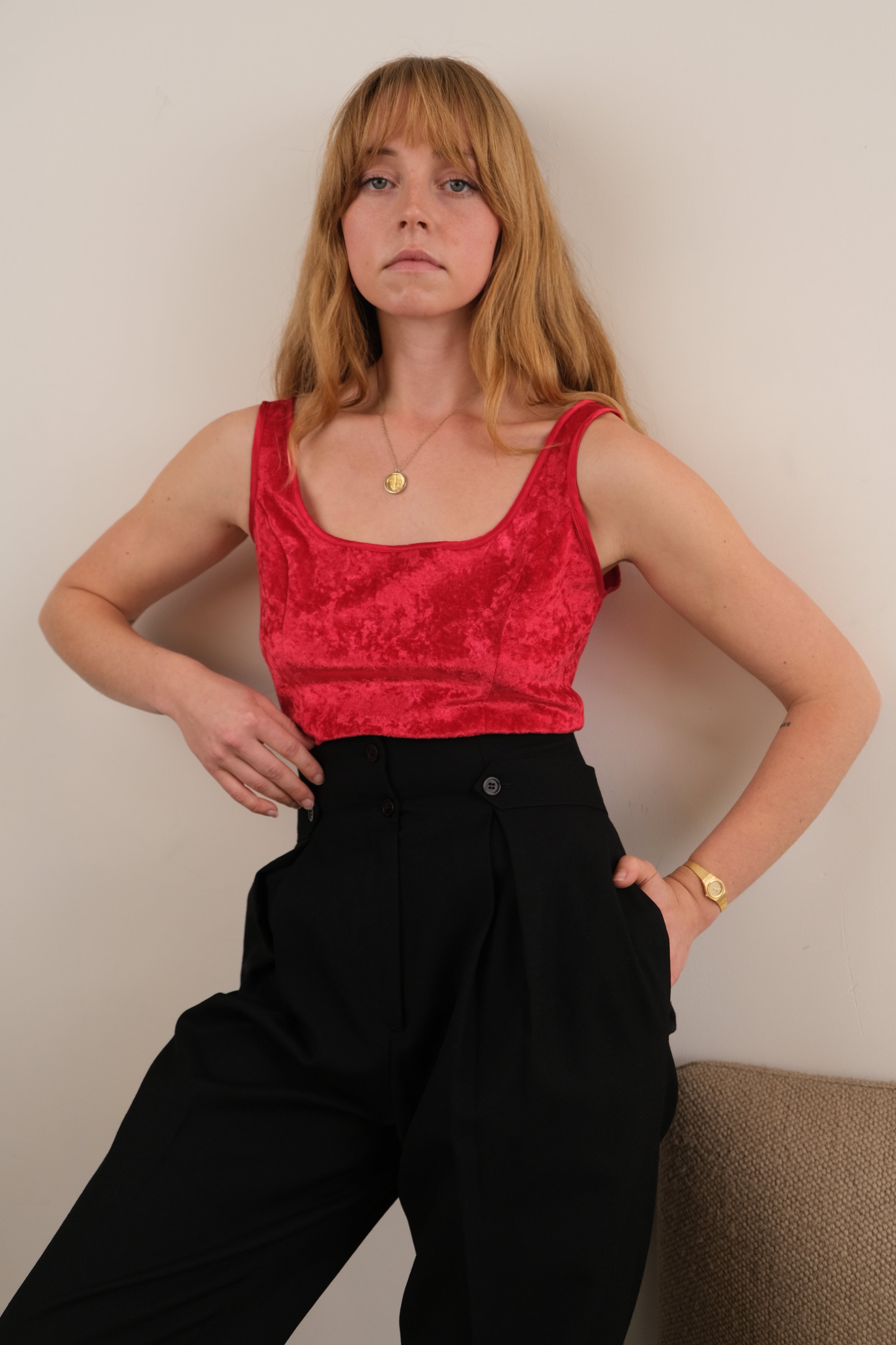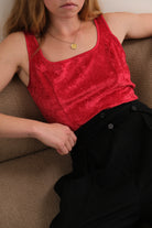 In vibrant red poly velvet, this tank top has a soft, plush feel with a subtle sheen. Cut with a wide scoop neckline and clean, fitted seams through the bodice, it wears smooth under layers and tucks neatly into high-rise bottoms.