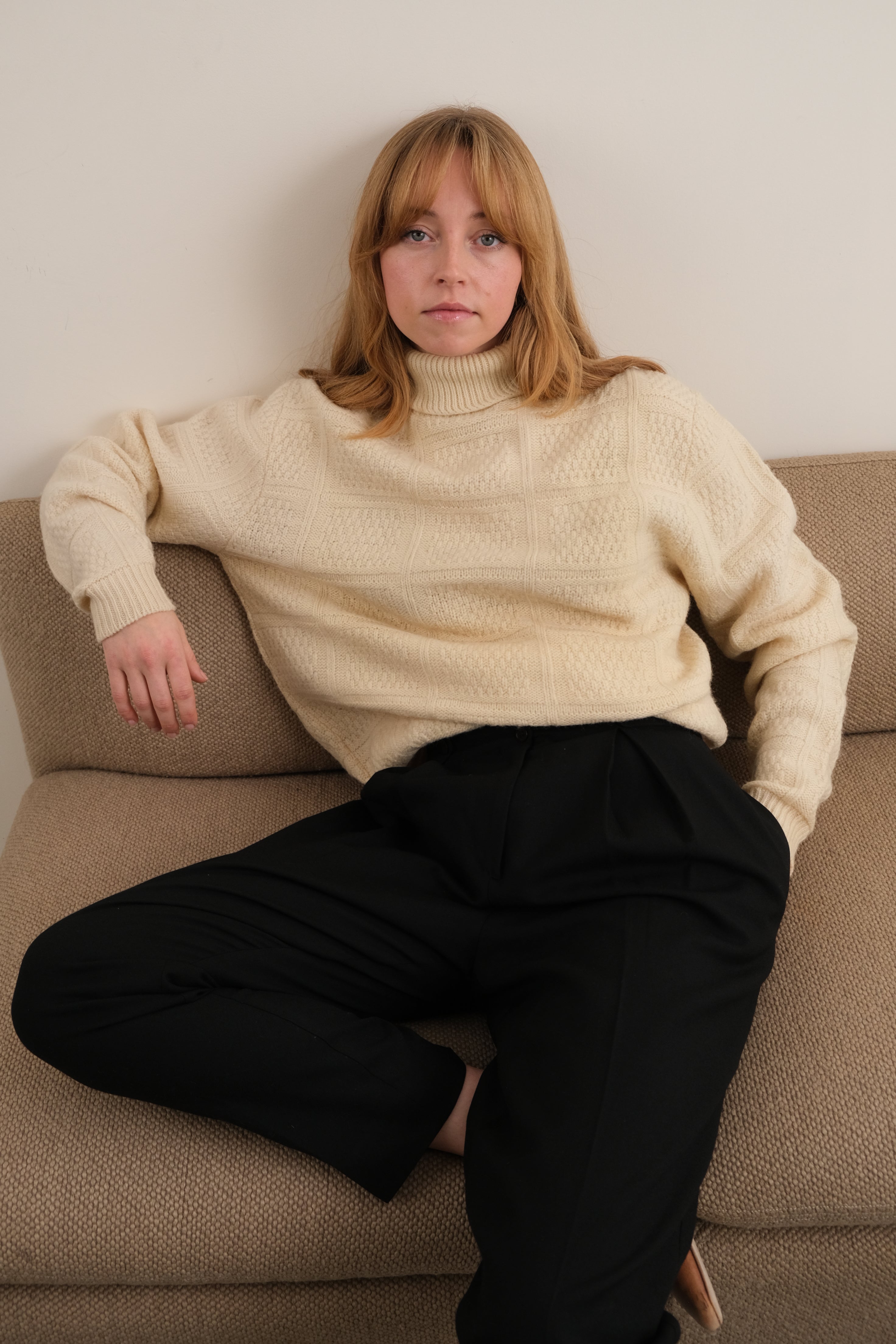 In creamy white virgin wool, this sweater feels dense, warm, and softly textured, with a substantial knit that reads refined rather than bulky. Designed with a ribbed turtleneck collar, long sleeves, and a geometric basket-style knit pattern throughout, it sits with a relaxed, gently structured shape.