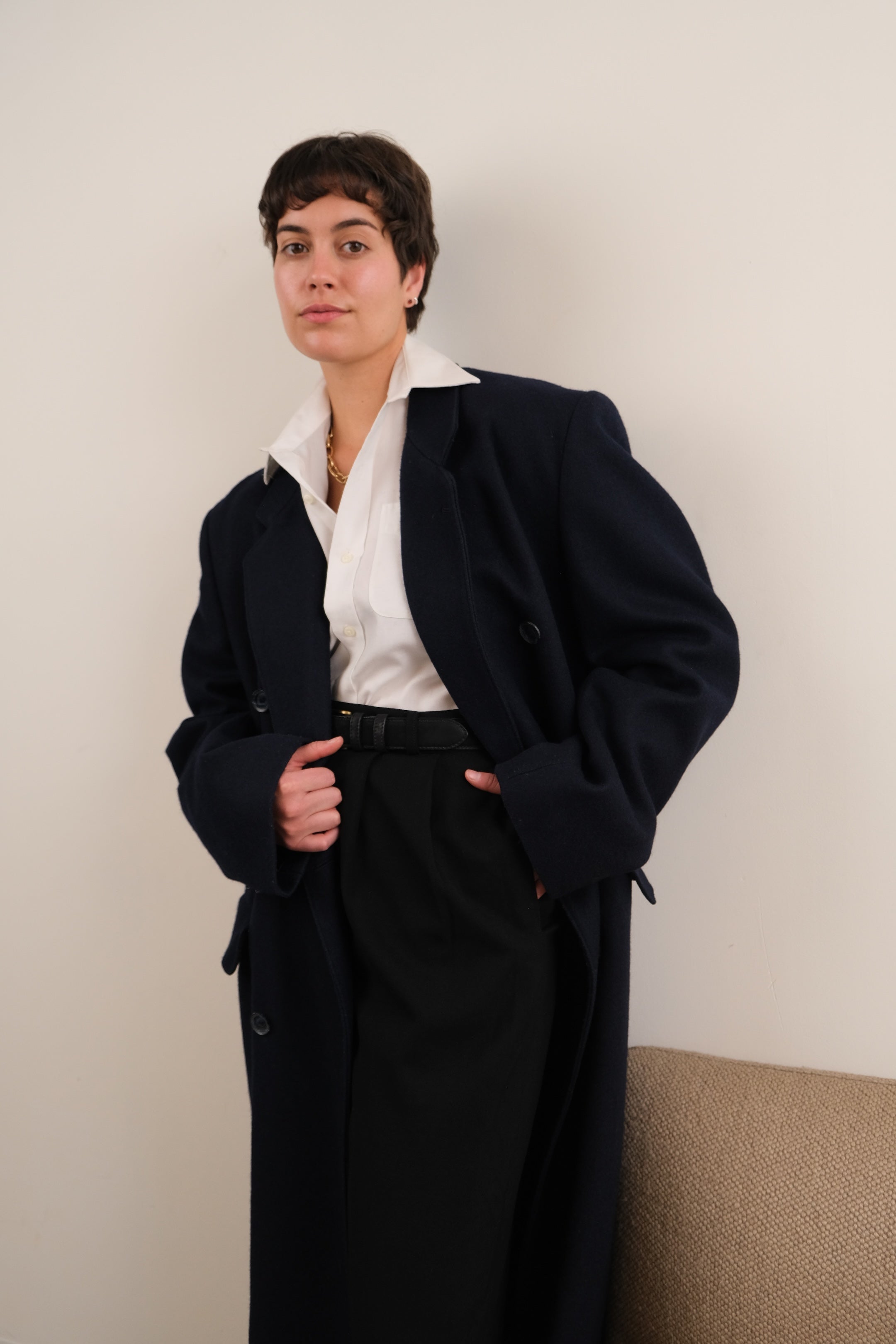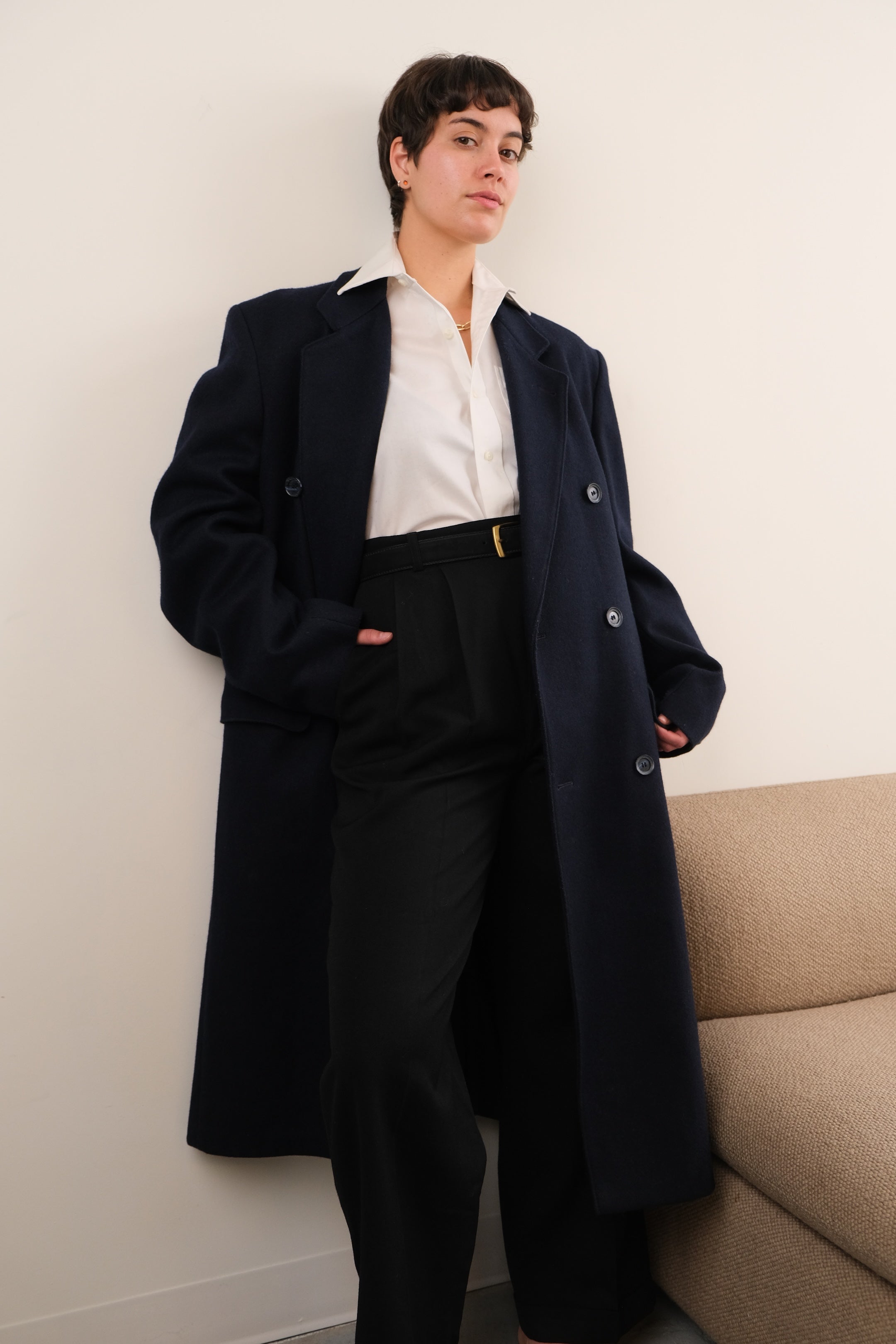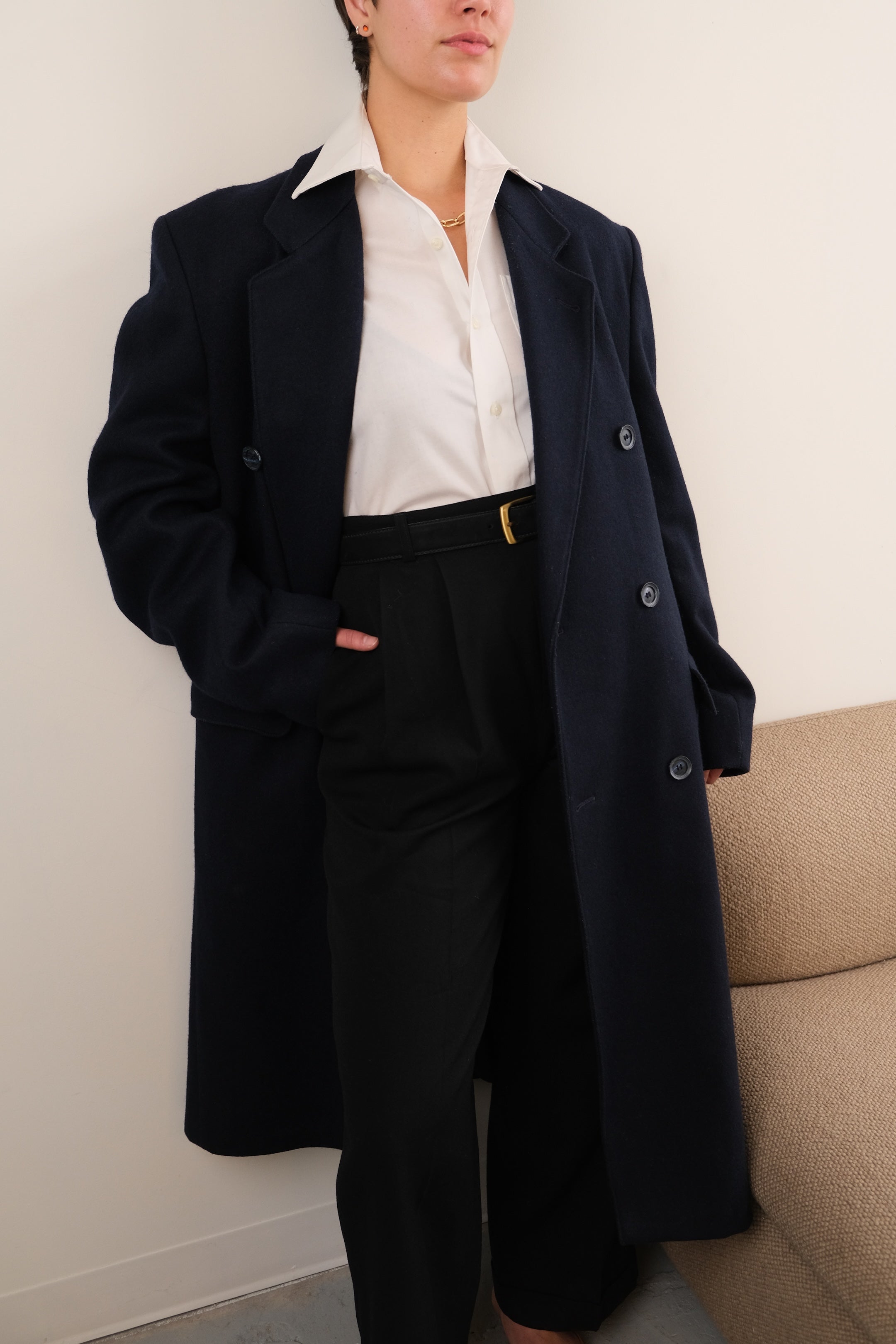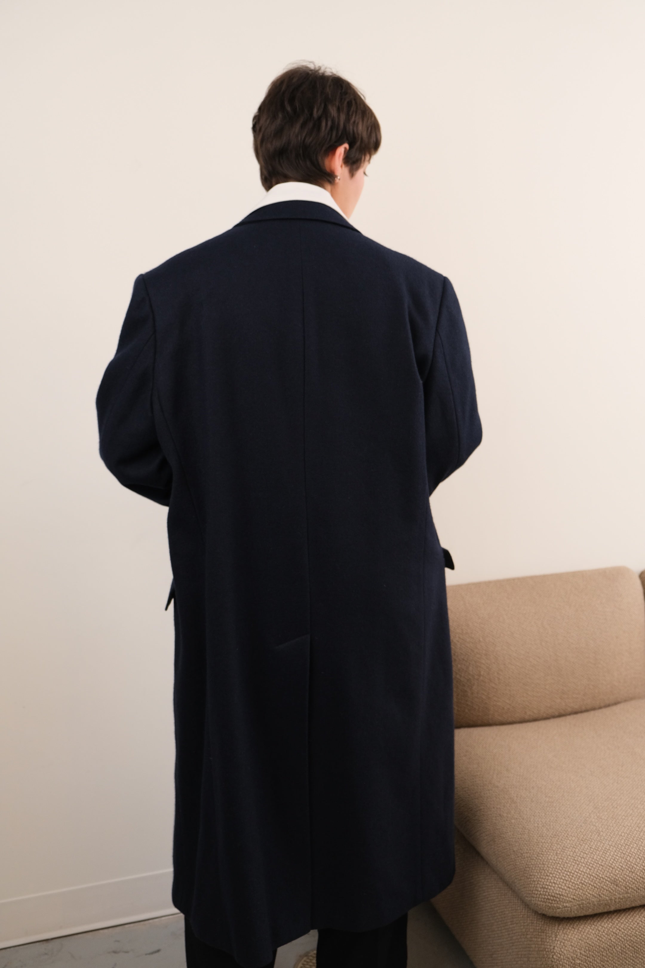 In deep navy wool blend, this coat feels weighty and structured, with a smooth, matte surface that reads sharp and tailored. Cut with a double breasted front and flapped pockets, it carries a long, clean line through the body with a composed, traditional silhouette.