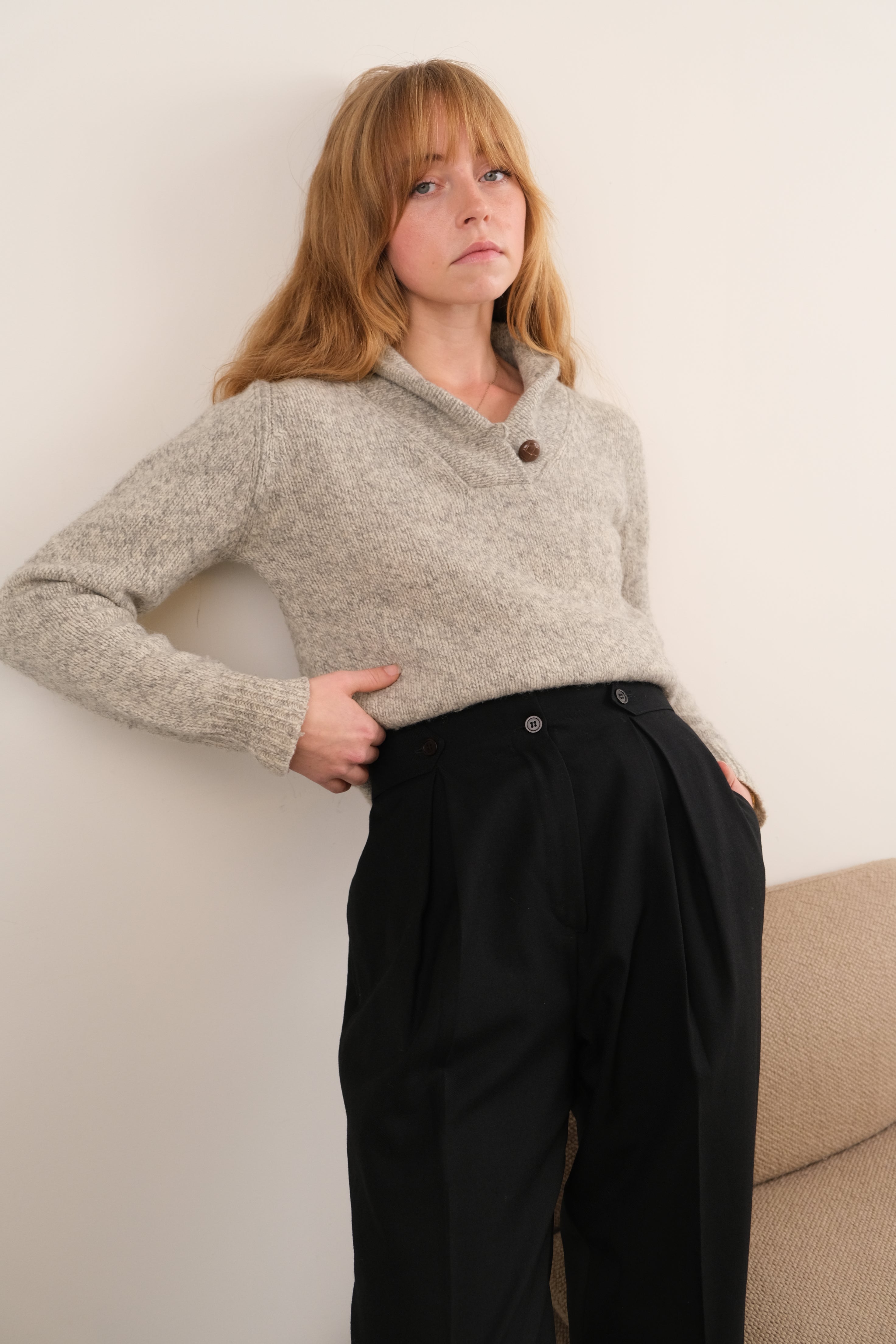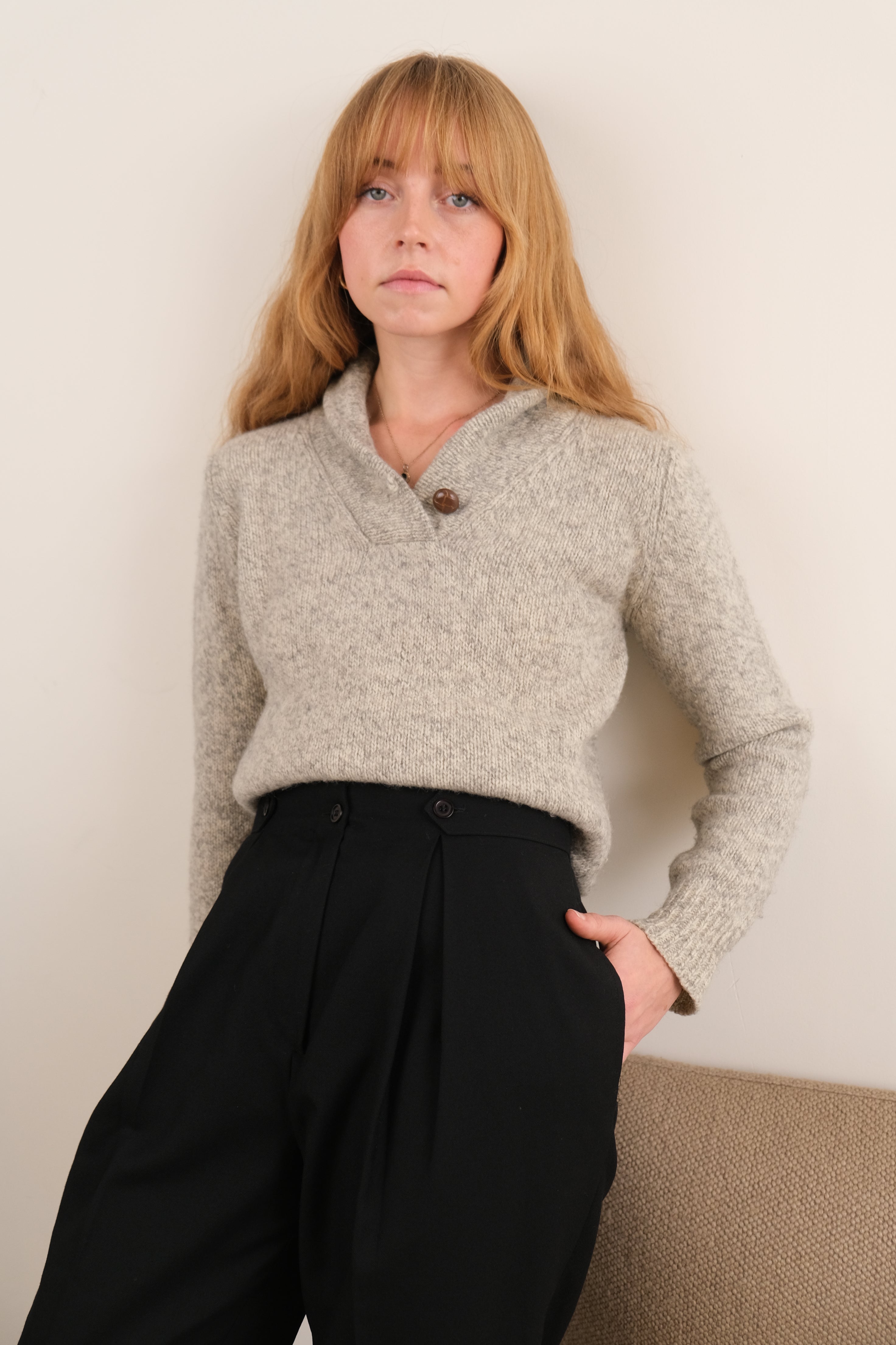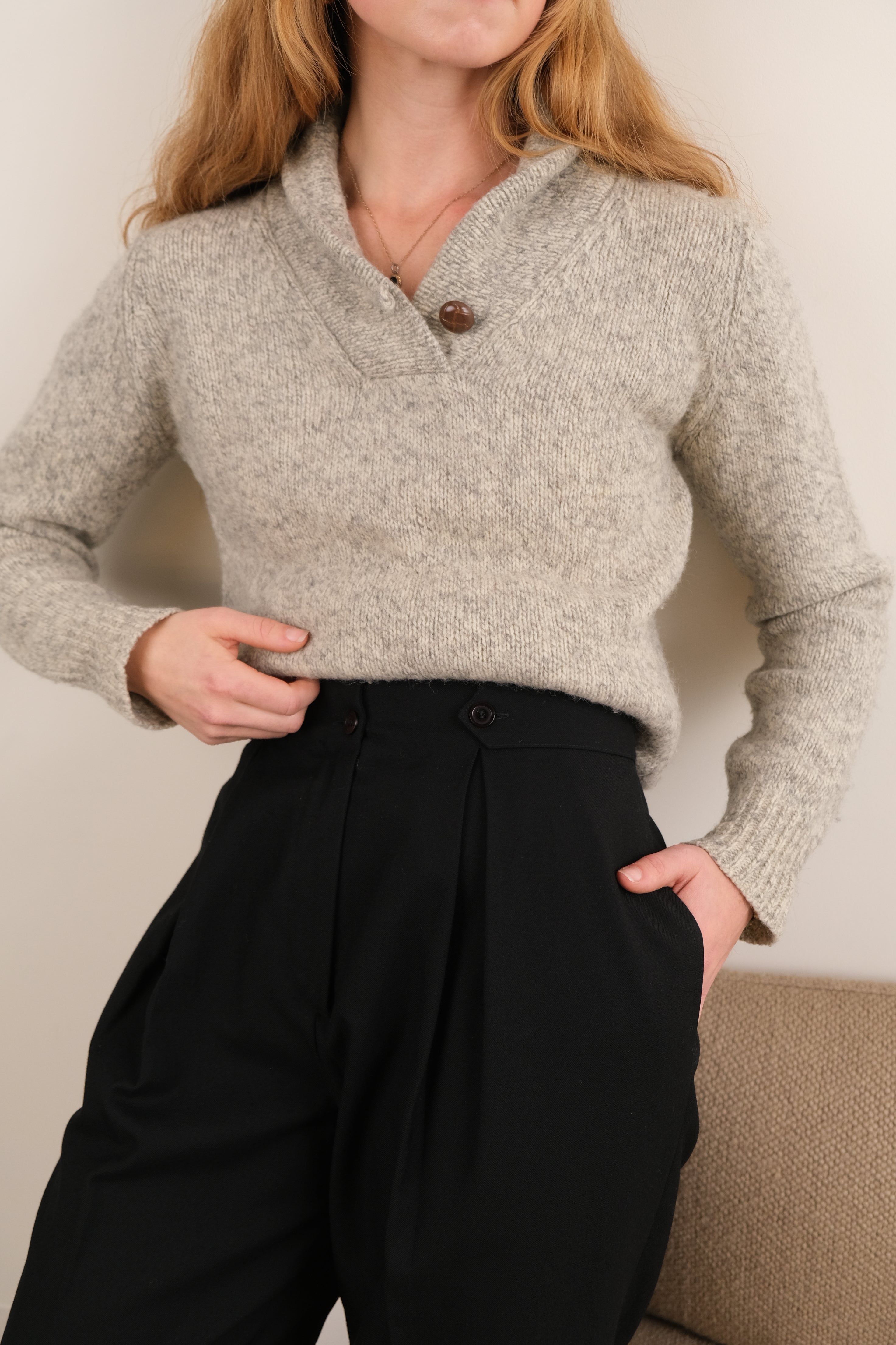In heathered gray wool and nylon, this sweater has a warm, softly textured feel with a comfy and gentle structure. The deep shawl neckline is finished with a single wooden button, giving the piece a clean, easy silhouette.