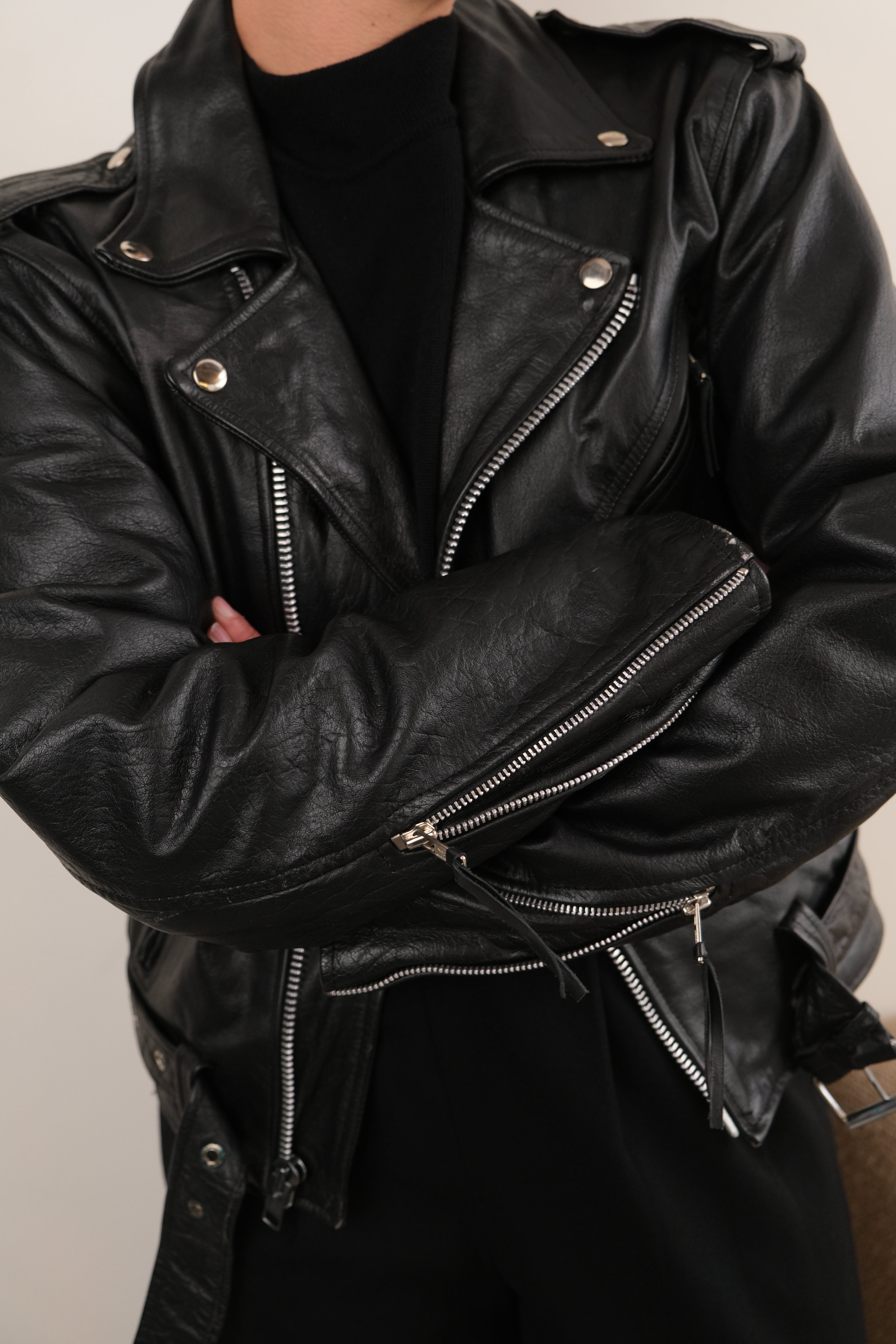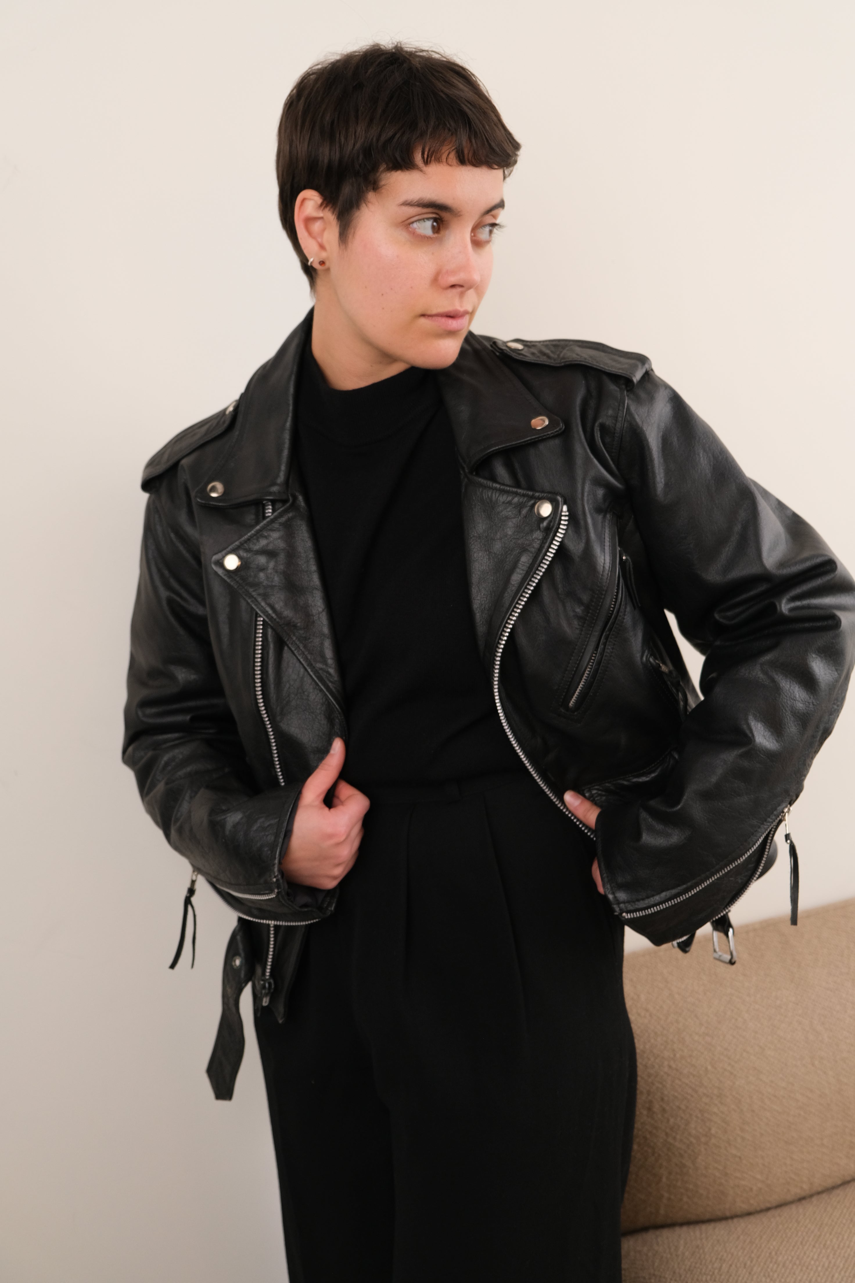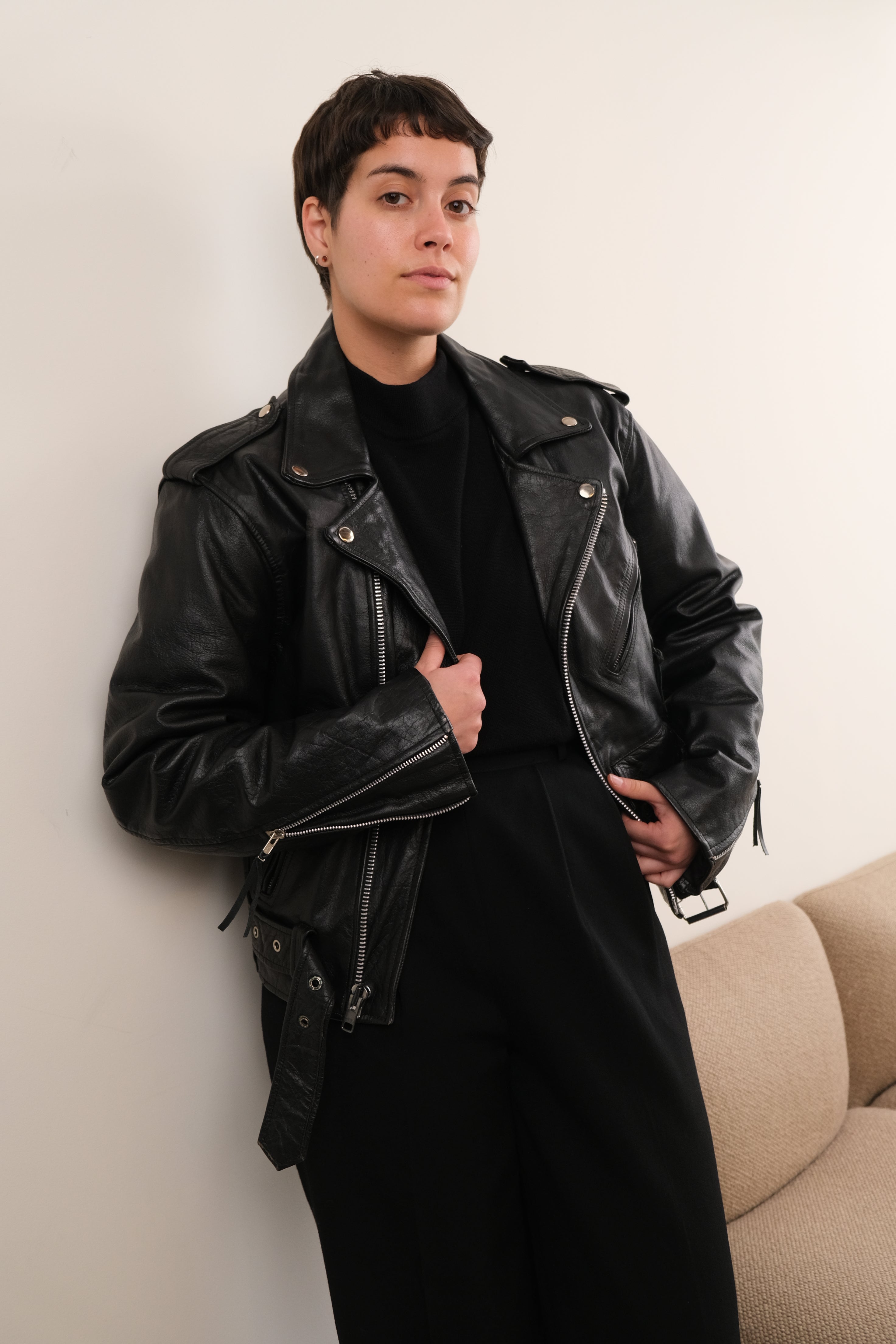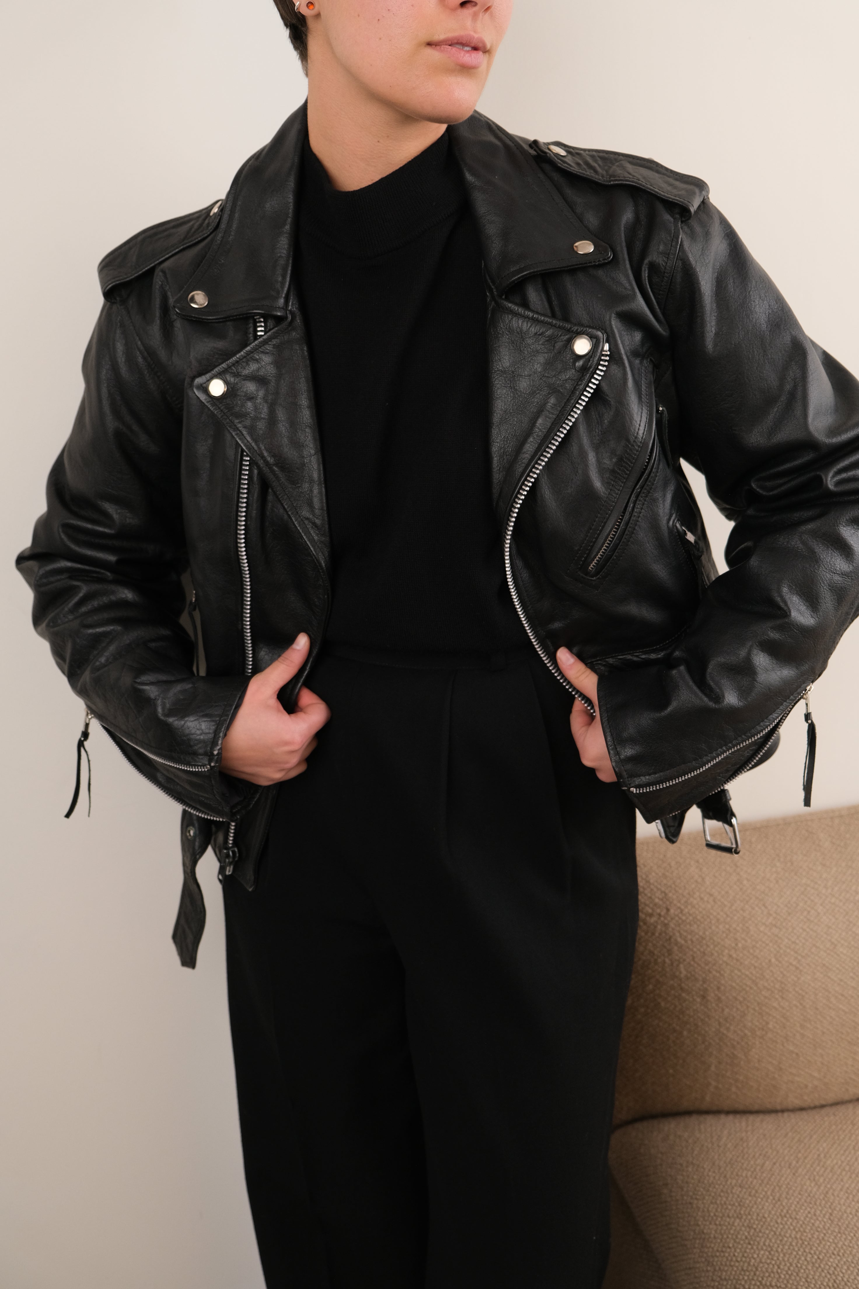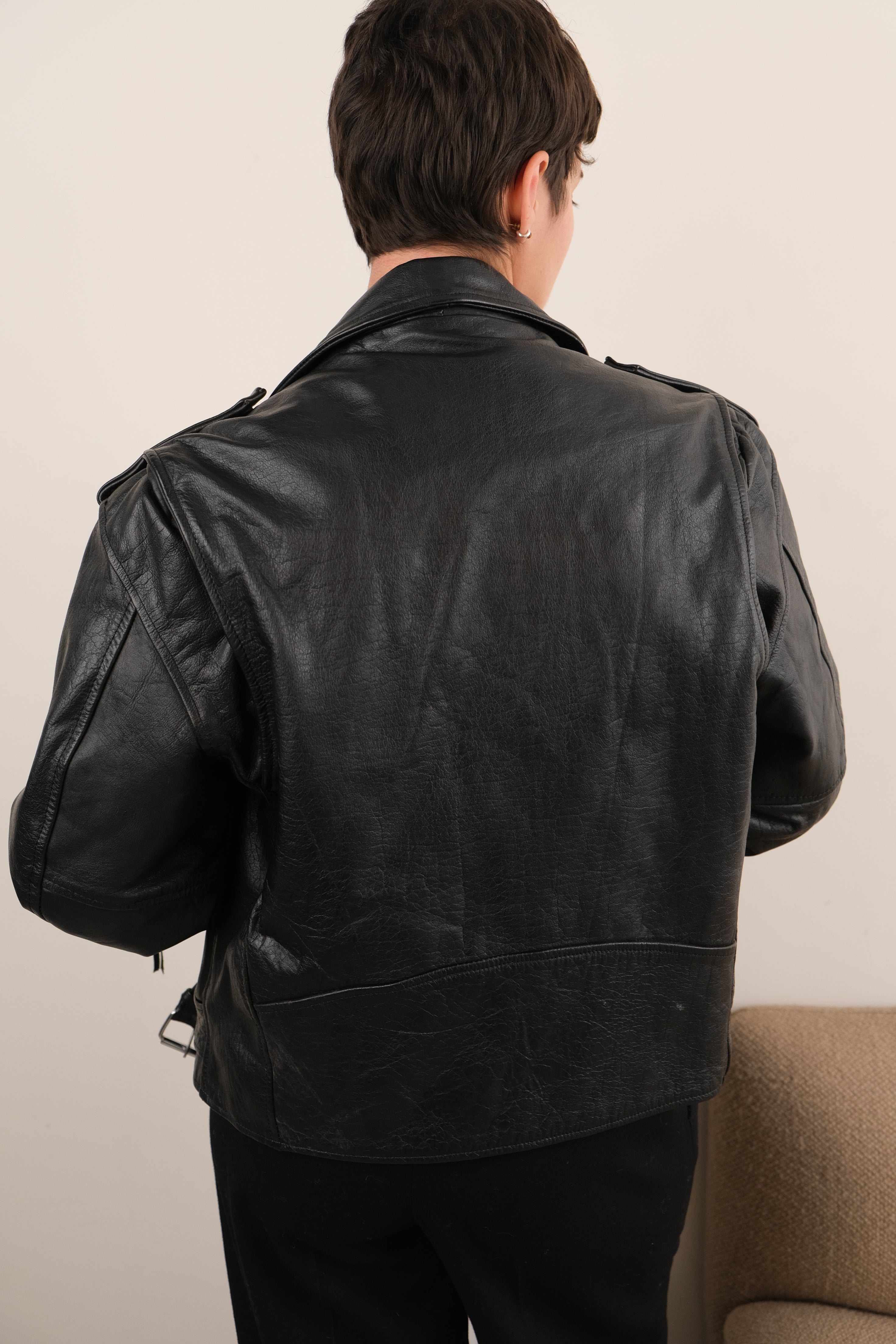 In black leather, this jacket feels weighty and lightly structured, with a smooth surface that has broken in naturally over time. Cut in a classic café racer silhouette, it features an asymmetrical zip front, wide notched lapels, zippered sleeves, and multiple zip pockets that give the piece a sharp, utilitarian edge. Subtle creasing and patina throughout the leather reflect wear consistent with age and are reflected in the price.