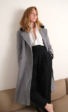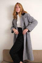 In light gray 80% wool and 20% nylon, this coat has a dense, softly brushed texture with a structured drape. It features a black velvet collar, double-breasted front with tonal buttons, flap pockets, and a back half-belt detail with button closure. Fully lined in gray satin for ease and durability, the silhouette falls straight through the body with clean seams that contour the frame. Its quietly tailored shape and contrasting collar lend the piece a composed, timeless character emblematic of 1980s American outerwear.