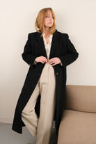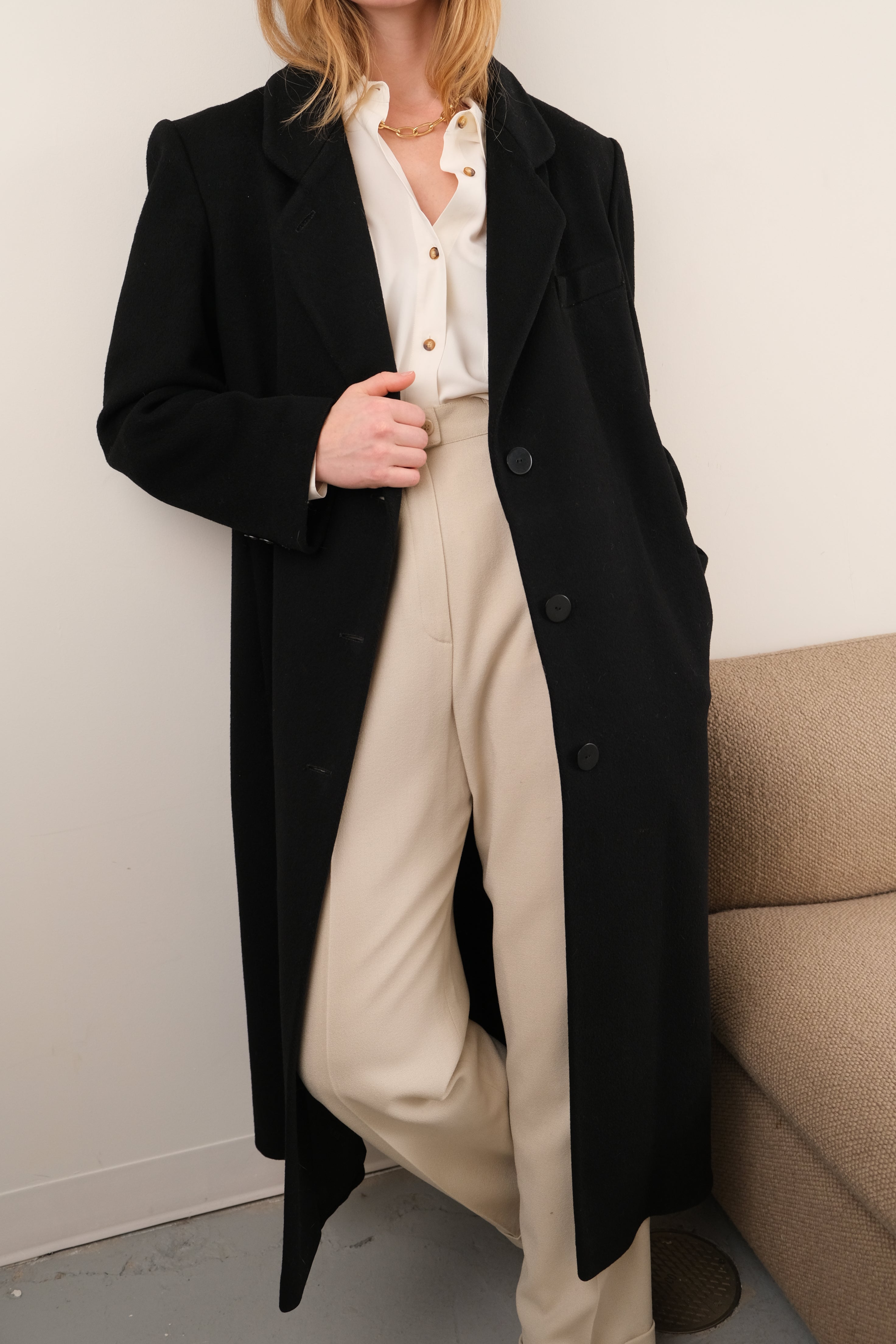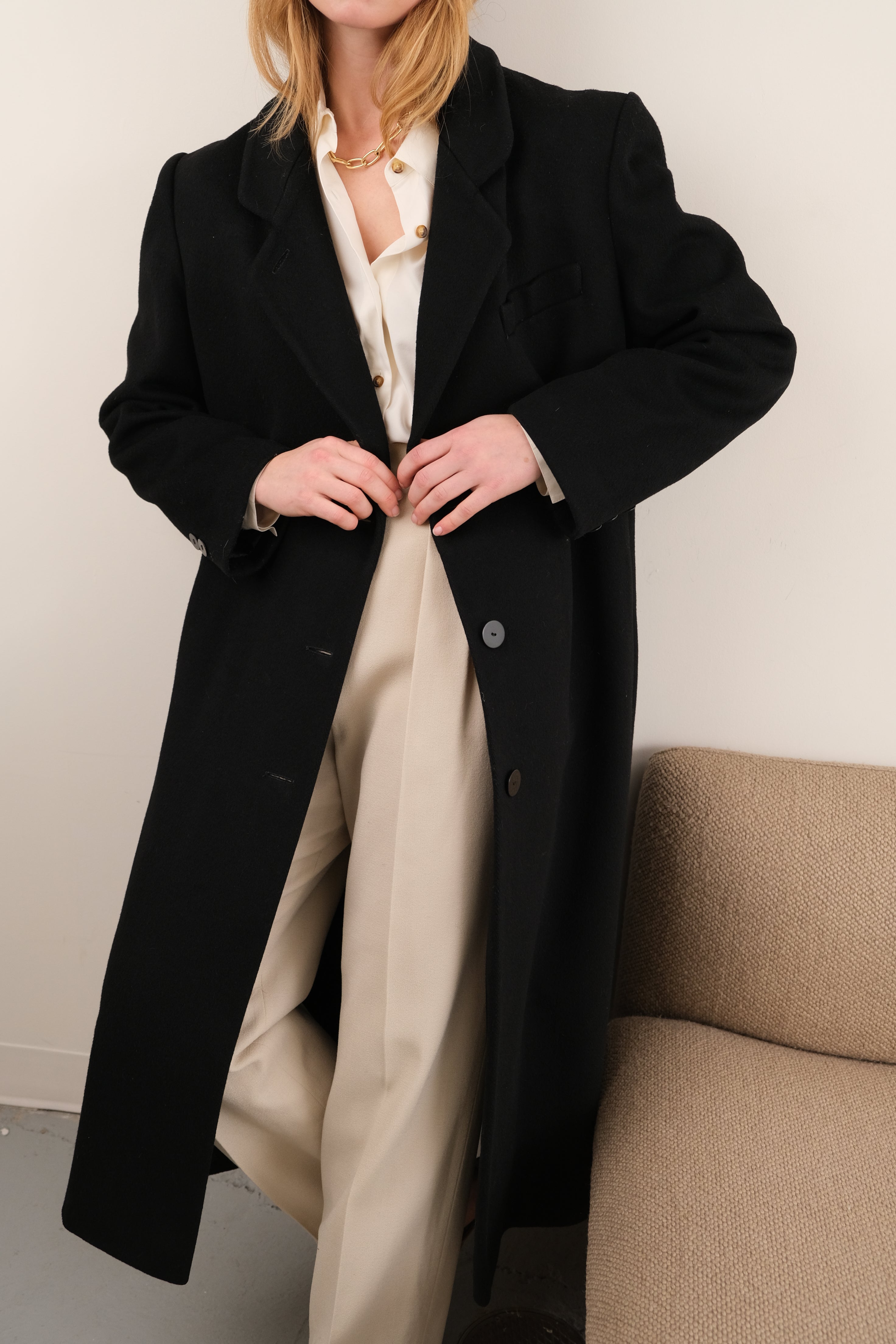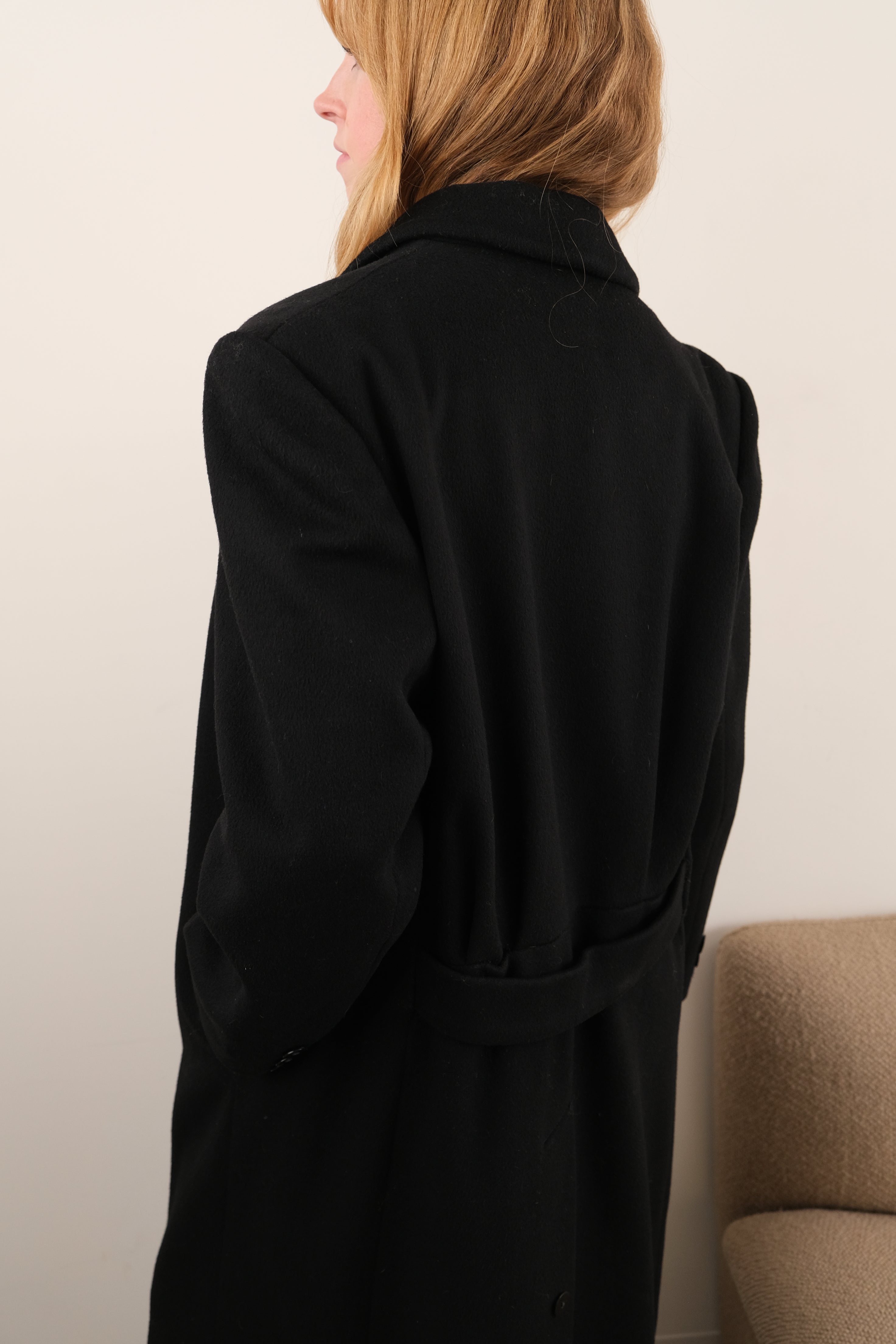 In deep black wool, this coat has a dense, structured hand with a soft matte finish that reads timeless and understated. The silhouette is tailored yet restrained, featuring a notched lapel, single-breasted button front, and a longline length that falls below the knee. A self-fabric back belt subtly defines the waist, adding shape without breaking the clean vertical lines of the coat. Set-in sleeves and precise seaming through the back reflect careful construction.