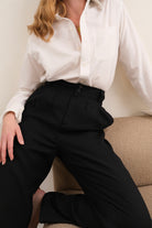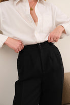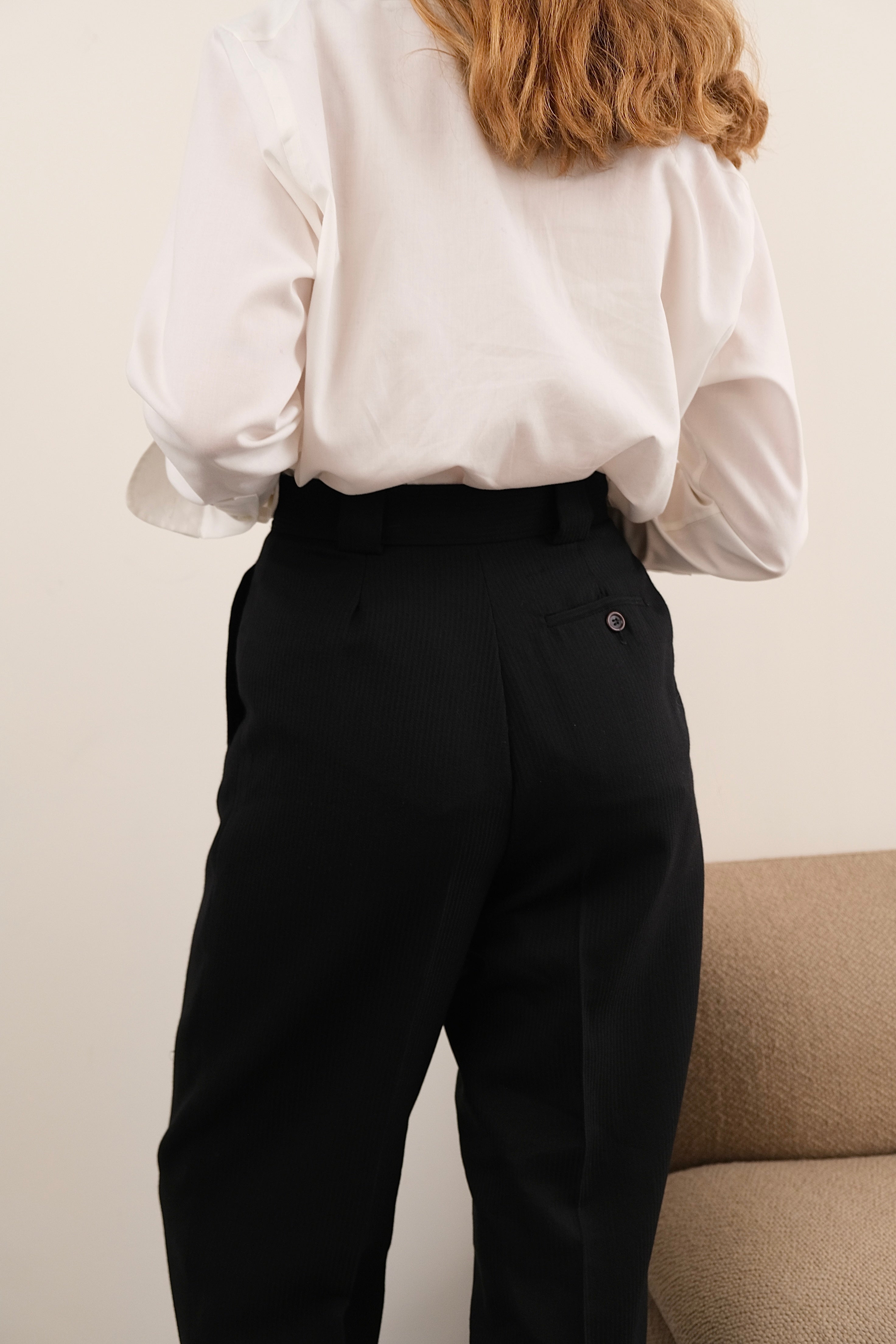 In black pure wool, these trousers offer a soft yet structured drape with a subtle diagonal twill texture. Designed with double front pleats, button tab waistband, and a straight leg, they evoke tailored precision characteristic of Giorgio Sant’Angelo’s late 1980s work. Fully lined through the upper leg for smooth comfort.