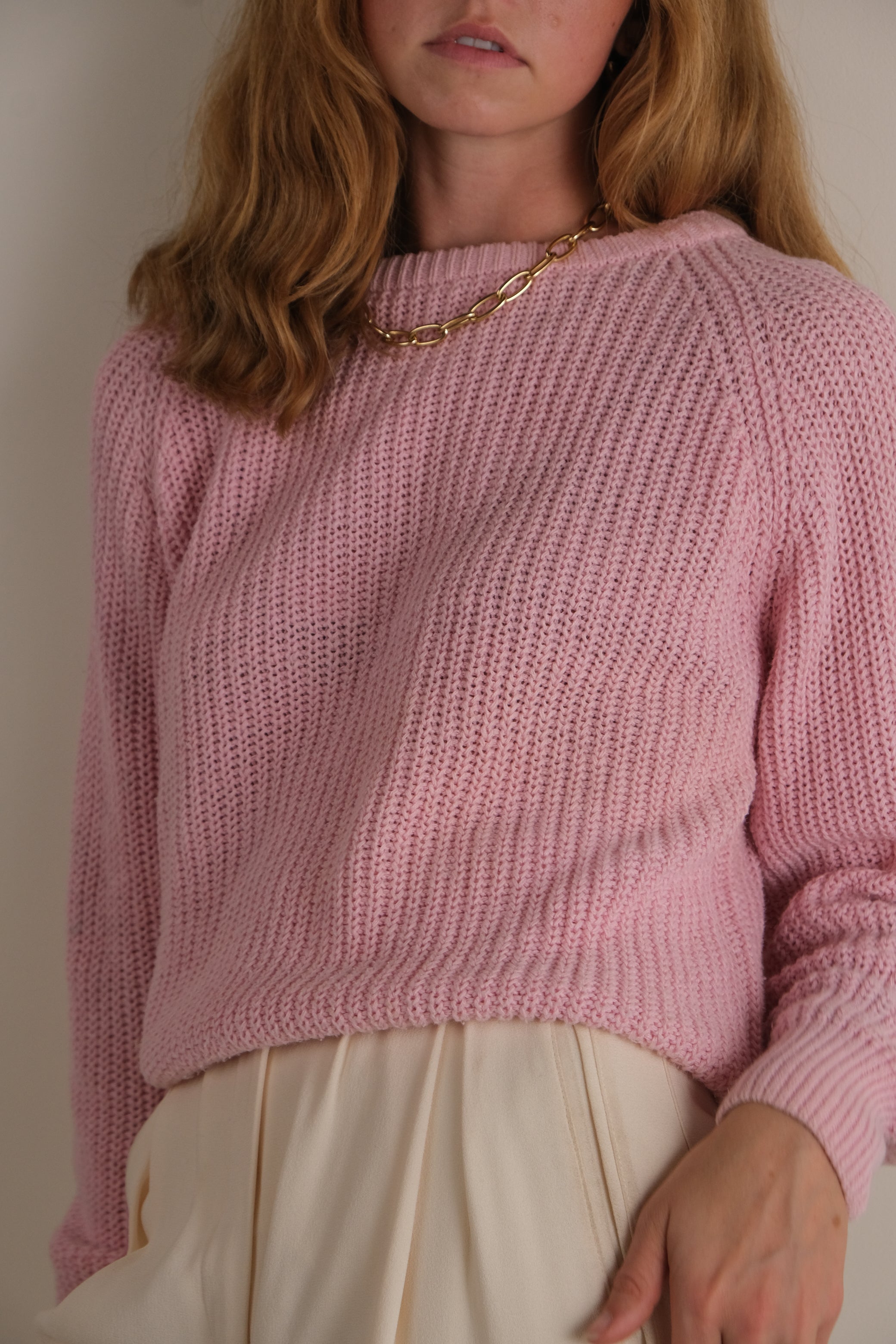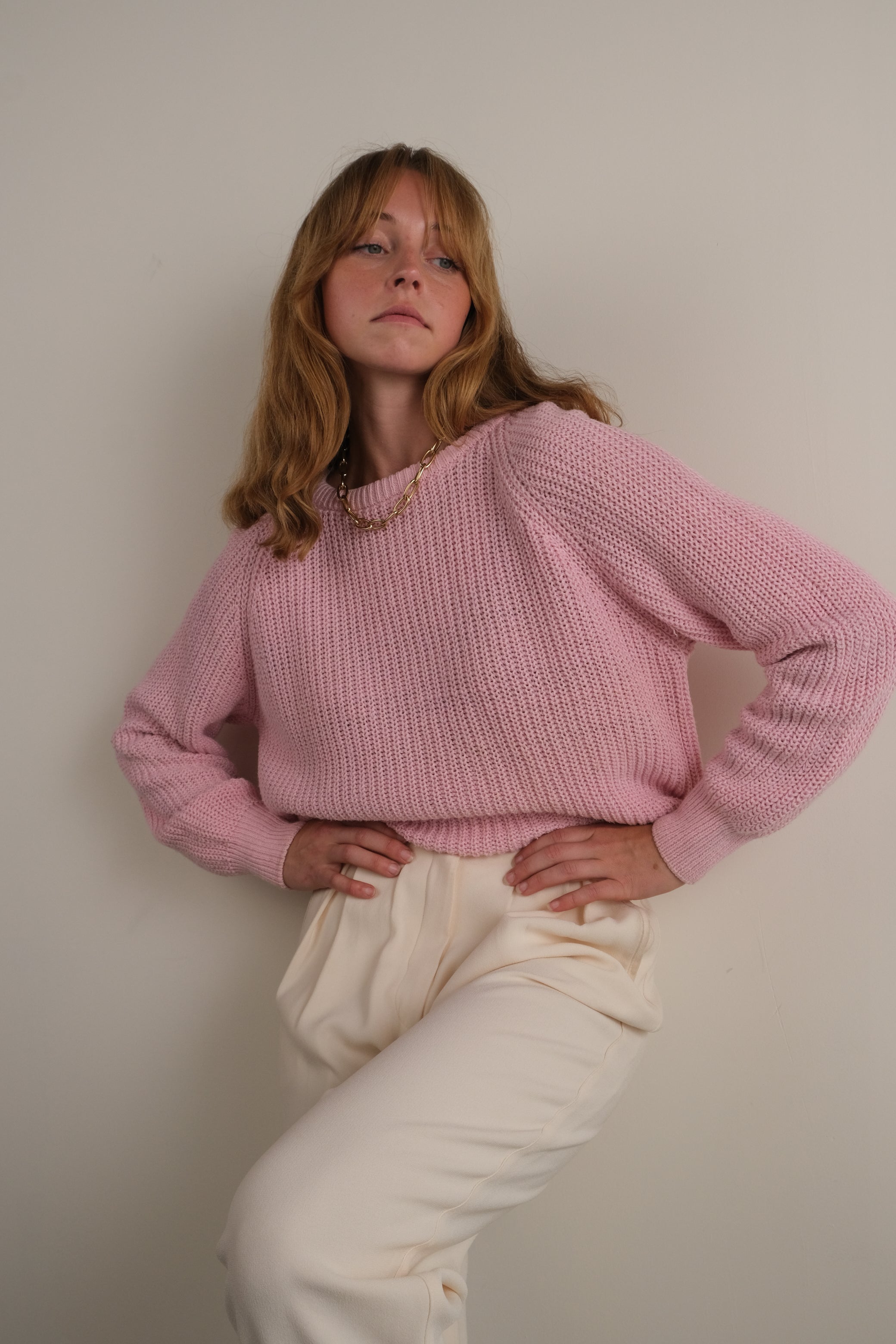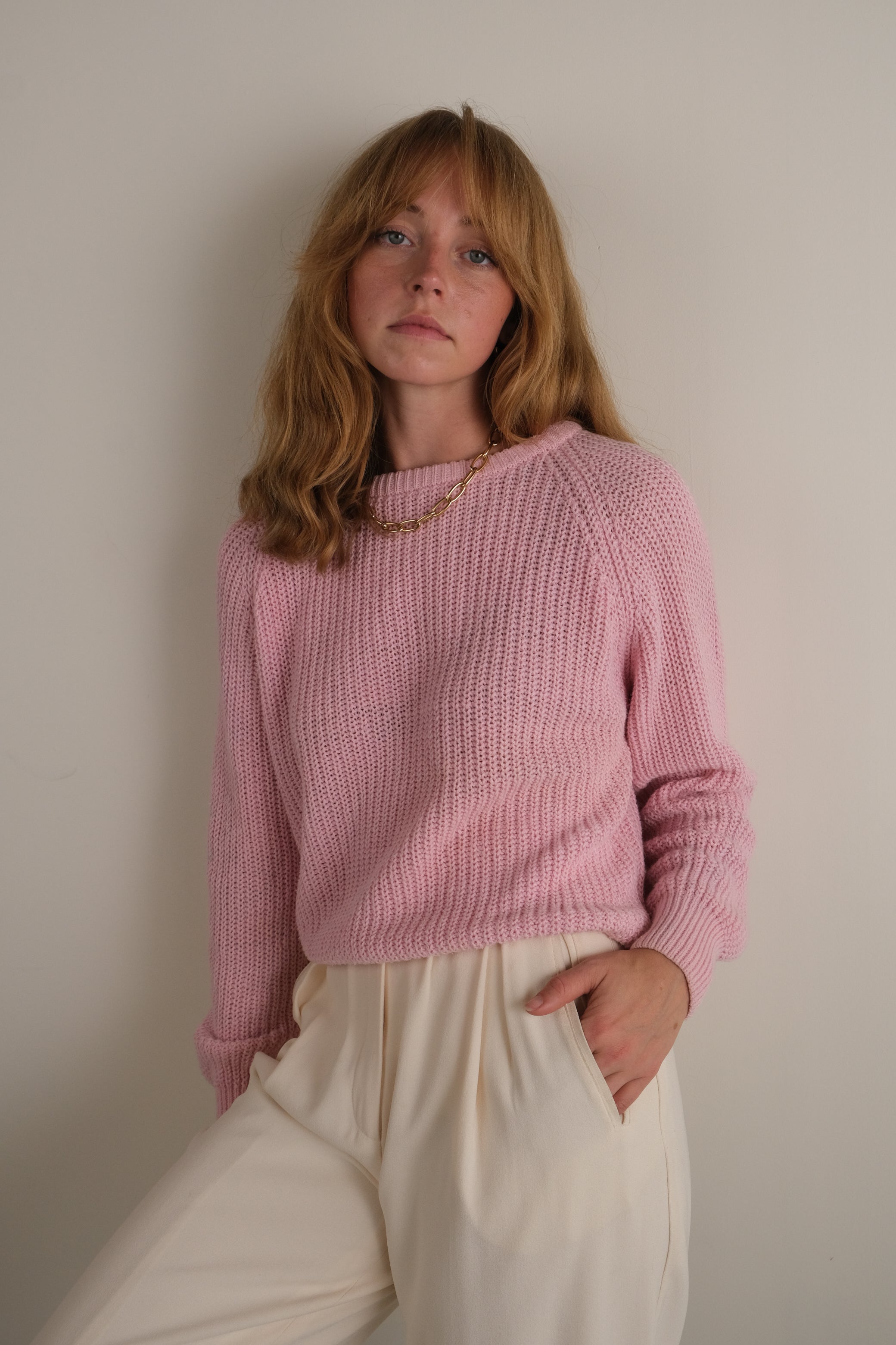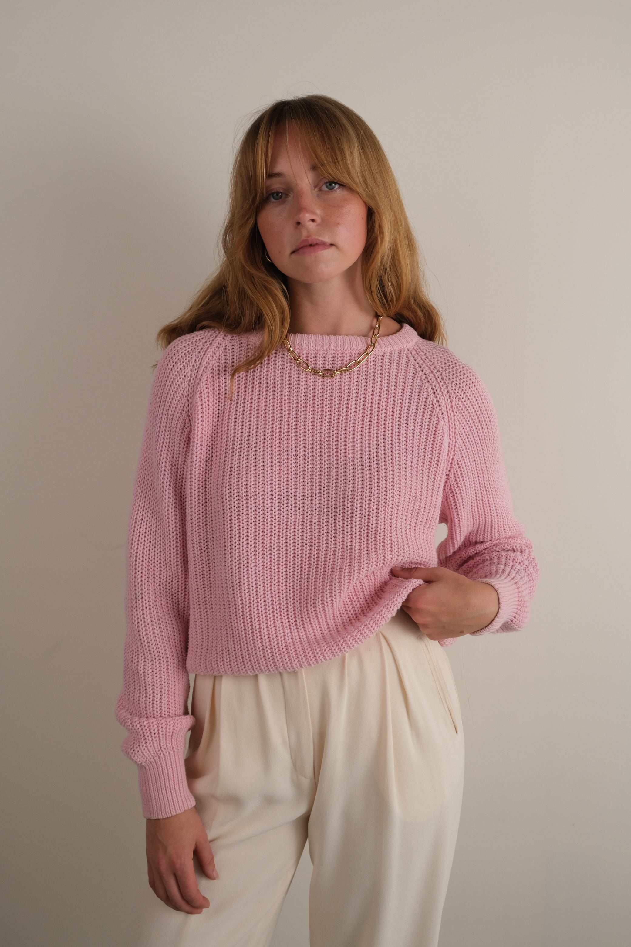 Knitted in a soft pink hue, this sweater combines the natural drape of ramie with the supple comfort of cotton. The chunky gauge texture gives it an inviting weight and tactile surface, while the cropped silhouette and raglan sleeve shape lend it ease and movement. Finished with wide ribbing at the cuffs, collar, and hem, it channels the easy, sport-inspired knitwear of the late 1980s with a quietly romantic tone. The color sits between blush and shell pink, flattering and soft without excess sweetness.