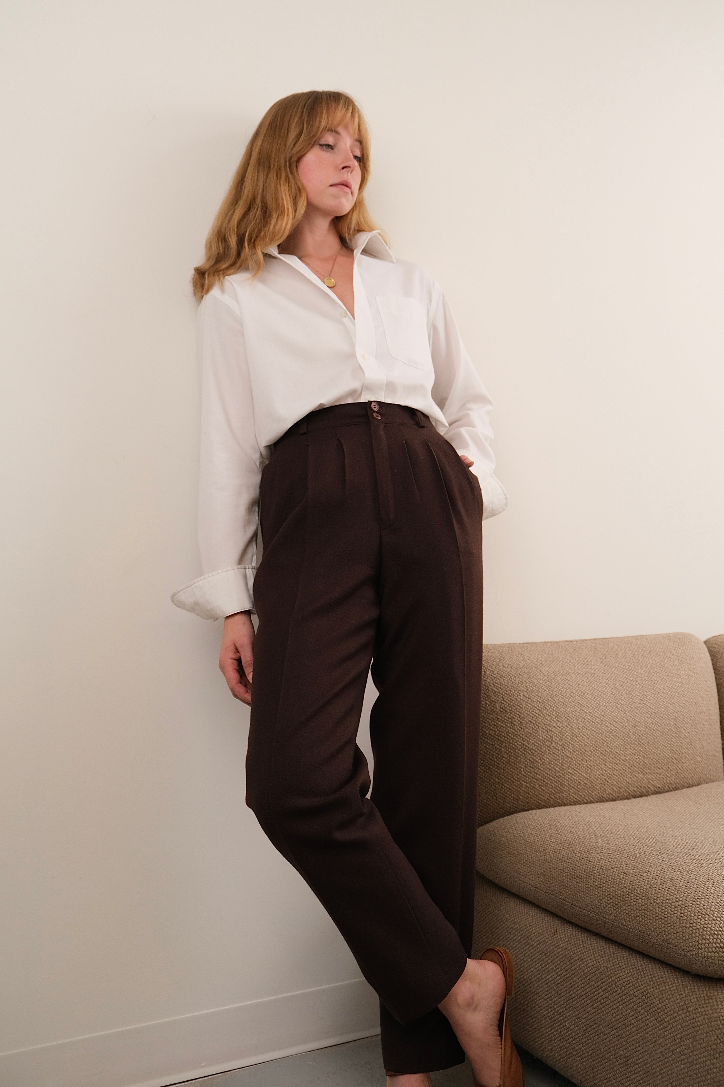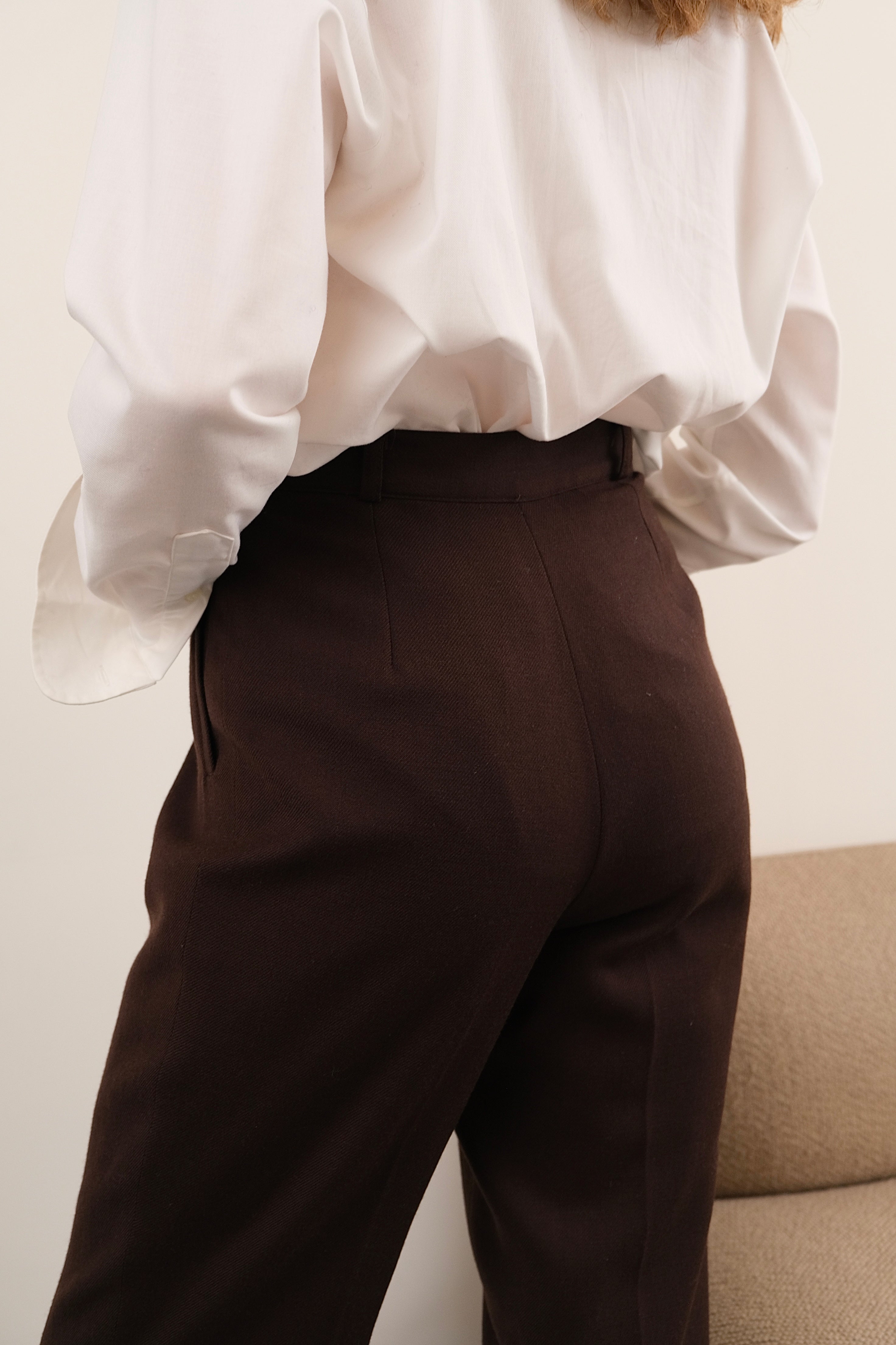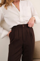 Cut from 100% wool in a deep espresso brown, these trousers drape with softly structured ease—offering both warmth and fluidity. The high-rise waist is defined by double front pleats, belt loops, and a tab-button closure, while the straight leg tapers gently to the hem for a refined finish. Side pockets complete the design, balancing function with polish. A timeless tailored silhouette that channels 90s European officewear into effortless modern styling.