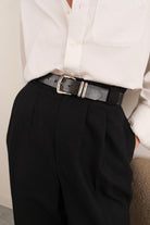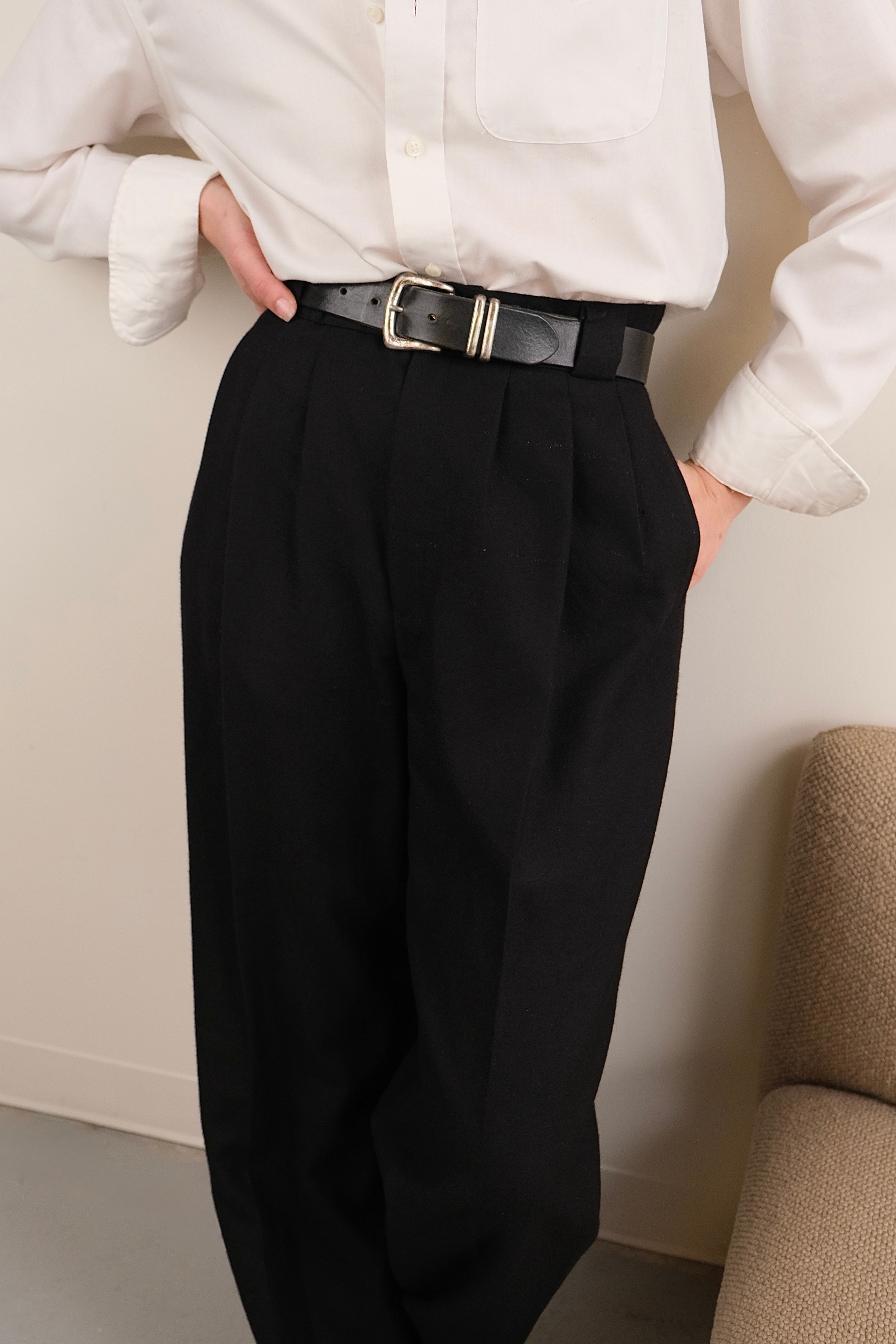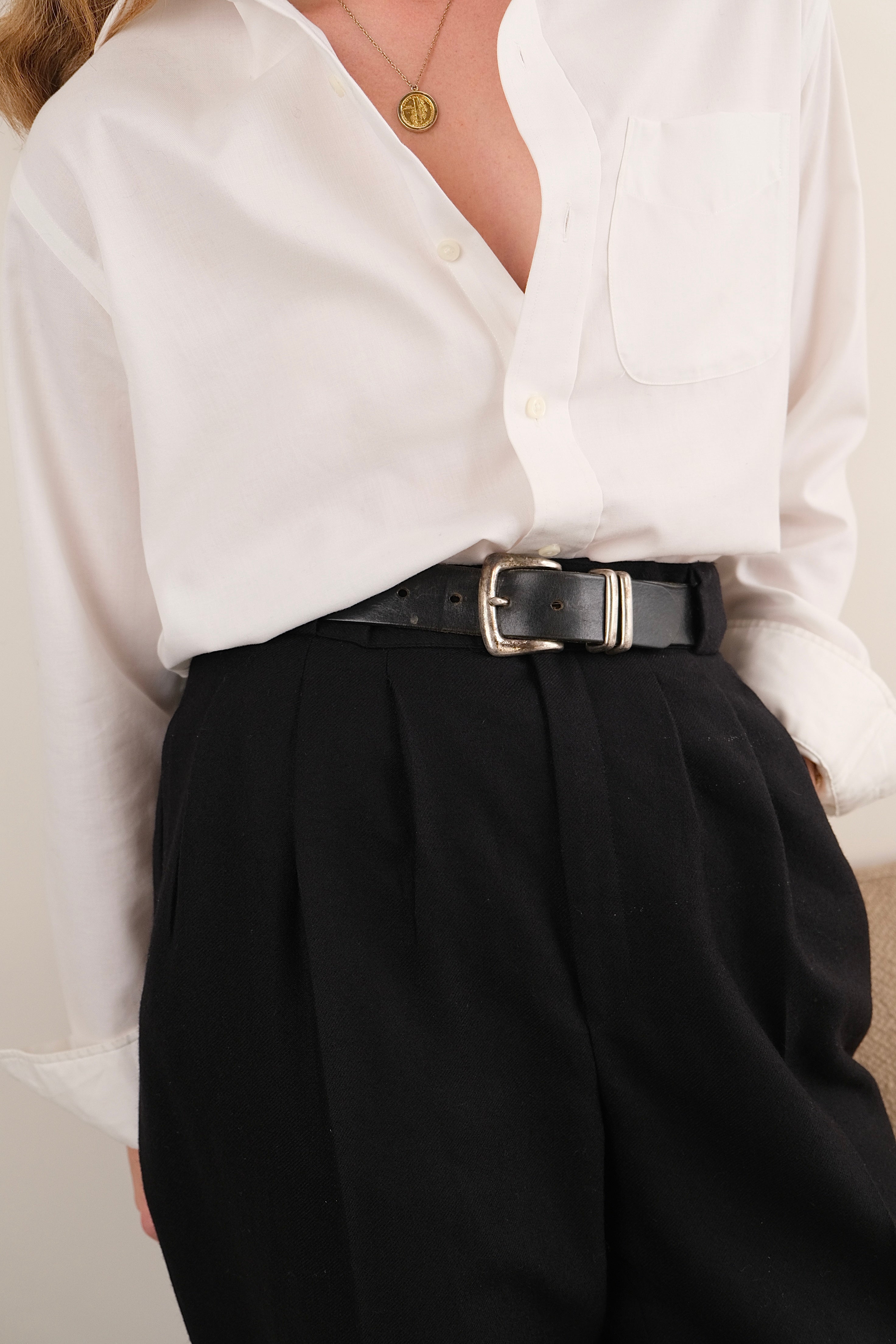 Cut from genuine Italian leather, the belt carries a smooth, slightly broken-in surface with a soft yet sturdy hand. The silver-tone buckle and twin keepers lend a 90s edge, while the slim profile keeps the look refined and versatile. Subtle wear at the hardware adds vintage character without compromising integrity. A minimalist staple that channels 90s American craftsmanship into timeless modern styling.