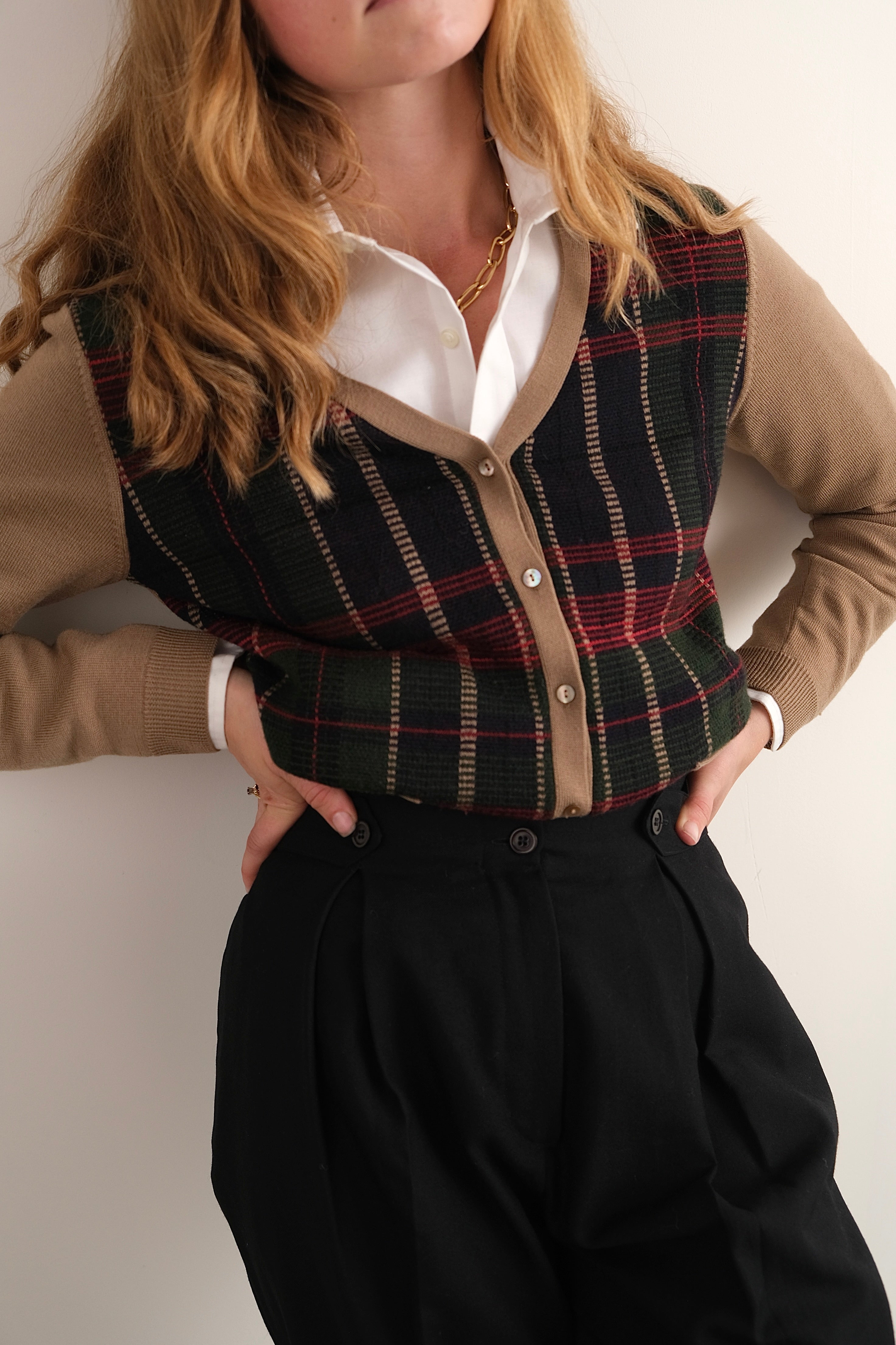 Vintage 90s Brooks Brothers Camel and Tartan Merino Wool Cardigan