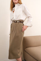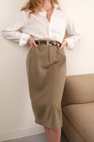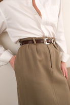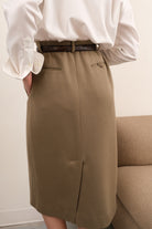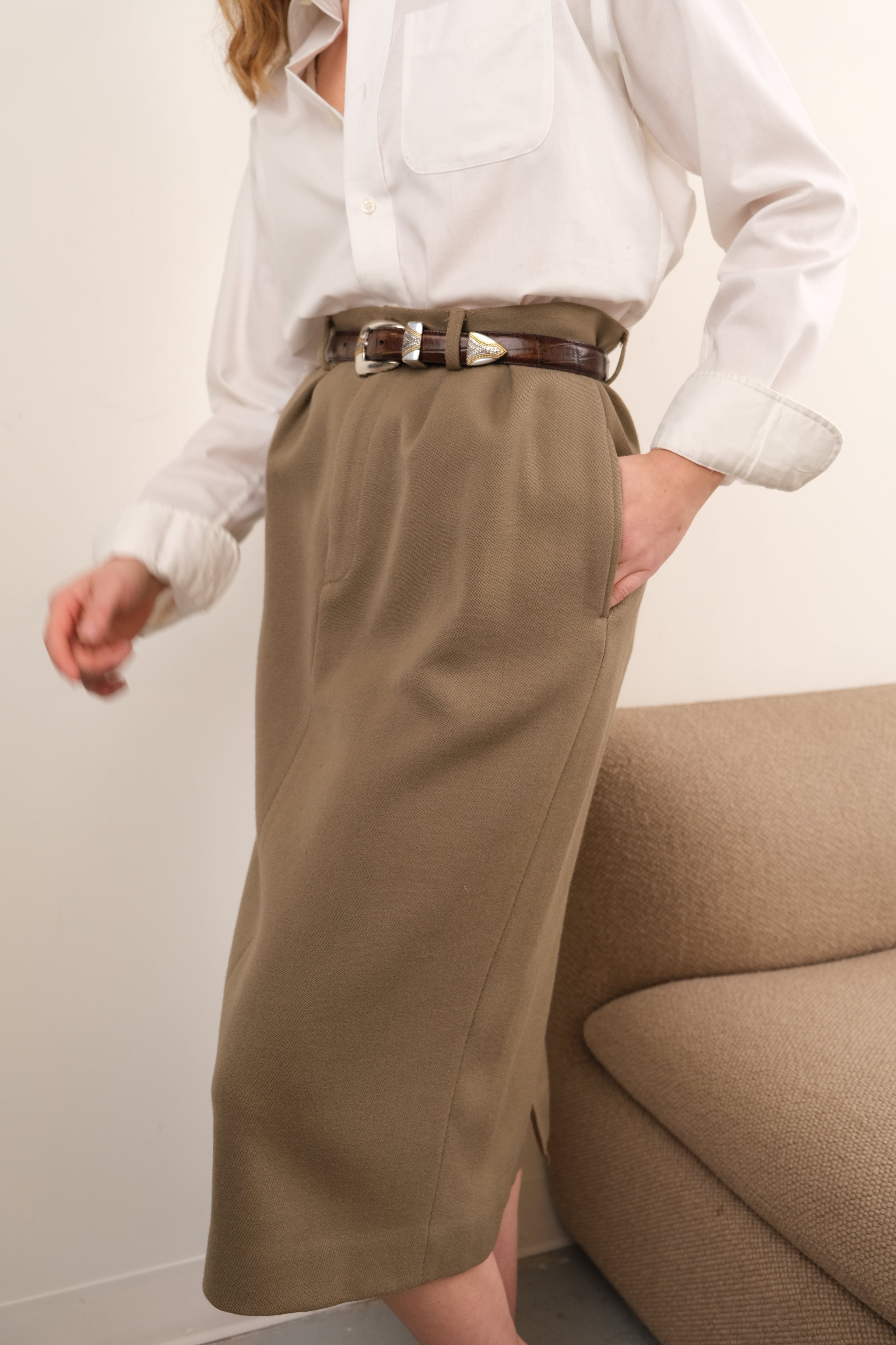 Cut in tan wool with a softly structured, weighty feel, this skirt has a clean surface and a handsome, tailored presence. Designed with a high waist, straight midi-length silhouette, belt loops, and welted back pockets, it closes neatly with a concealed zip and sits smoothly through the hips. A small repaired area near the back hem is present and reflected in the price.