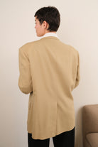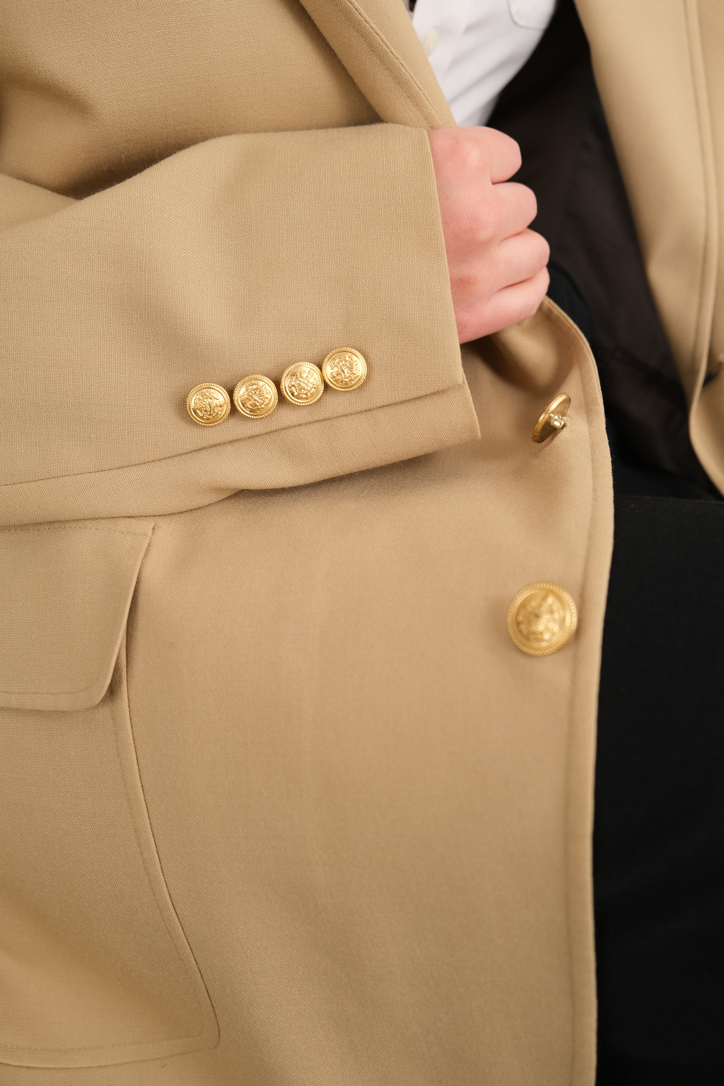 In tan 100% wool fabric, this blazer has a smooth, lightly structured feel with a clean drape through the body. Finished with sharp notch lapels, flap pockets, and gold crest buttons at the front and cuffs, it reads tailored yet easy for oversized styling. Fully lined.