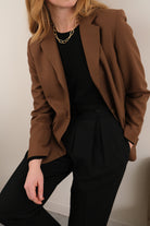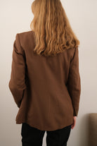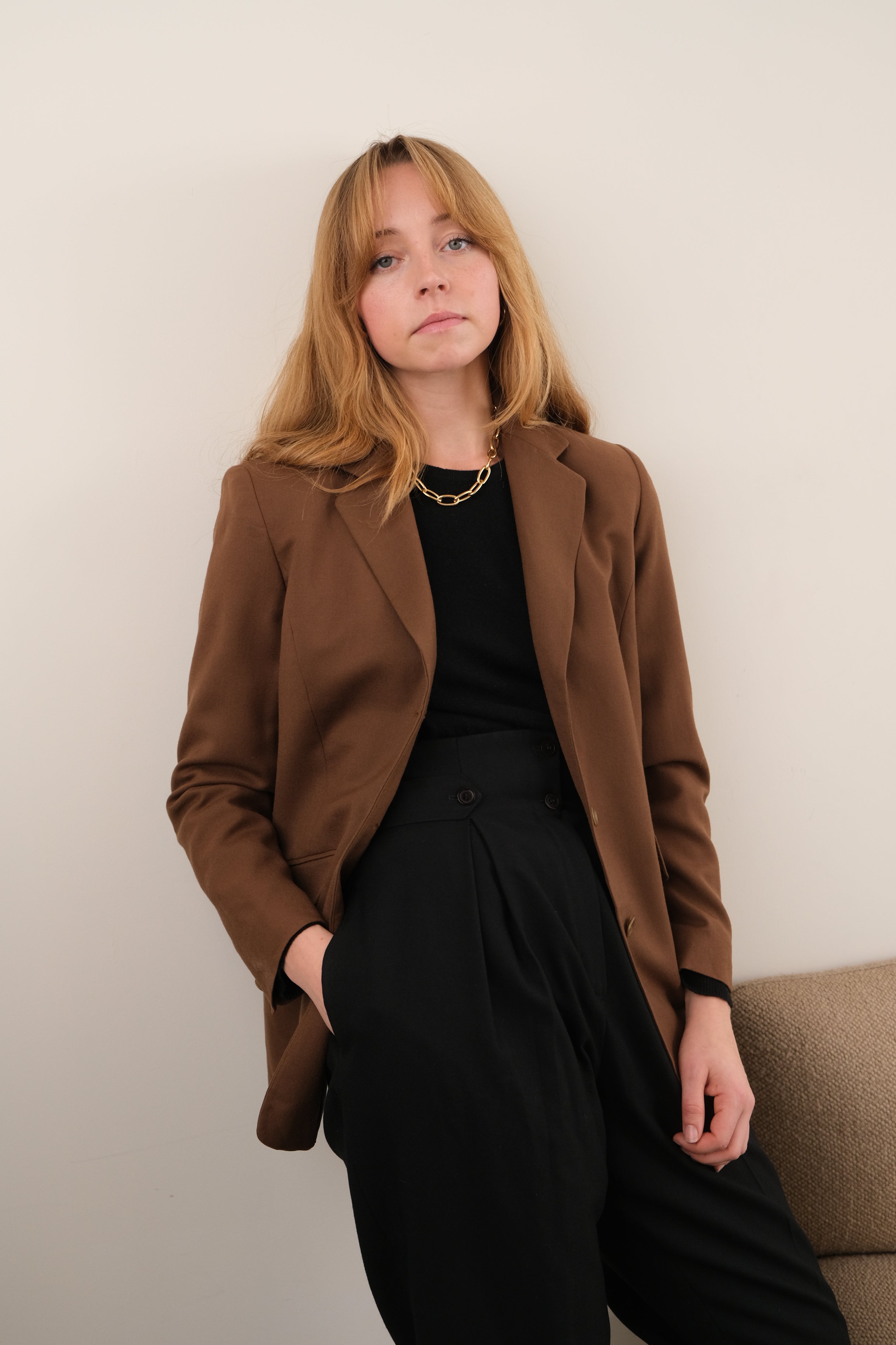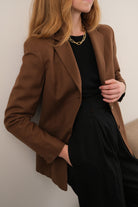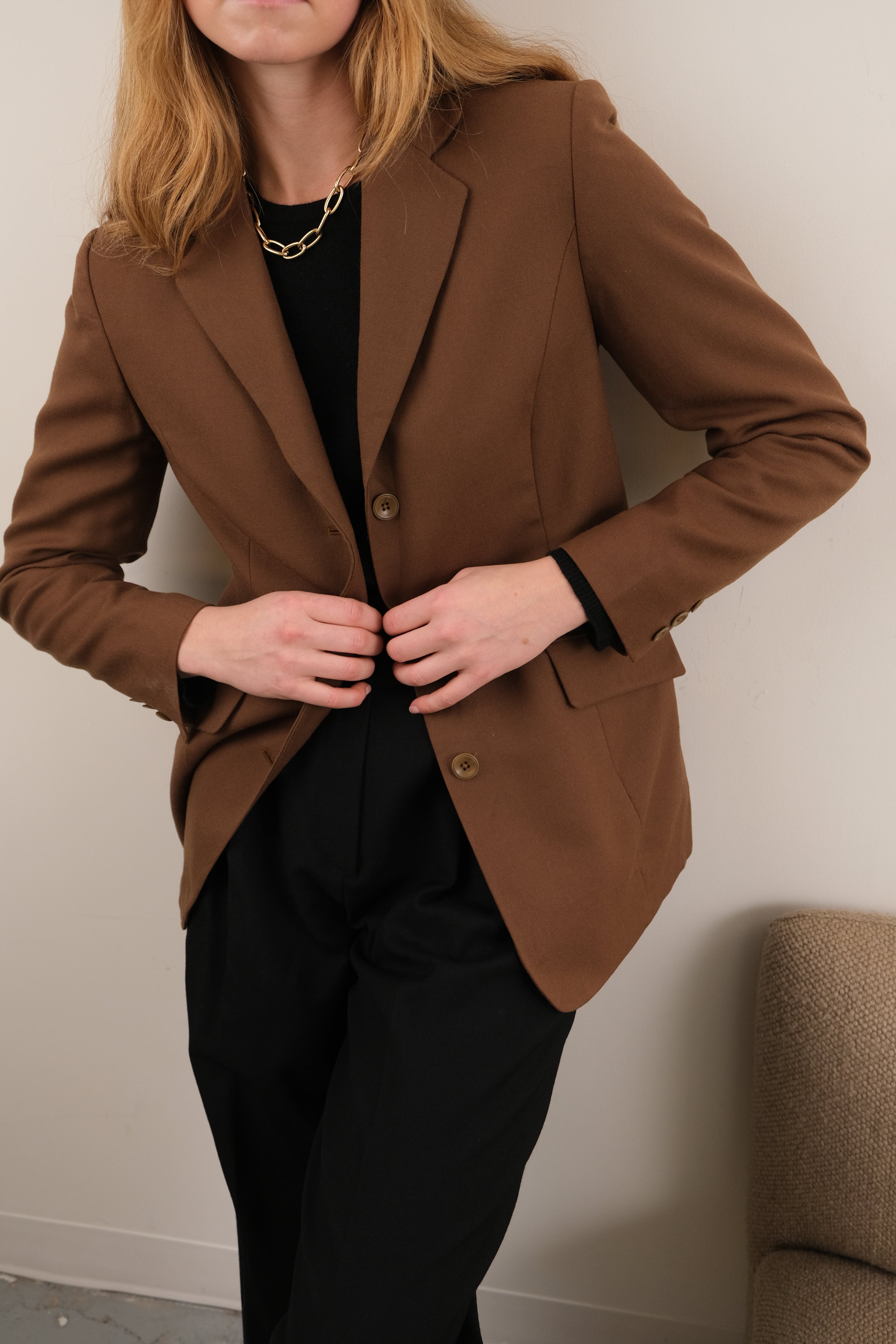 In rich brown 100% wool, this blazer feels smooth and lightly structured, with a beautiful, tailored drape through the body. Designed with notch lapels, a three-button front, and flap pockets, it is fully lined for clean layering and an easy glide over knits.