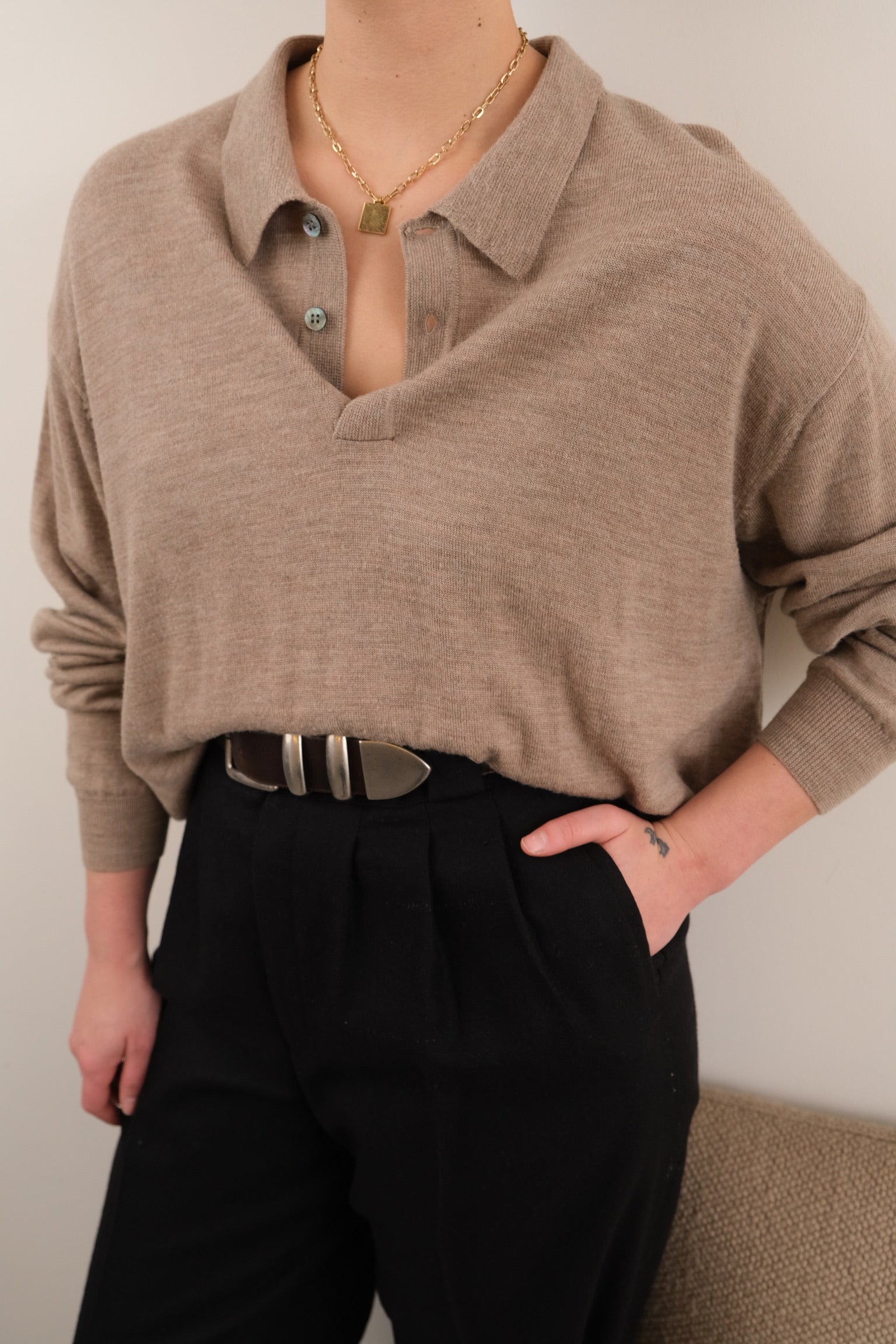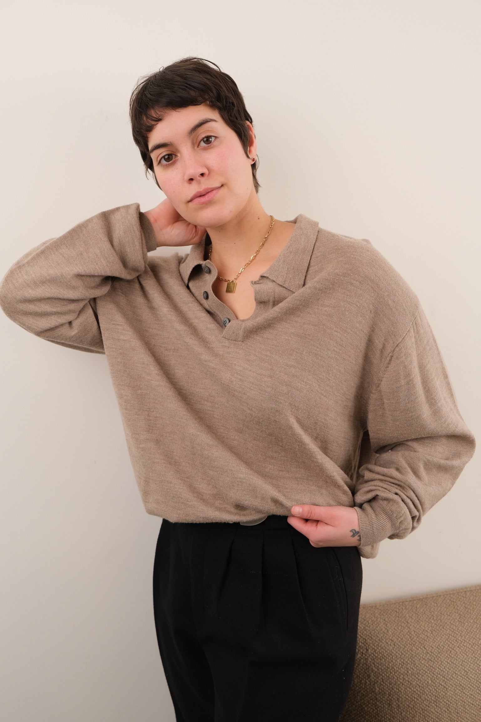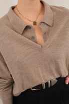 In soft tan 100% pure new wool (extra fine Italian merino), this knit has a beautiful, lightly weighty feel with a smooth, close gauge. Finished with a ribbed polo collar, three-button placket, and ribbed cuffs and hem, it sits with an easy, relaxed shape that layers cleanly under outerwear.