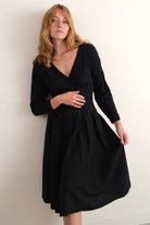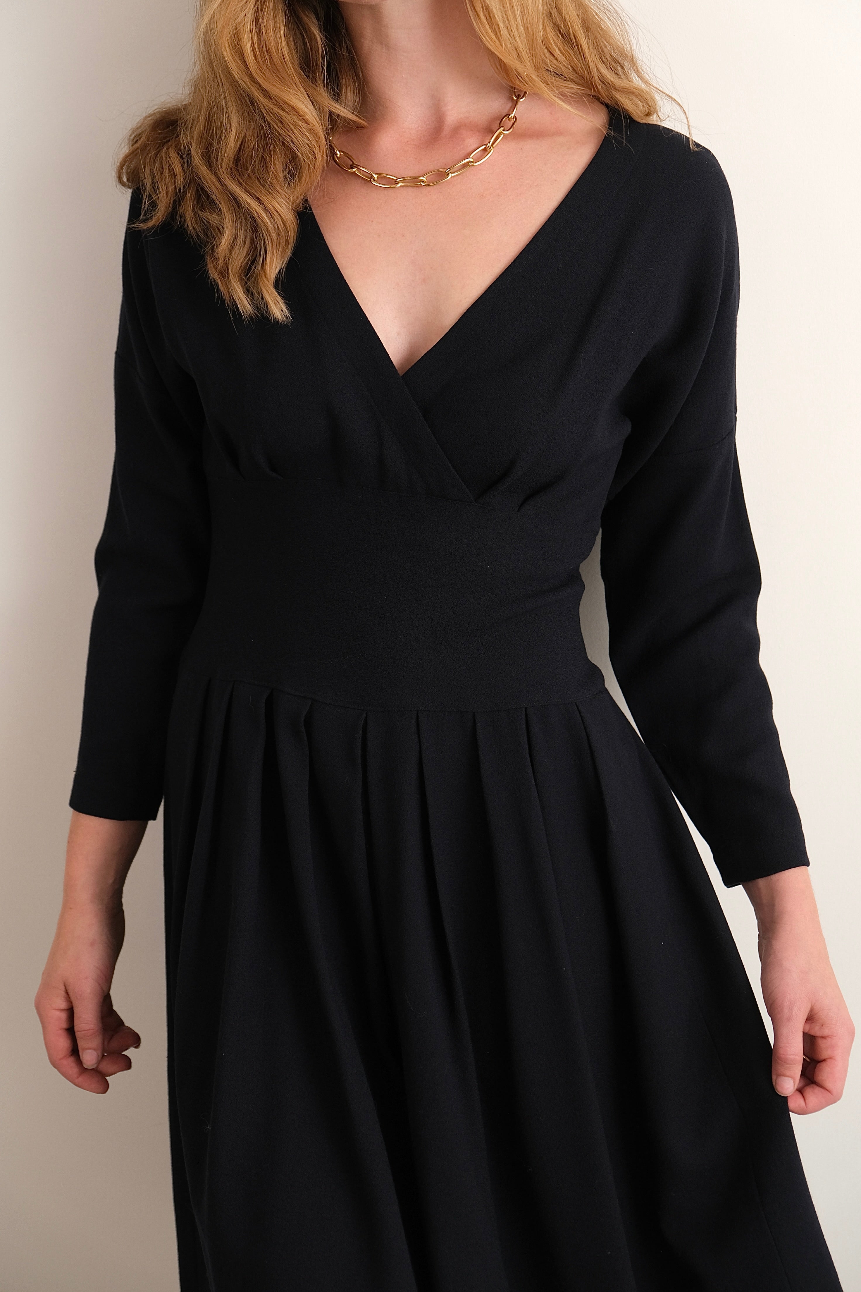 Vintage 90s Ink Wool Pleated Long Sleeve V-Neck Midi Dress