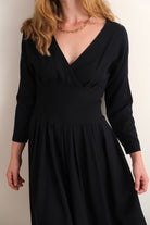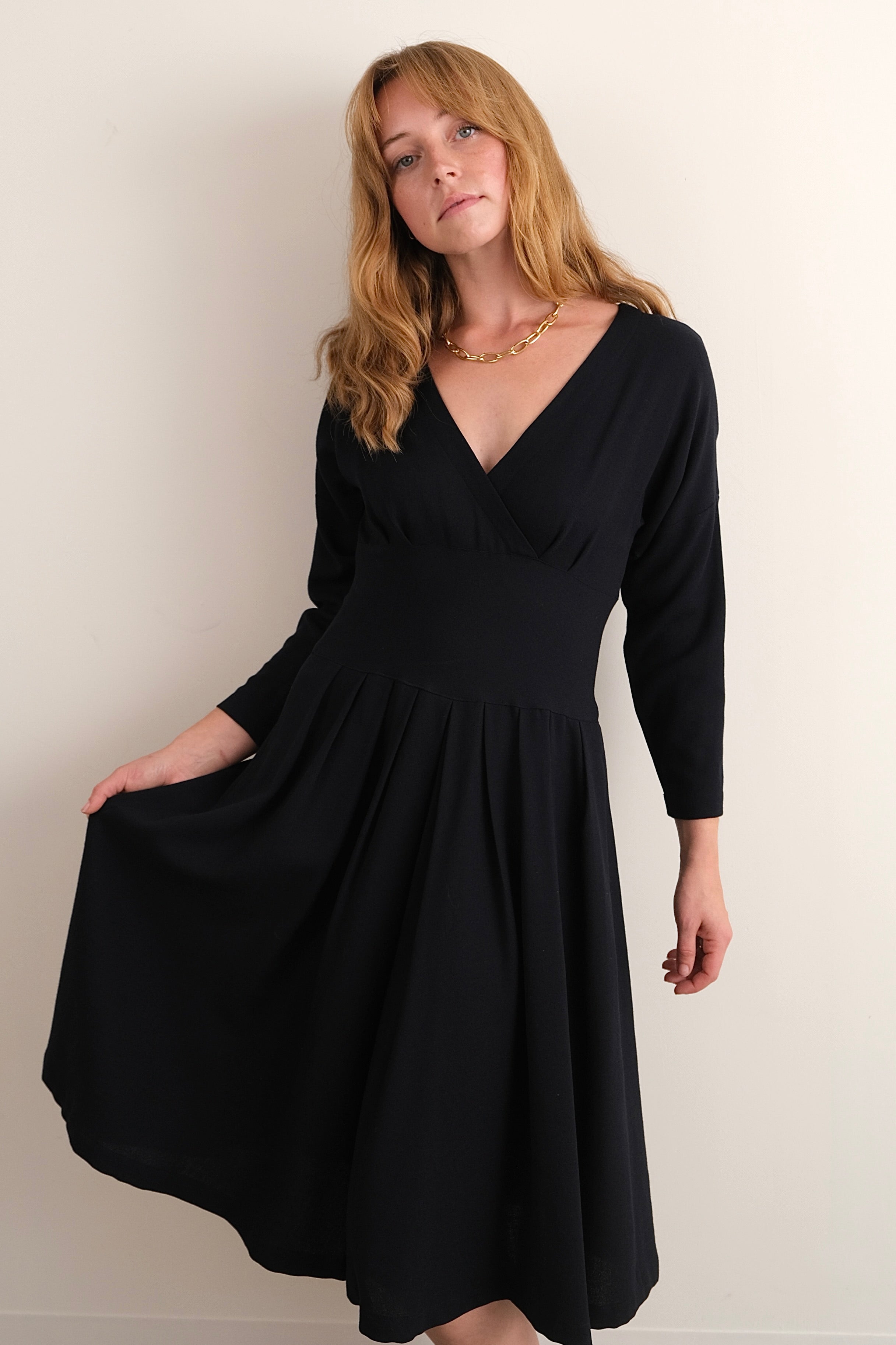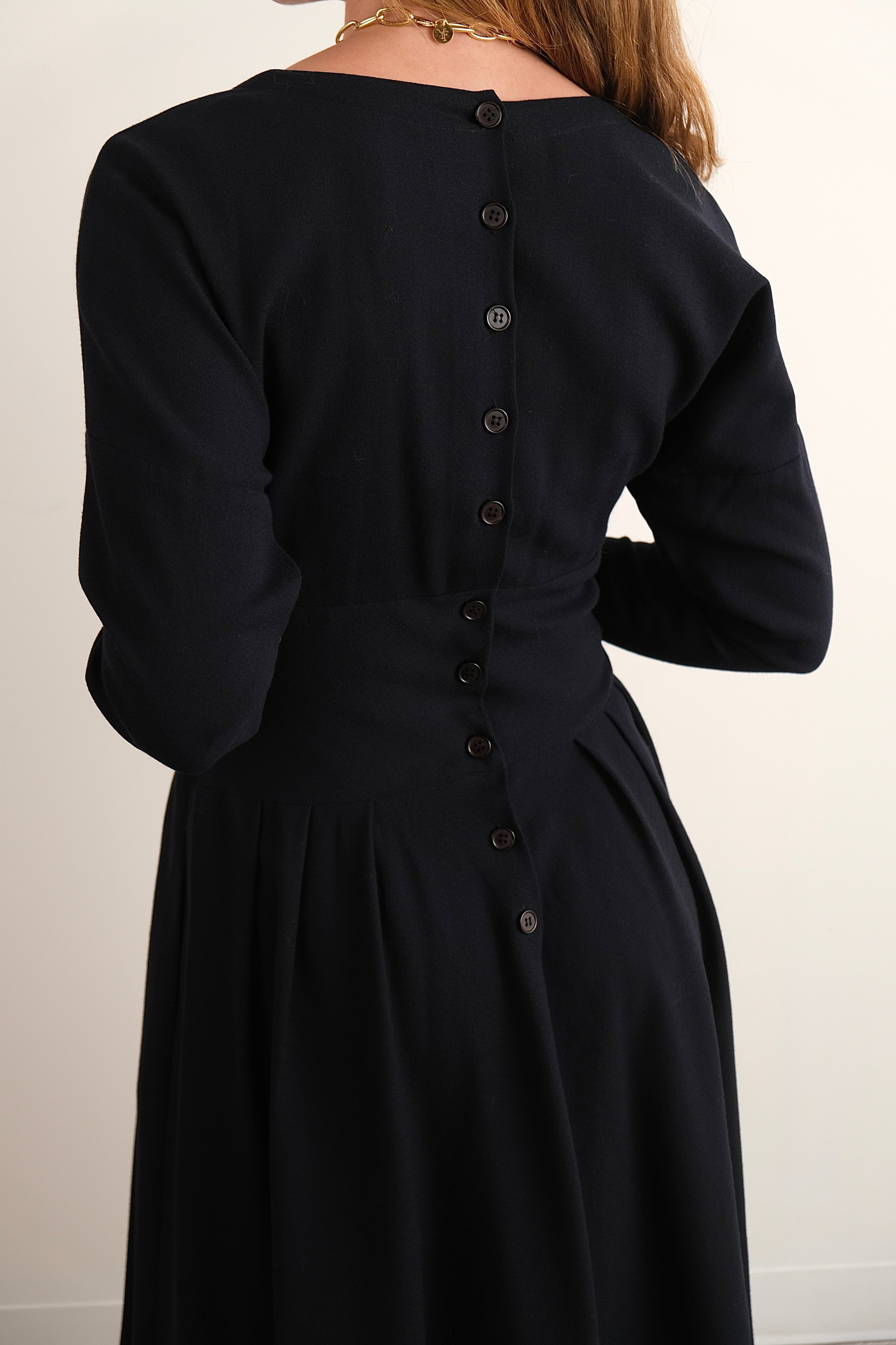 In sharp black 100% all pure wool, this dress feels smooth and substantial, with a stunning drape through the skirt. The bodice is shaped with a v-neckline and defined waist seam, falling into soft pleats for easy movement. Finished with a full button-back placket, it keeps the silhouette clean while adding quiet structure from behind.