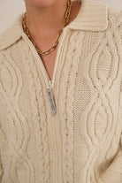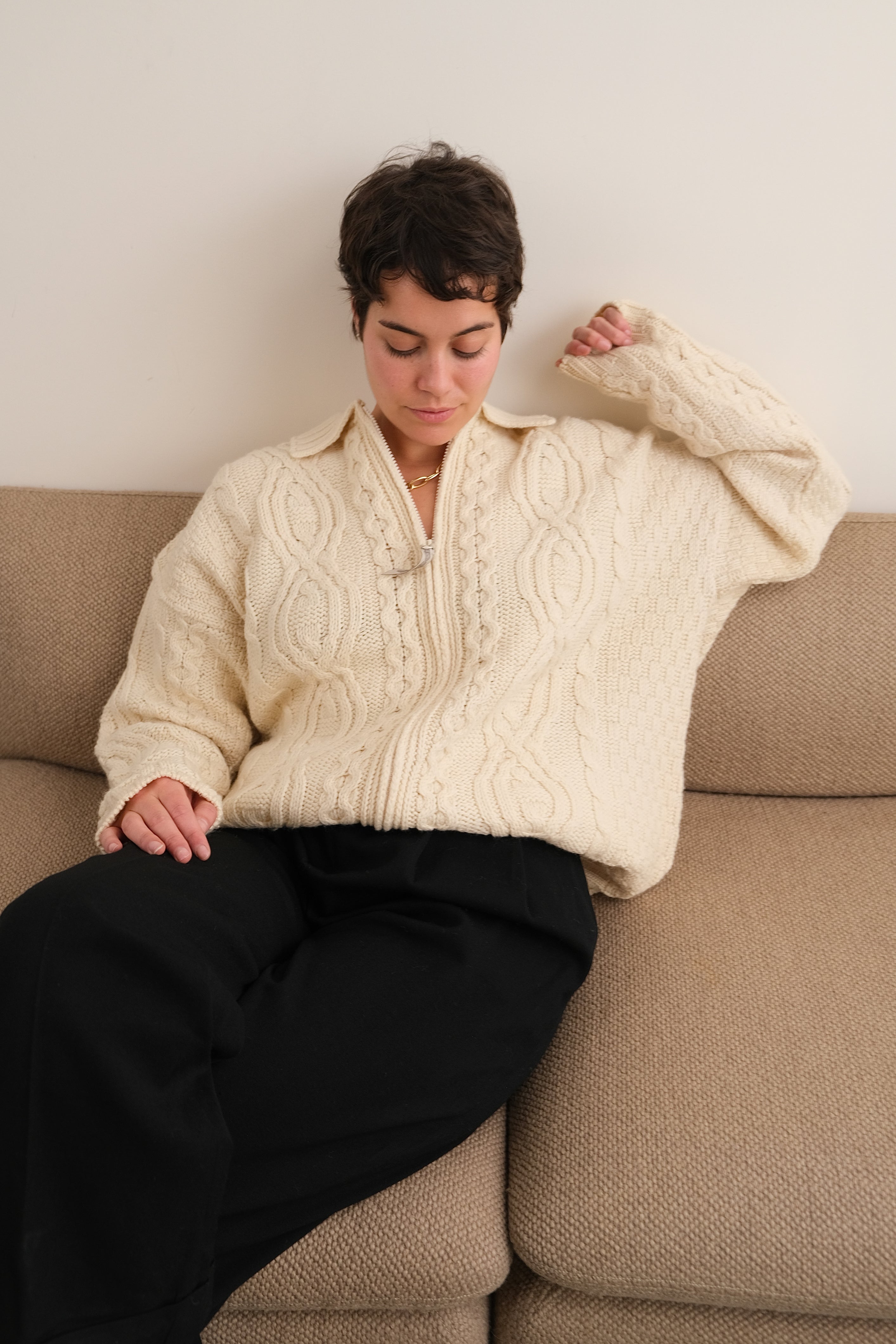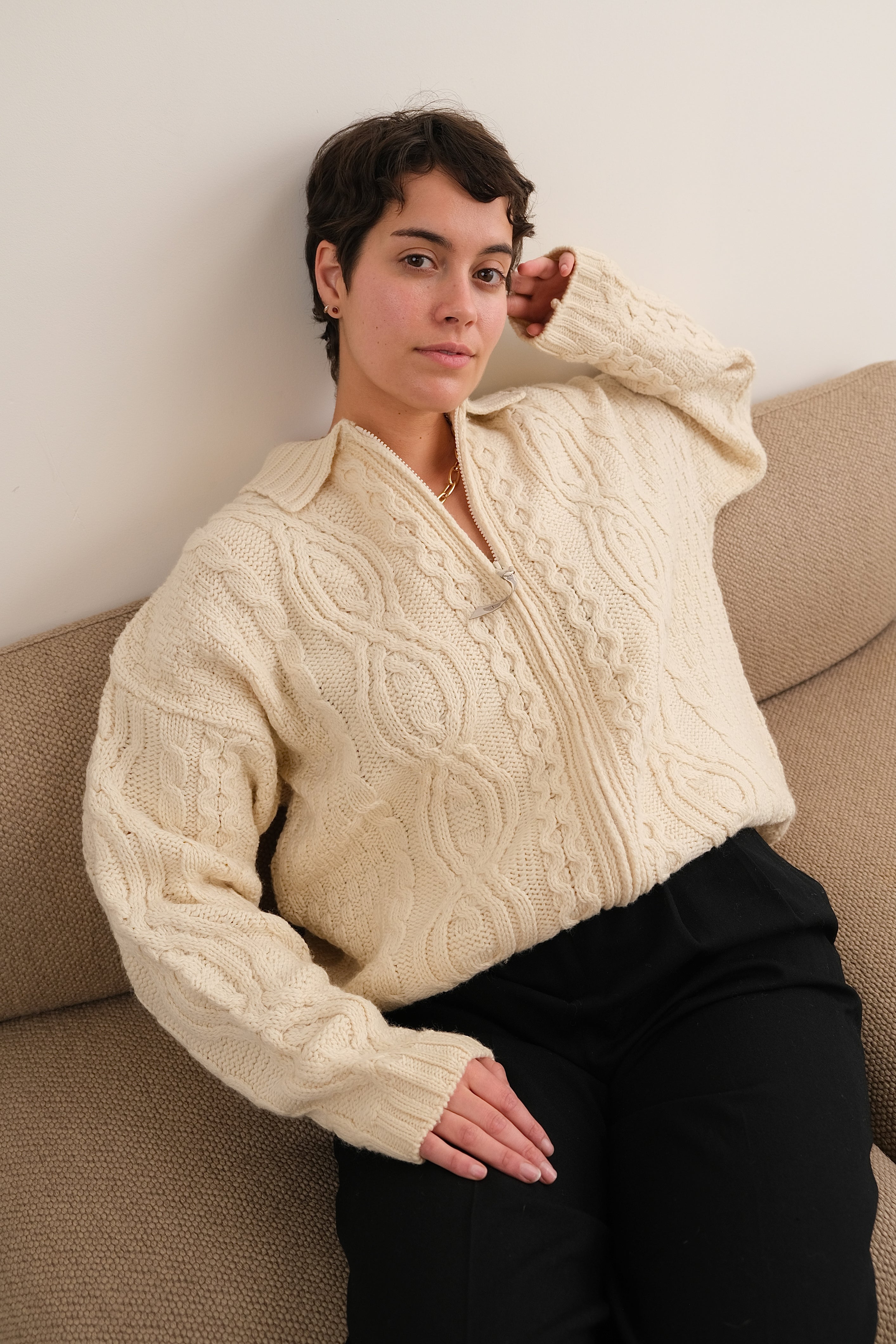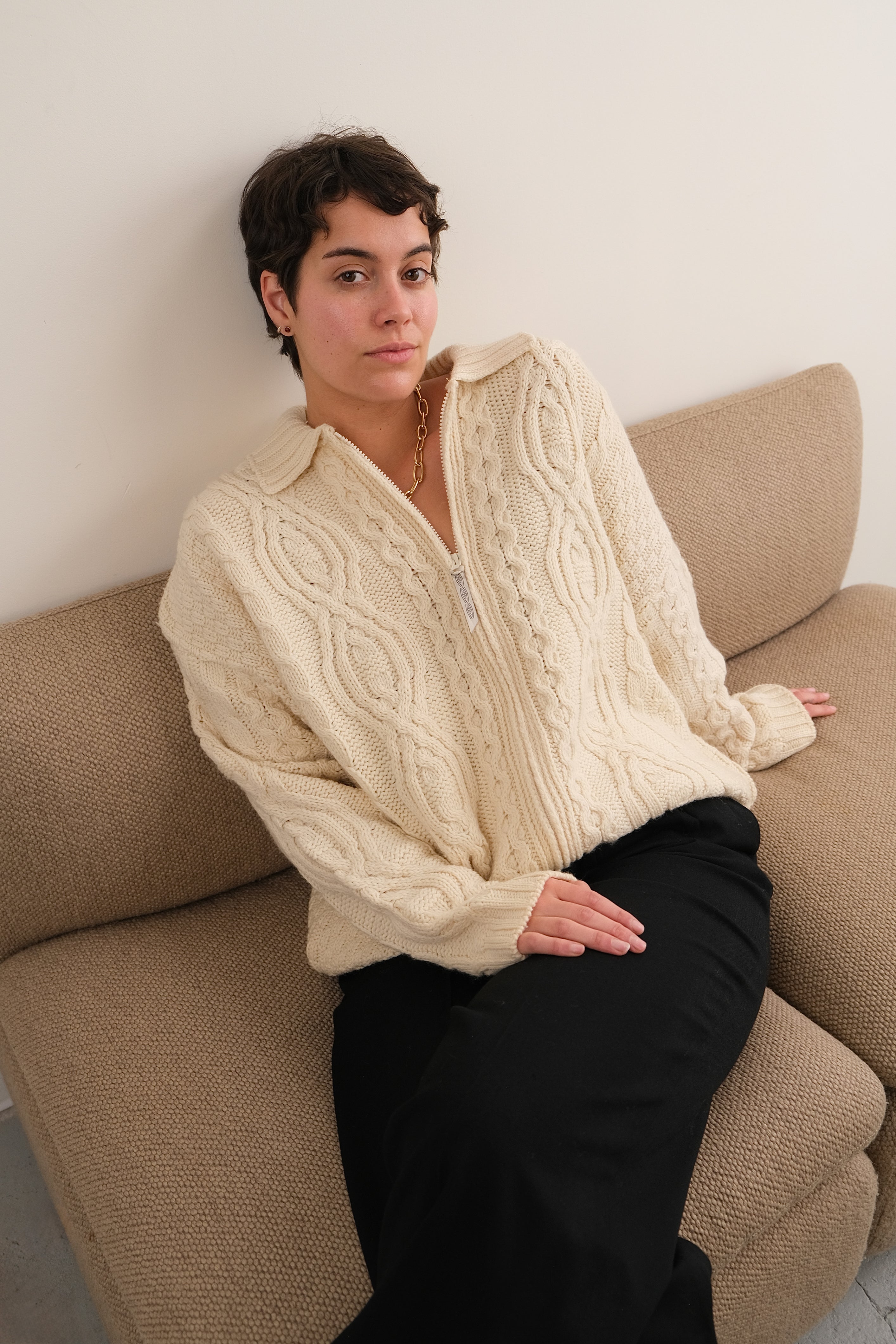 In cream-toned 100% merino wool, this cardigan has a dense yet supple feel with natural warmth and softness. A traditional Aran cable program runs throughout in varying gauges, giving rich texture and dimension. Finished with a ribbed stand collar and a full-length zipper, it offers easy layering and a clean, straight silhouette.