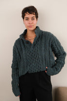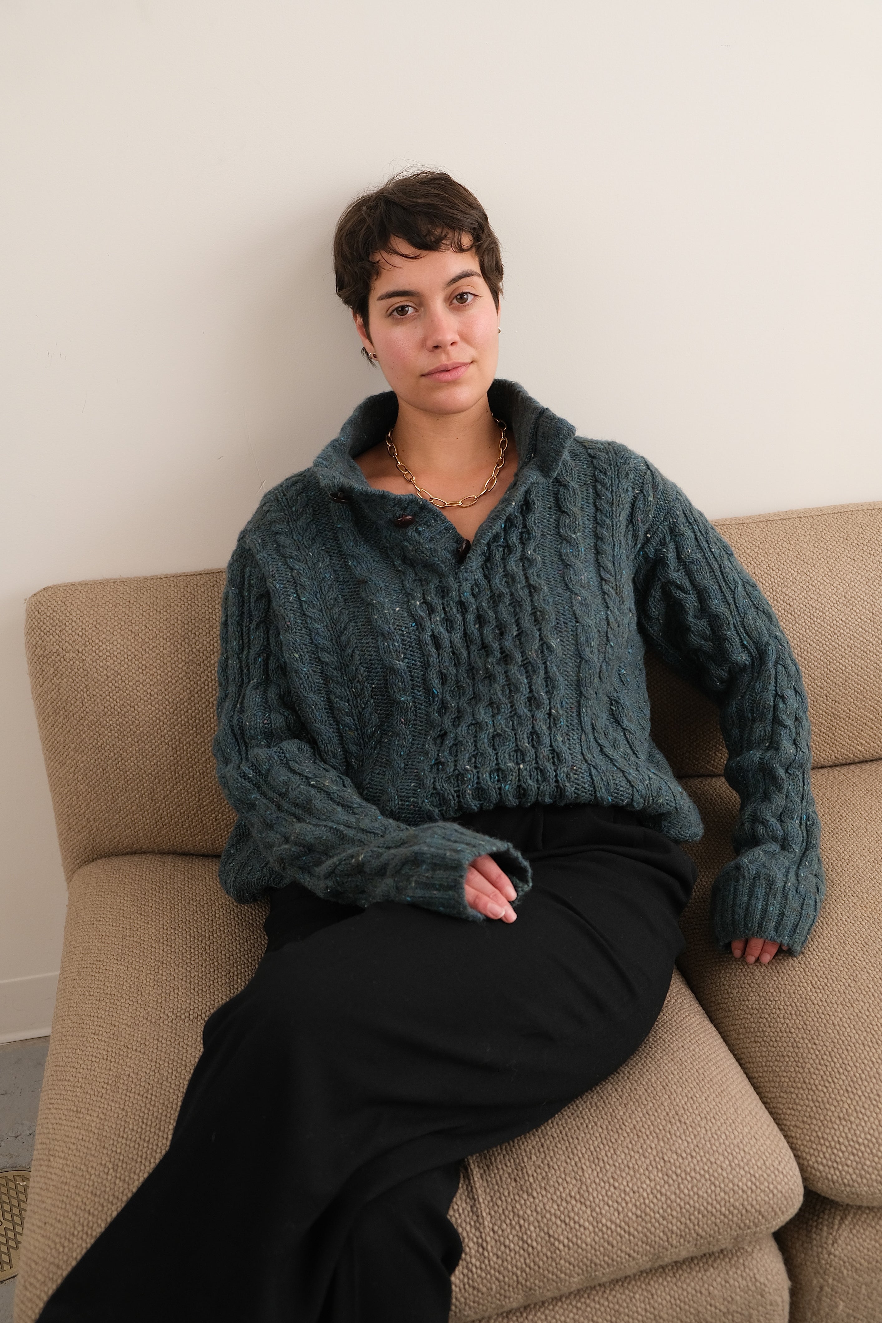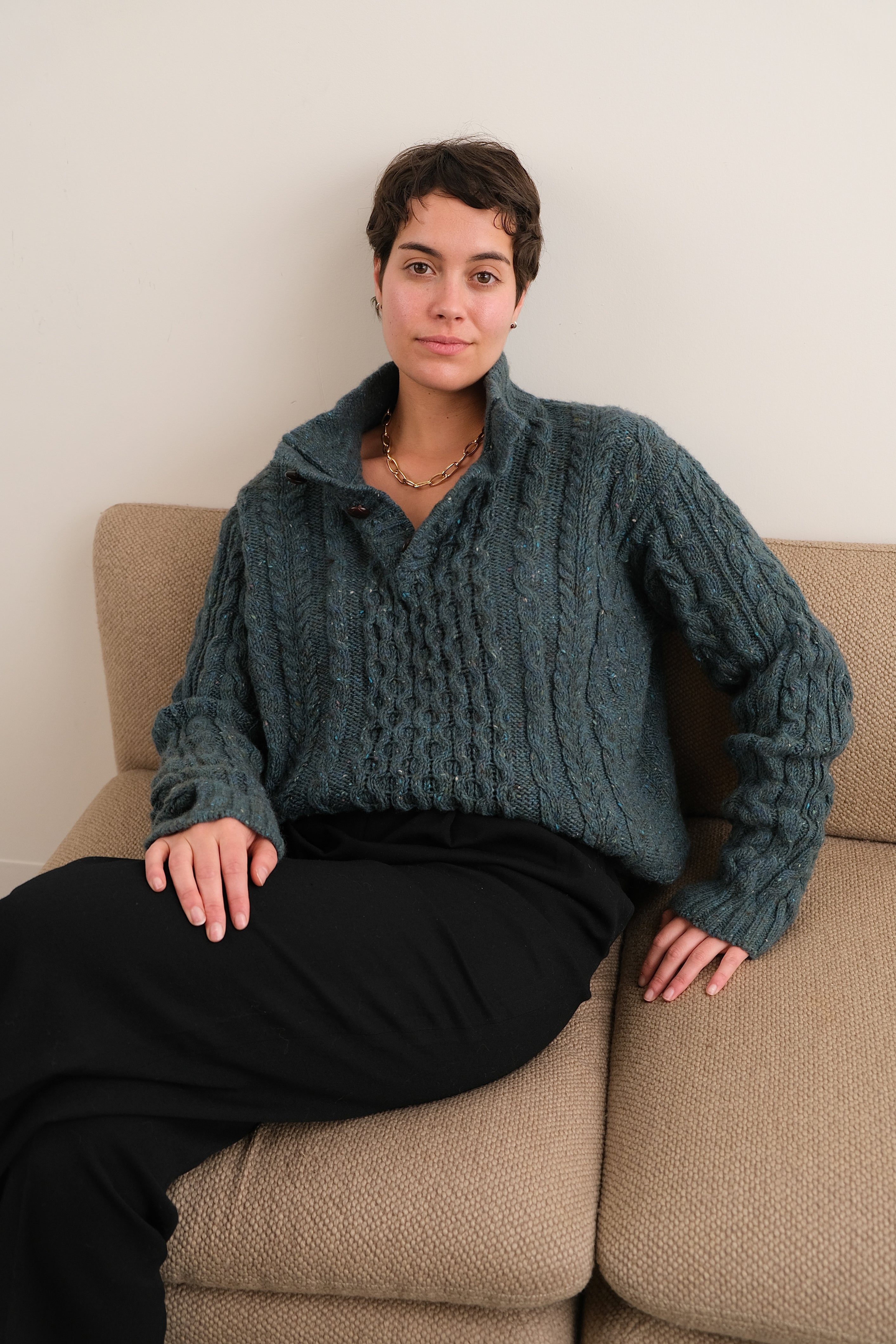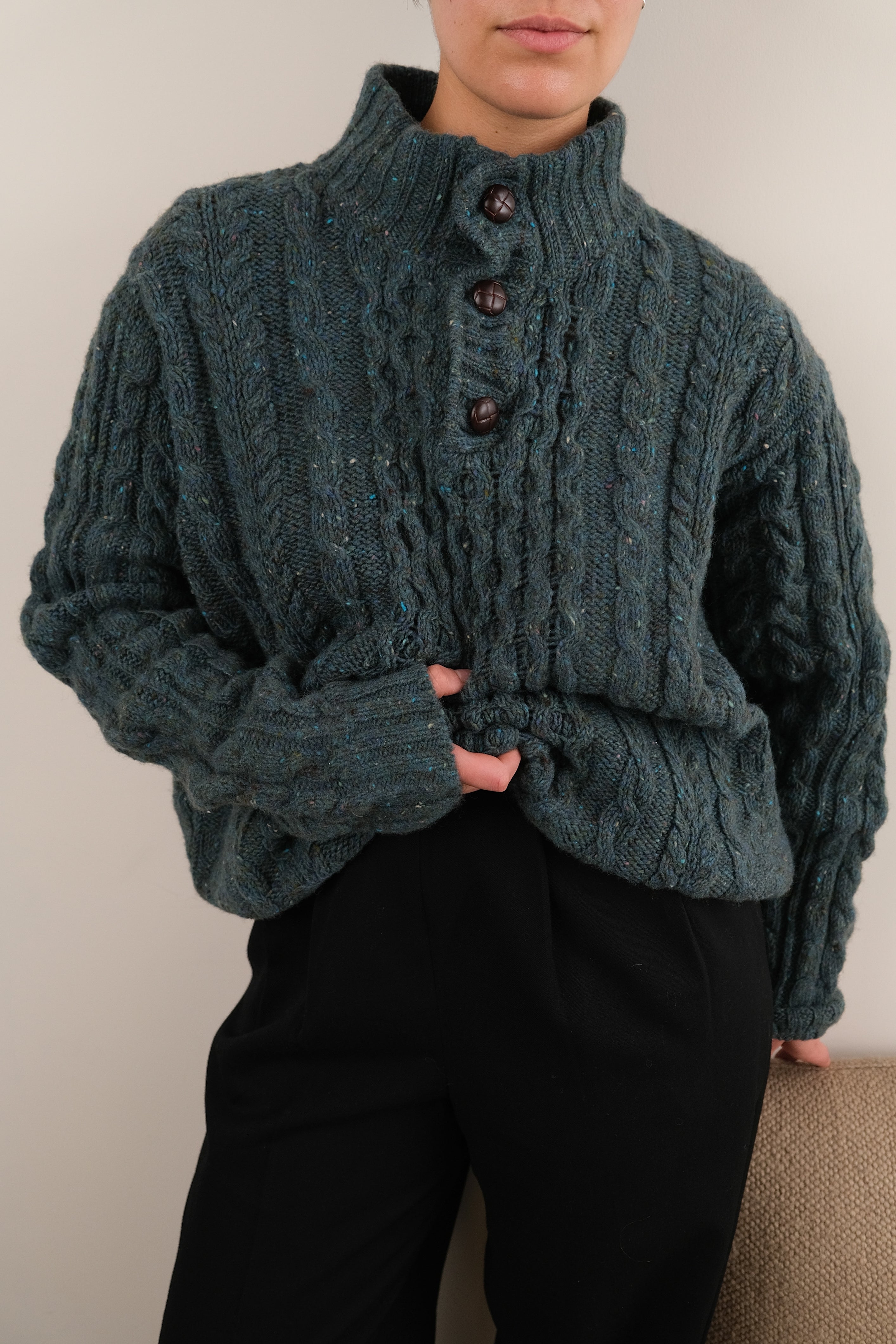 In gorgeous pine green 100% wool, this sweater has a dense, softly rugged texture with natural structure and warmth. The surface is flecked with subtle multicolor neps throughout, giving the knit a dimensional, heathered quality. A traditional cable pattern runs through the front and sleeves, balanced by ribbed trims at the collar, cuffs, and hem. The high ribbed neckline closes with three wooden buttons, lending an adaptable shape that sits neatly whether worn open or fastened.