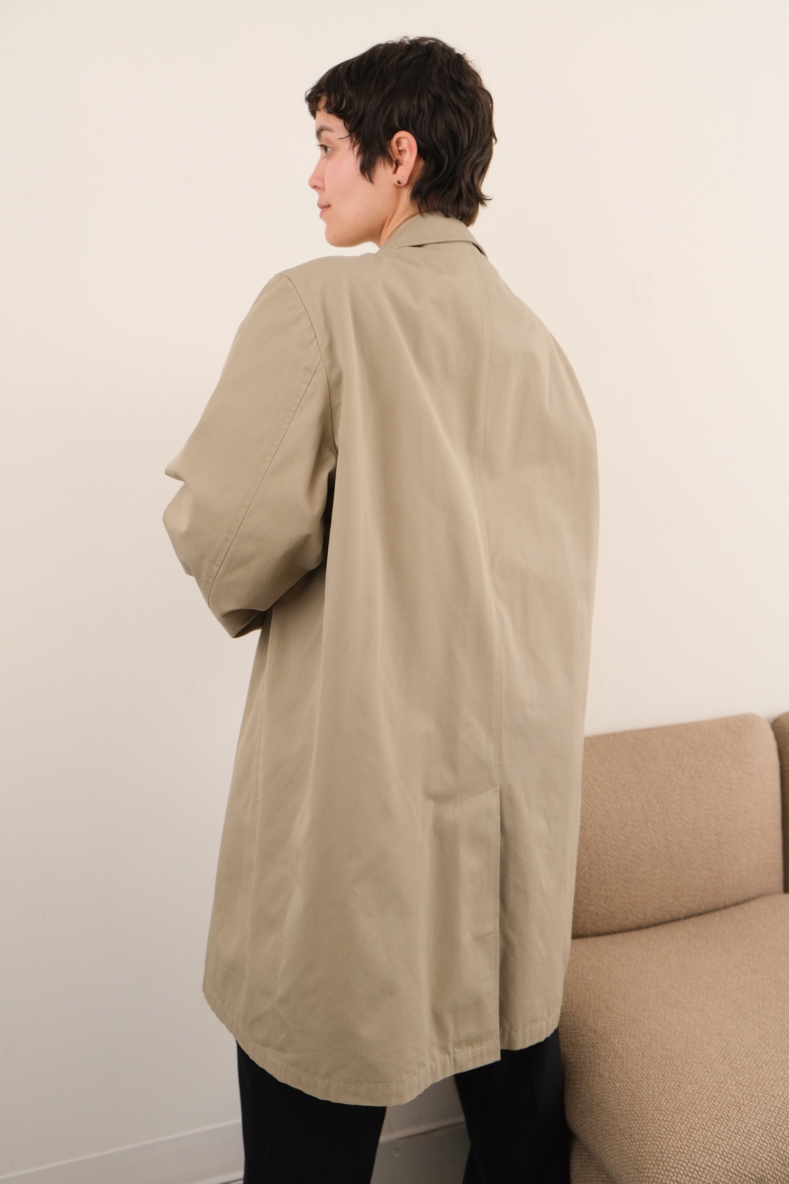 Cut in handsome tan cotton blend (60% cotton, 40% polyester), this car coat has a smooth, lightly structured feel. Designed with a clean spread collar, button front, and side-seam pockets, it wears easy through the shoulders with a straight, mid-length line. A removable liner adds flexible warmth depending on the season.