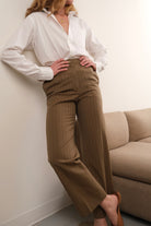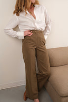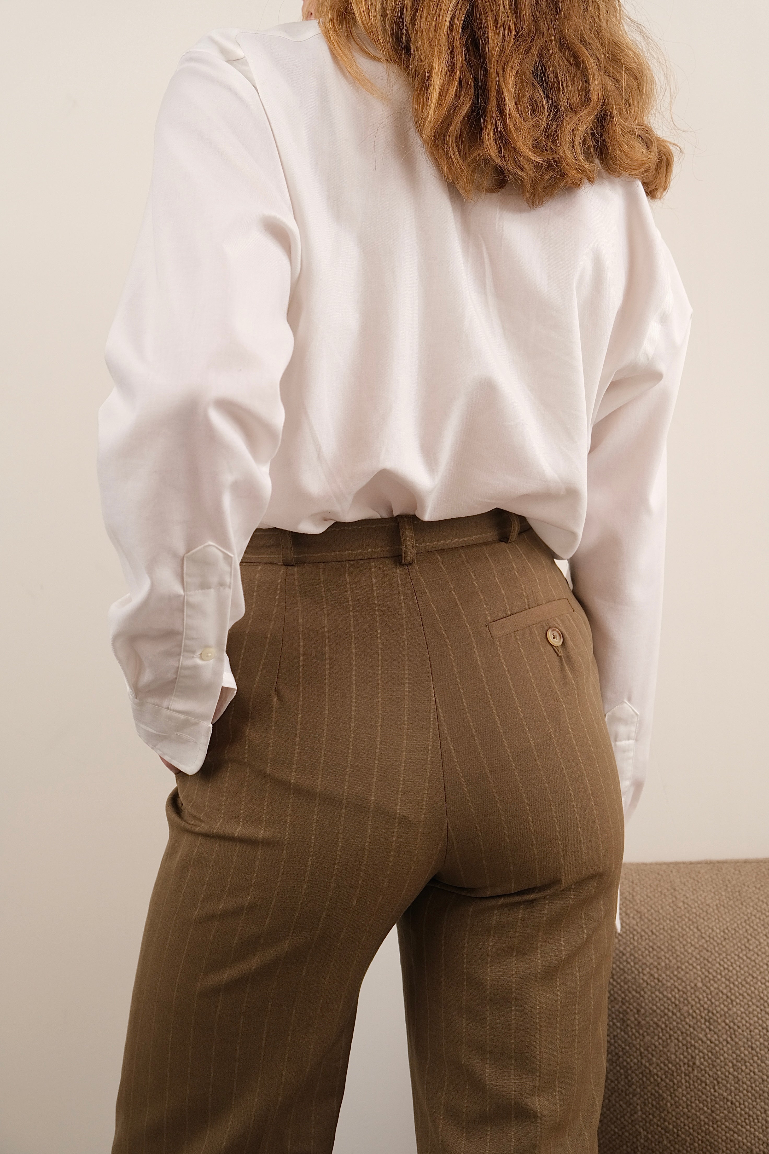 Finished in a warm camel hue with fine pinstripes, the wool blend fabric drapes with soft structure and a subtle sheen, lending the piece both weight and fluidity. The high-rise waist features a clean tab-button closure and gentle tailoring through the hips, falling into a straight leg. Side pockets complete the design, marrying polish with ease. A refined take on 90s suiting—equally effortless styled with silk shirting or relaxed knits.