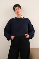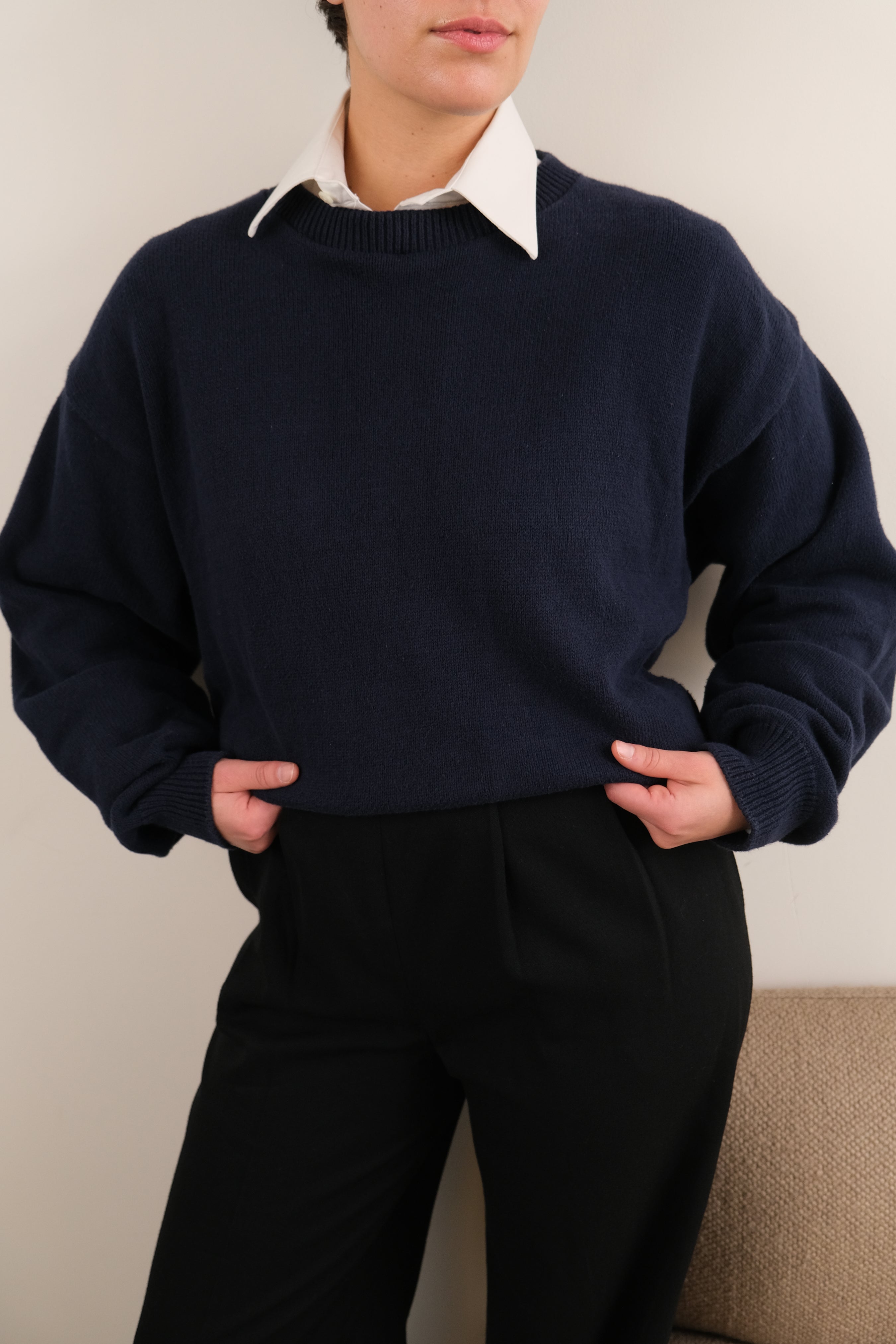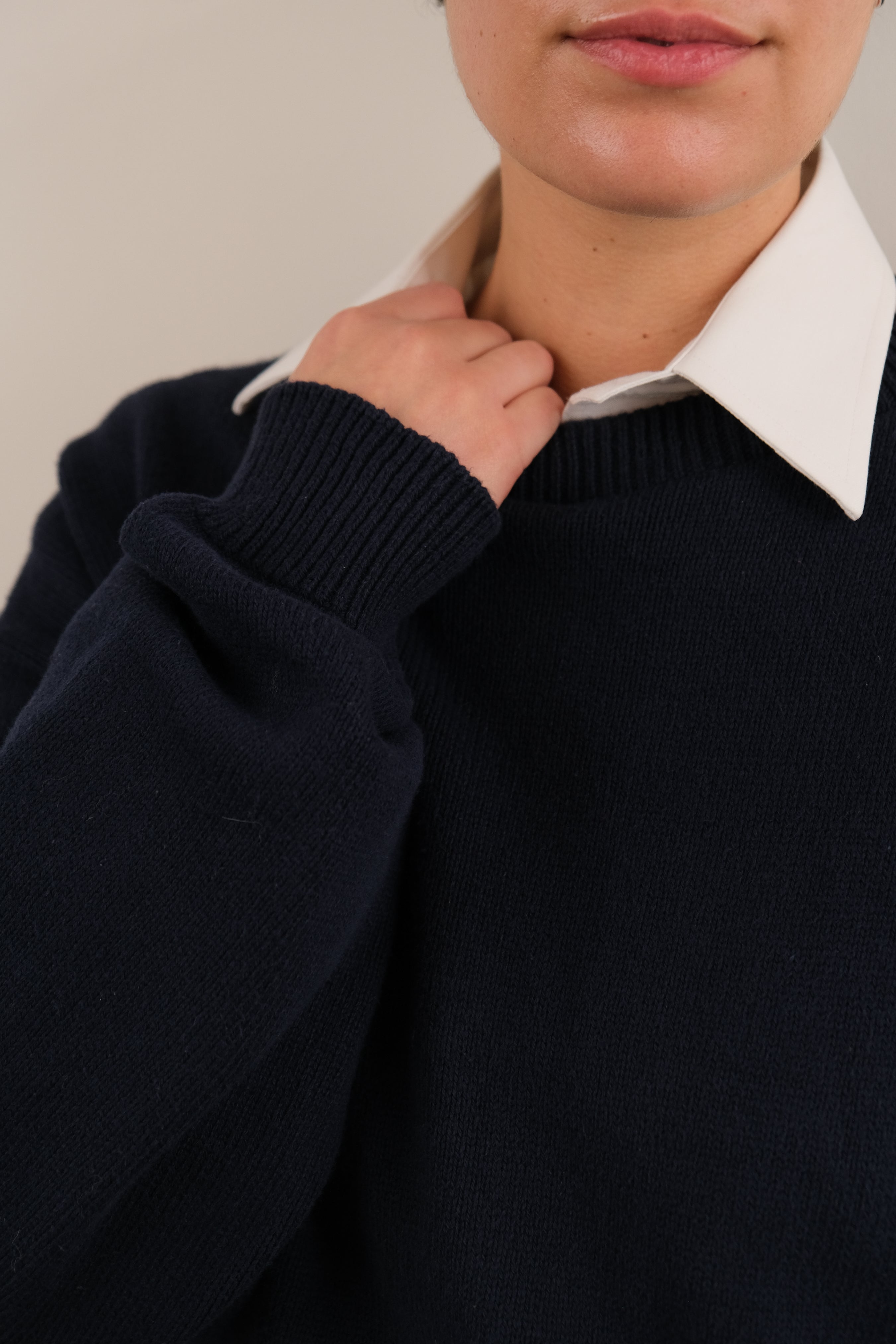 In deep navy cotton, this pullover has a soft, midweight feel with a lightly structured knit and ribbed trims that give it a clean, everyday finish. The classic crew neckline and long sleeves create an easy silhouette suited to year-round wear.