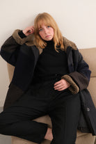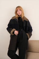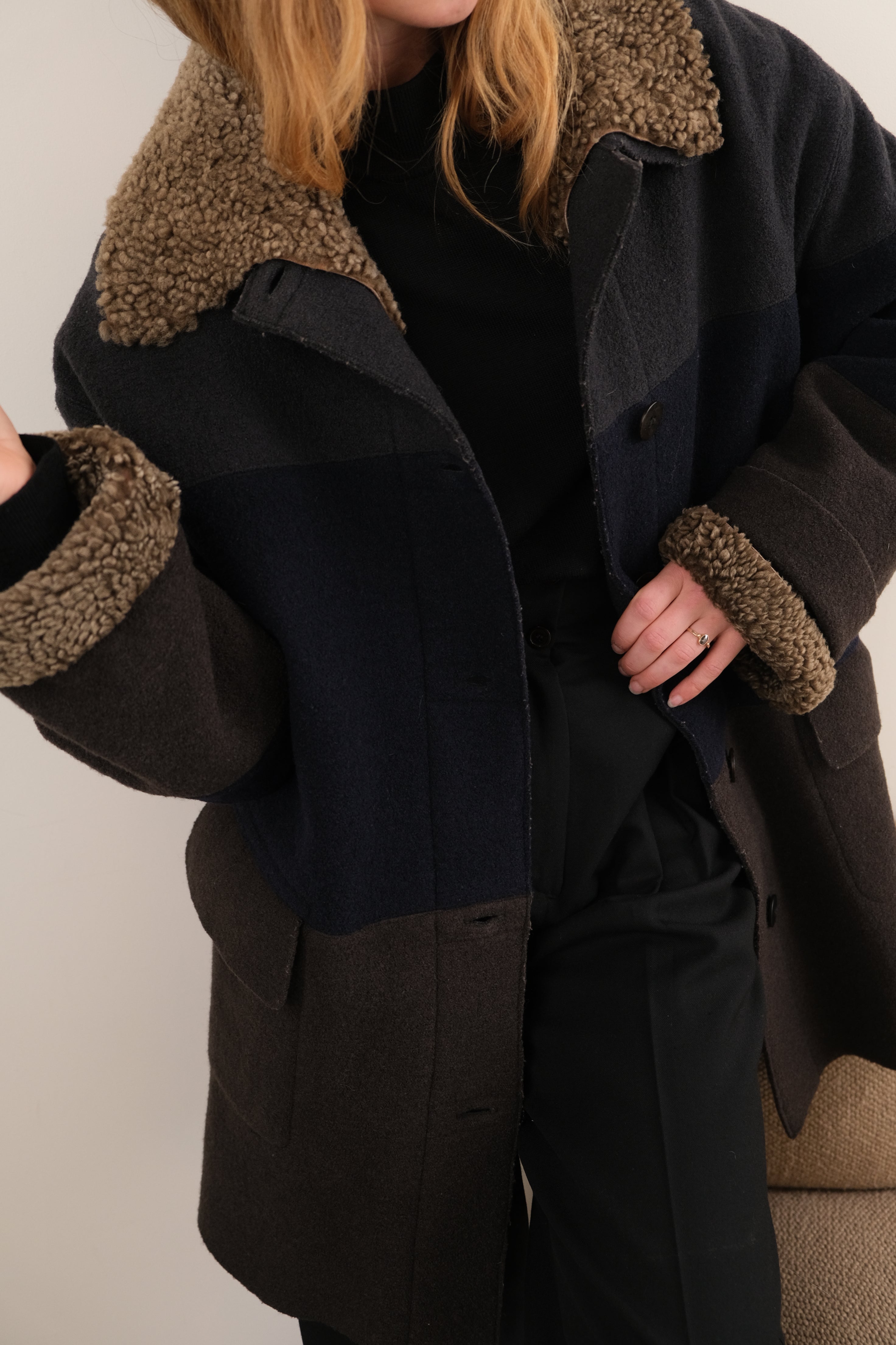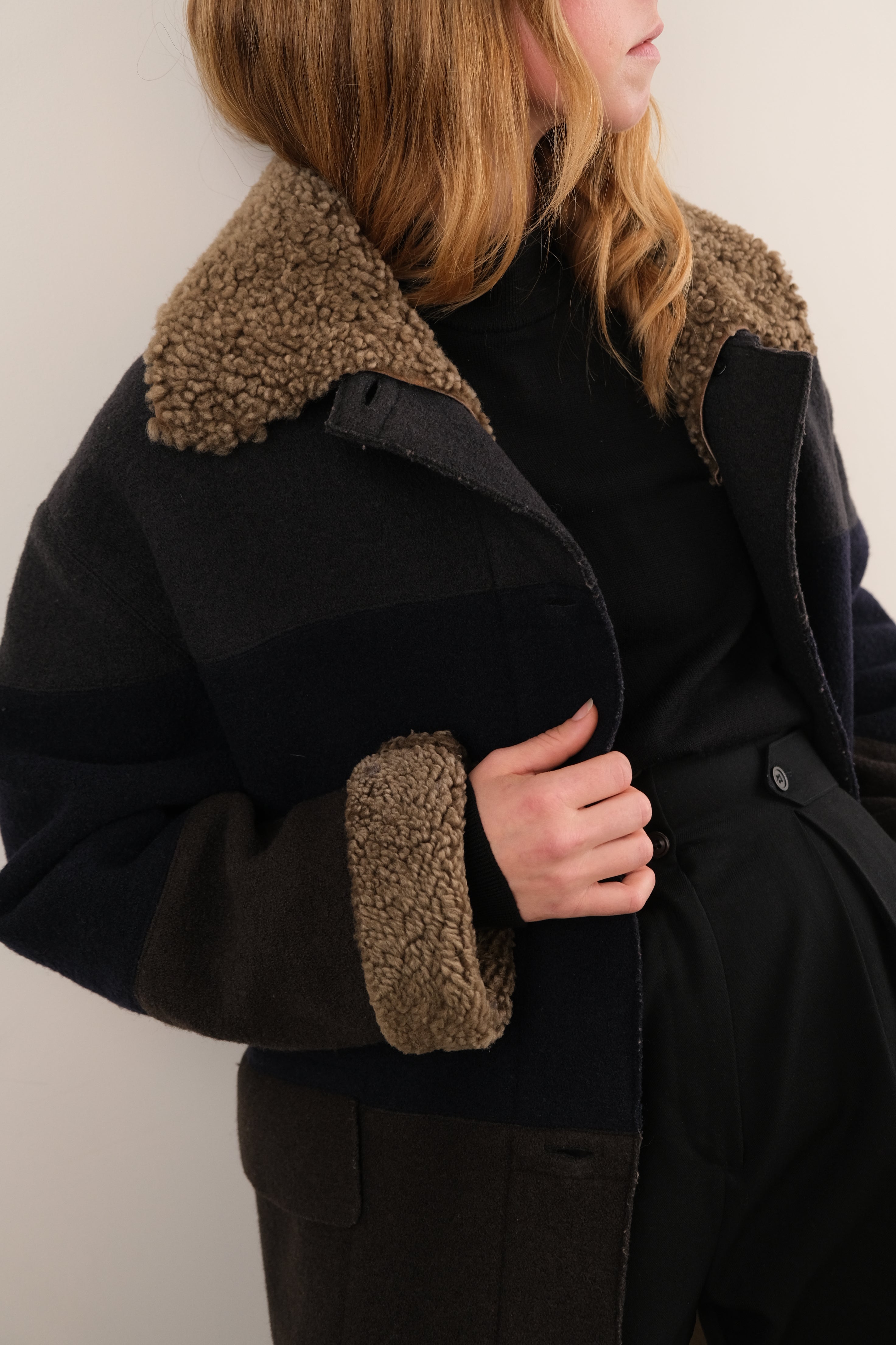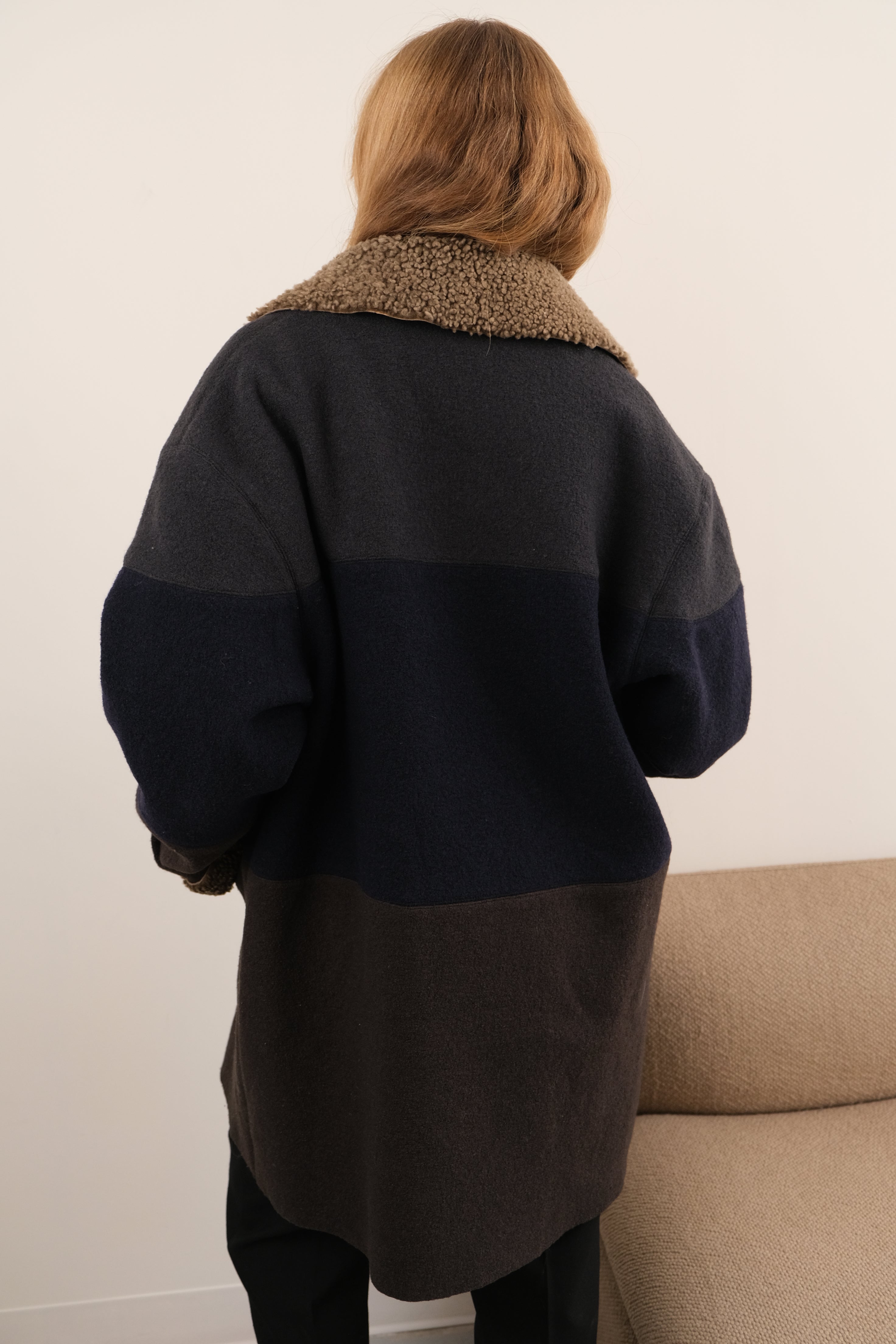 In a two-tone wool palette blending charcoal gray and deep navy, this coat feels substantial and composed, with a smooth, tailored surface and a gently structured drape. Designed with a cozy sherpa collar and a clean button front, it features a removable wool lining that allows for flexible layering across seasons.