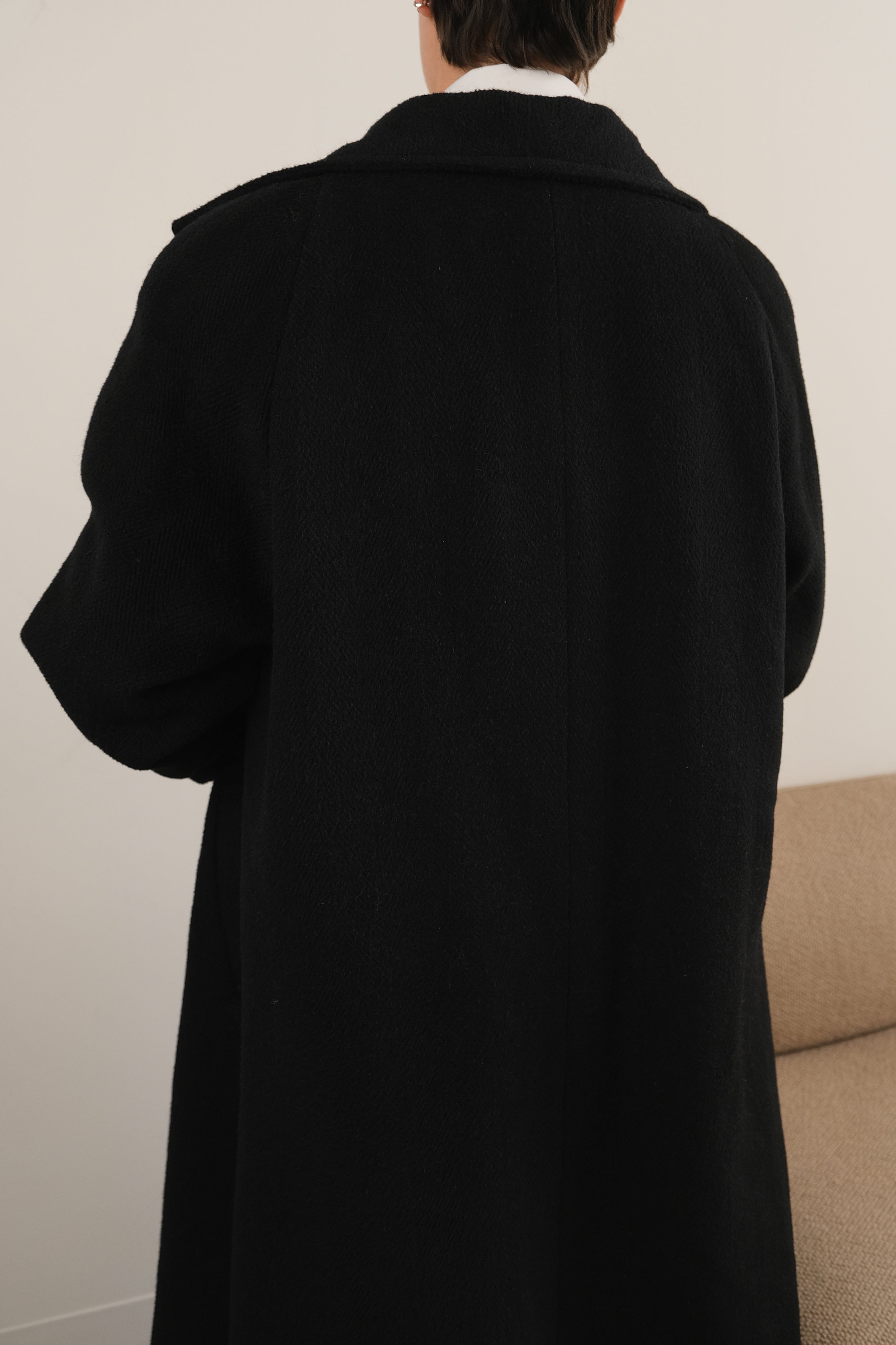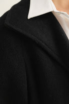 Cut in rich black wool and alpaca, this coat has a smooth yet weighty feel with a softly brushed surface. Designed in a full-length silhouette with a wide shawl collar and concealed double-button closure, it carries quiet sophistication and warmth through winter months.