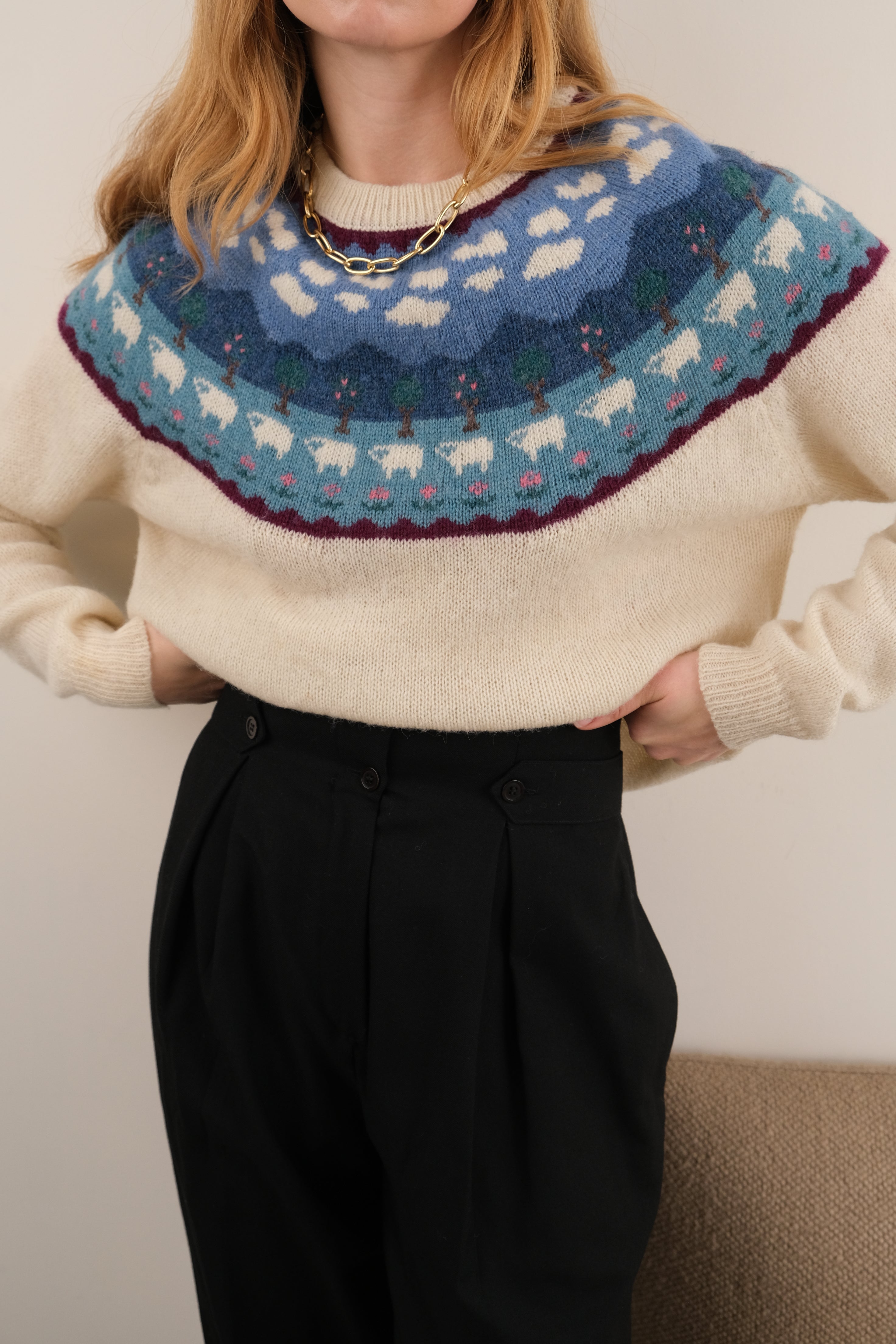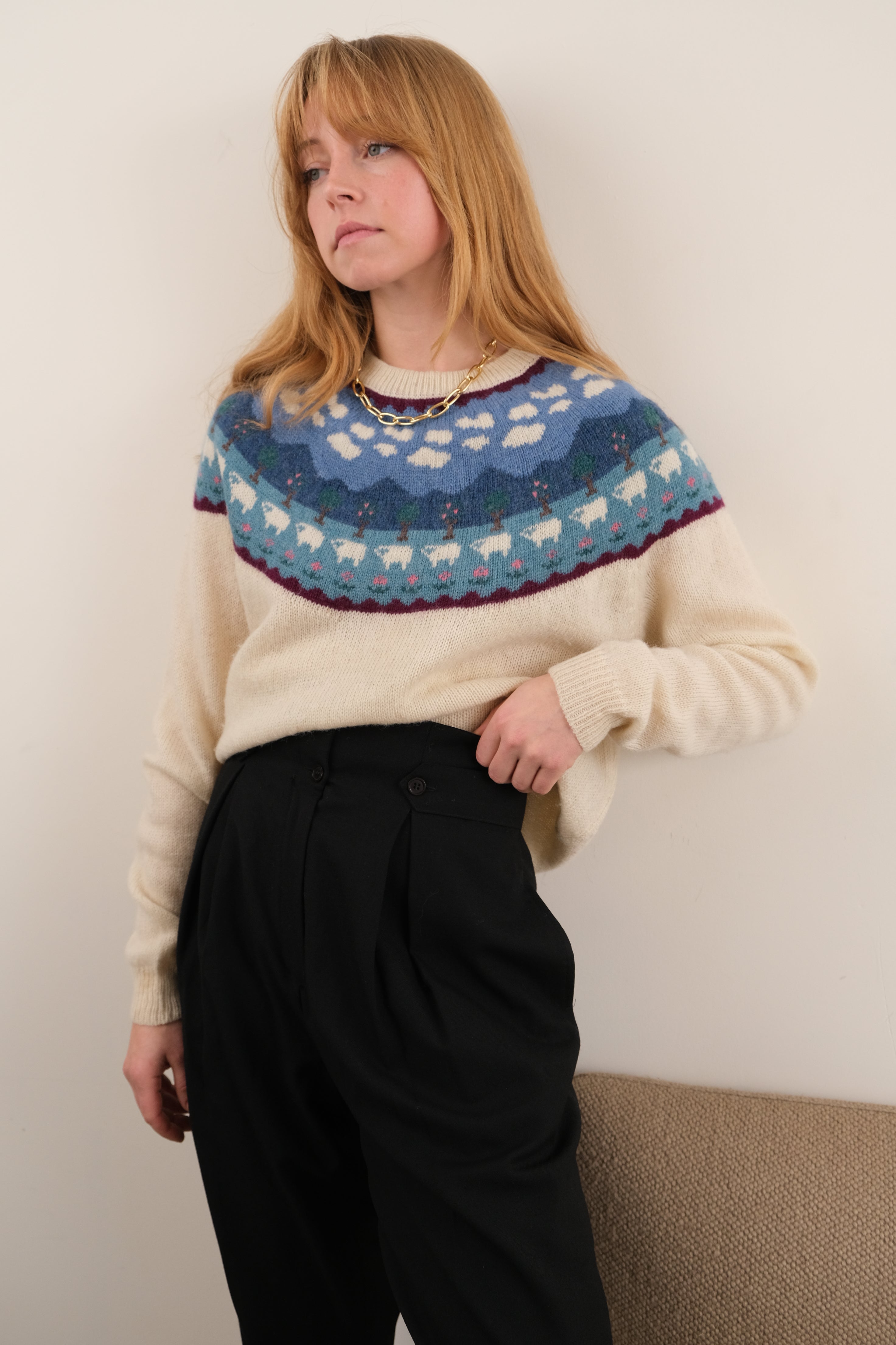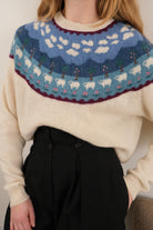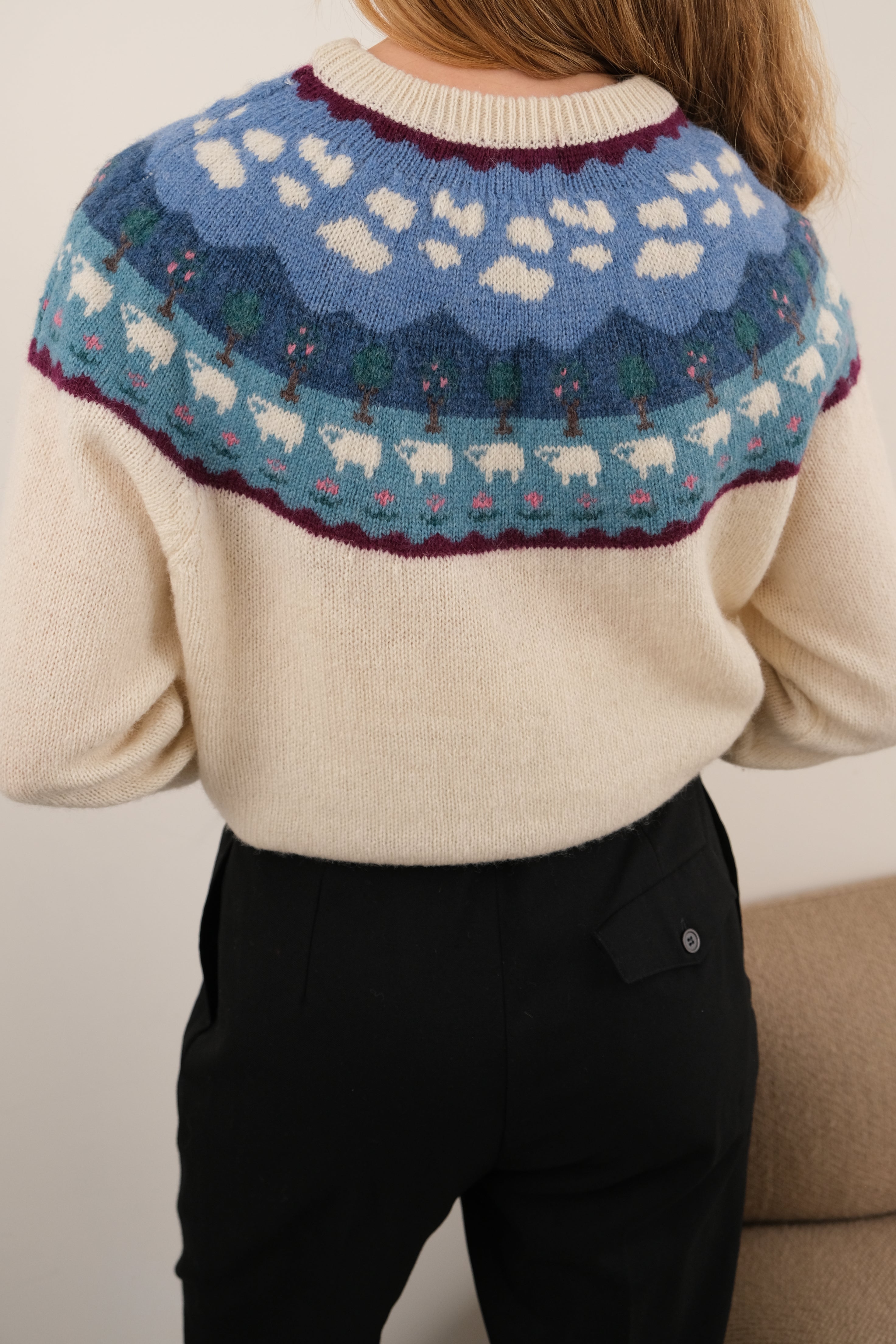 In soft cream wool, this sweater features a classic Fair Isle yoke rendered in layered shades of slate blue, teal, and wine. The knit has a substantial yet breathable feel, offering warmth without stiffness, while the detailed motif introduces a subtle folkloric character balanced by a clean, wearable silhouette. Designed with a traditional crew neckline, long sleeves, and ribbed trim throughout, the sweater falls with an easy, relaxed drape through the body.