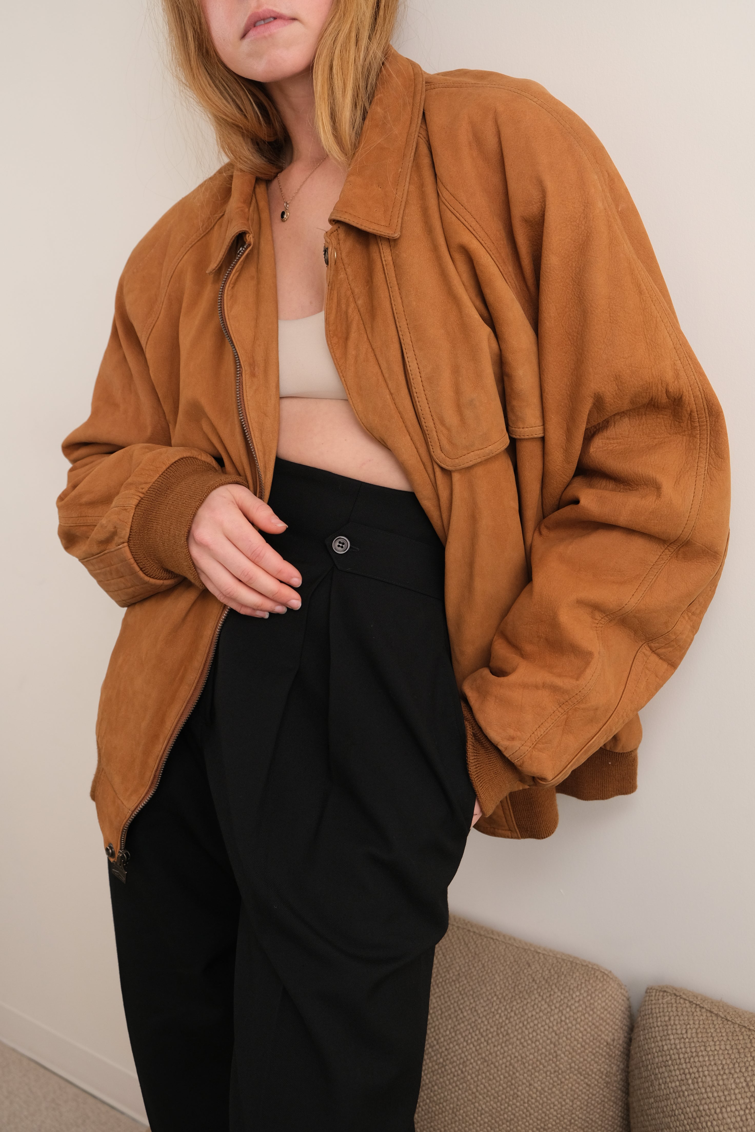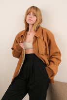 Vintage Bronze Suede Map Lined Cropped Bomber Jacket