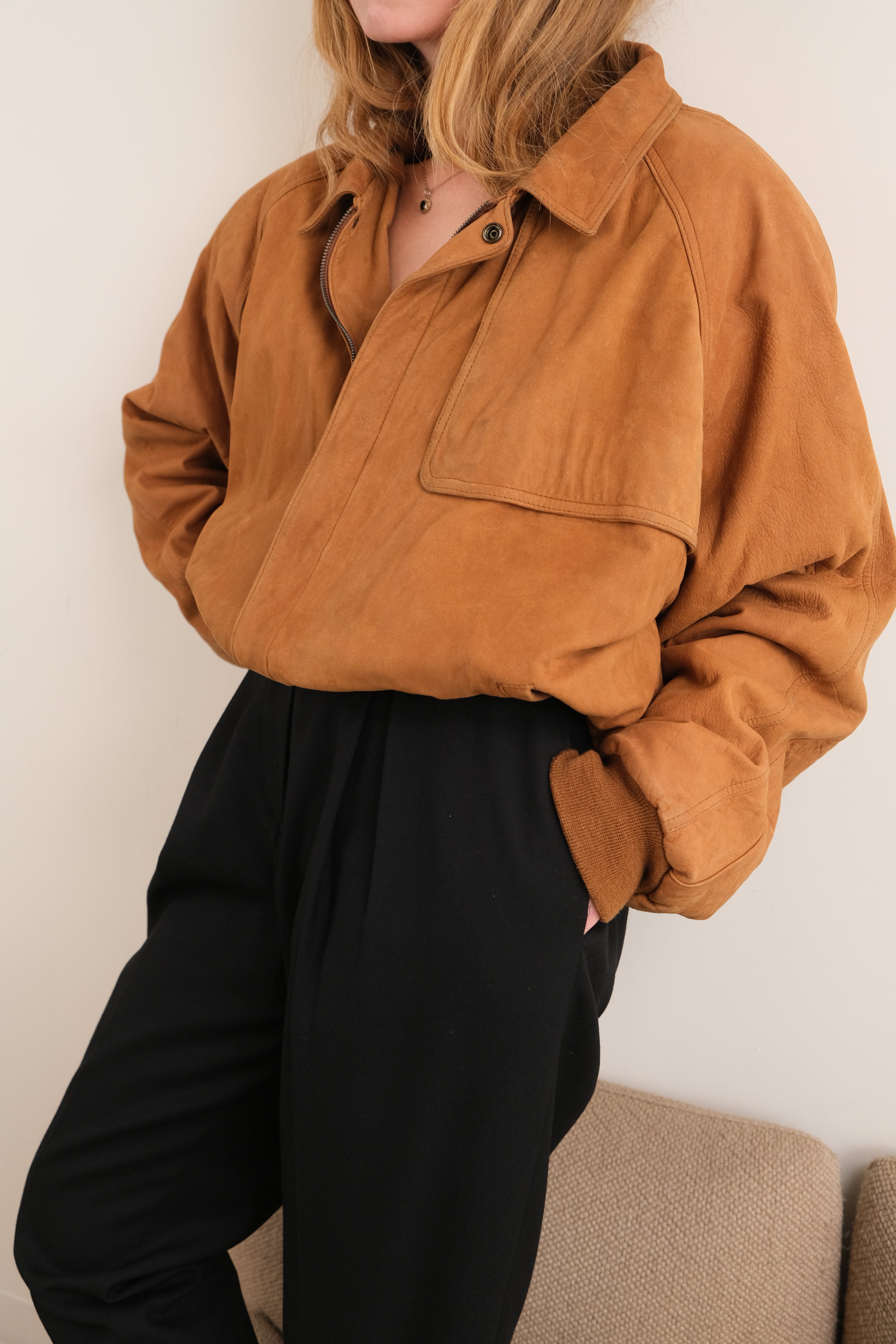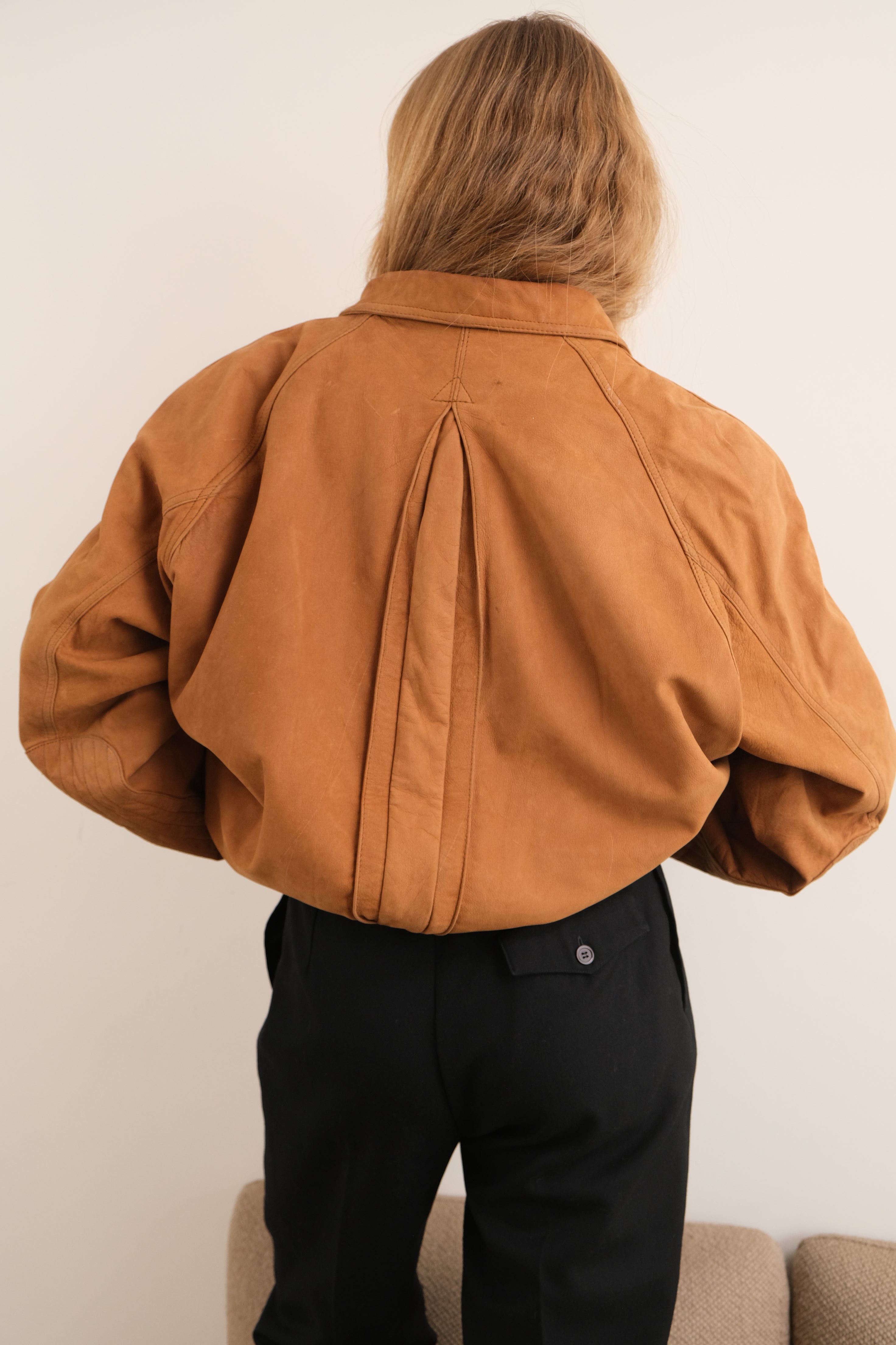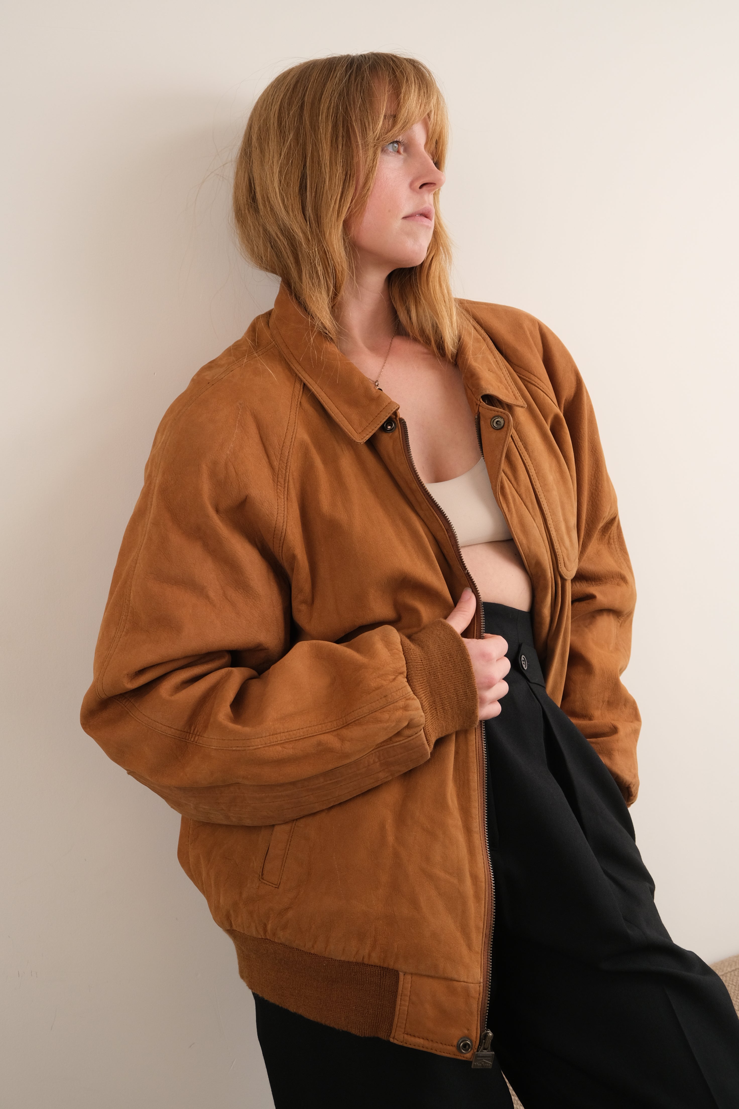 In warm brown genuine leather (shell: 100% genuine leather), this jacket feels soft and weighty, with a beautiful suede-like nap that shows subtle tonal variation across the surface. Cut in a relaxed cropped bomber shape, it features a zip front, raglan sleeves, ribbed knit cuffs and hem, and a printed map lining that adds character when worn open.