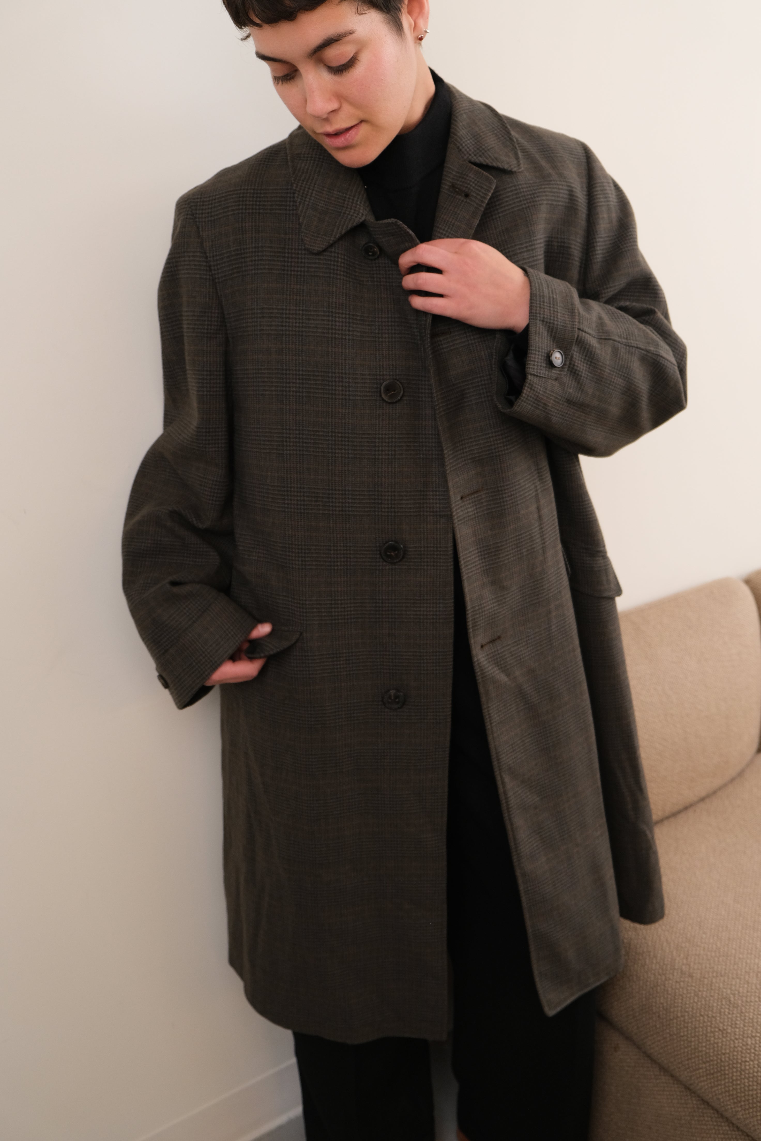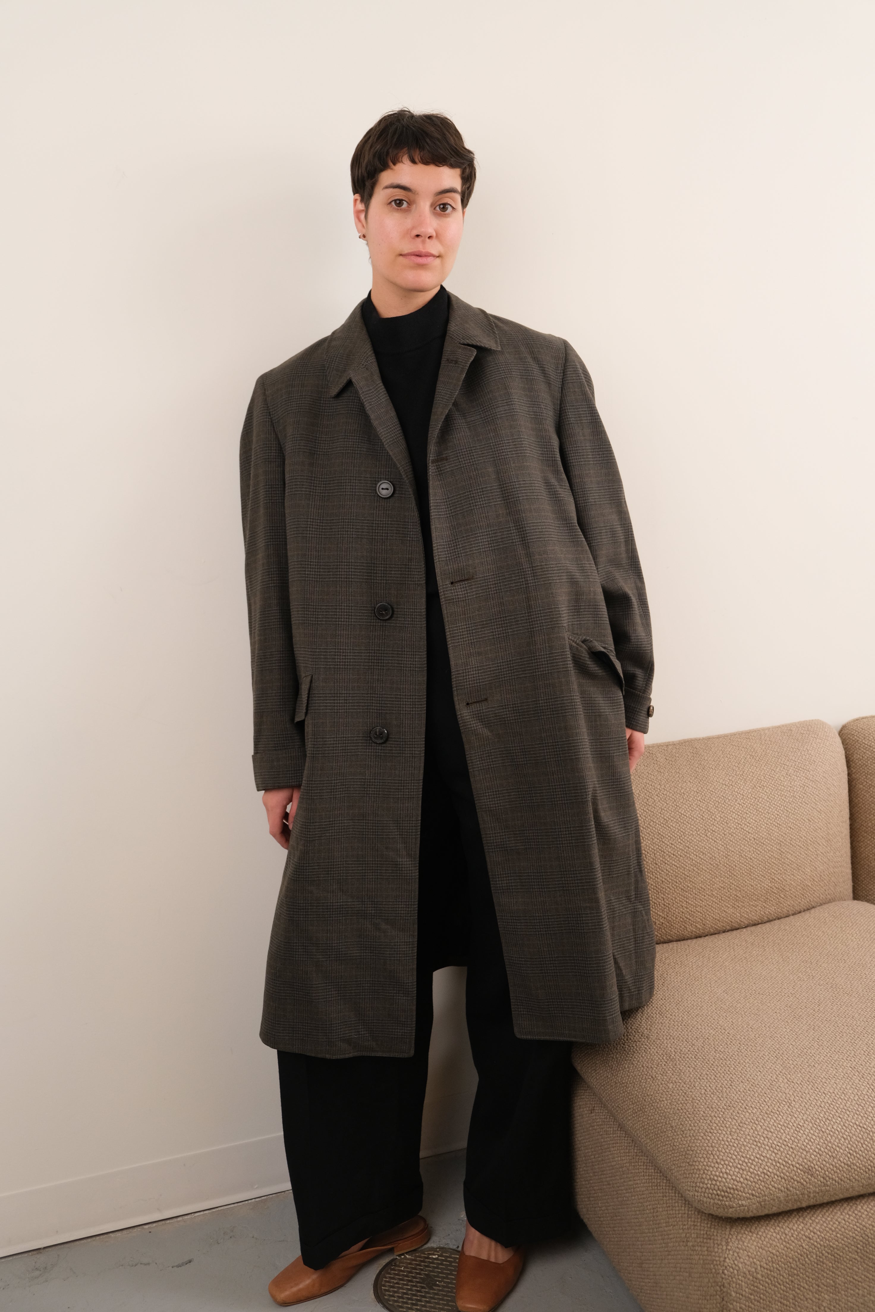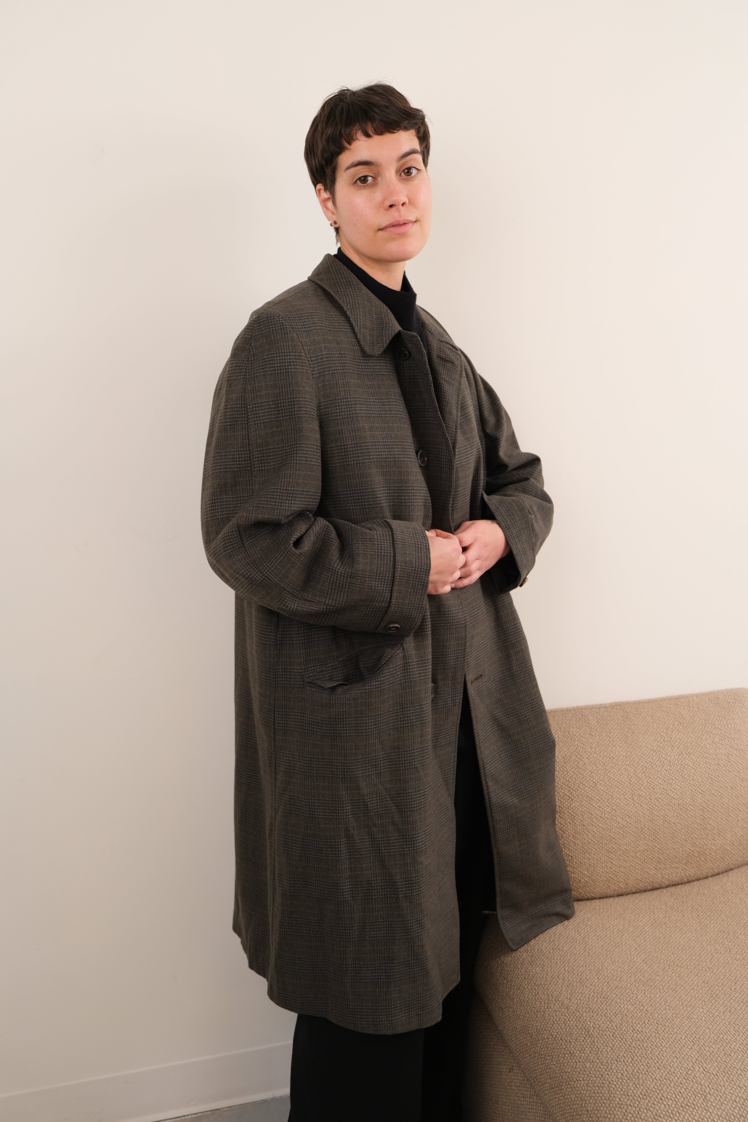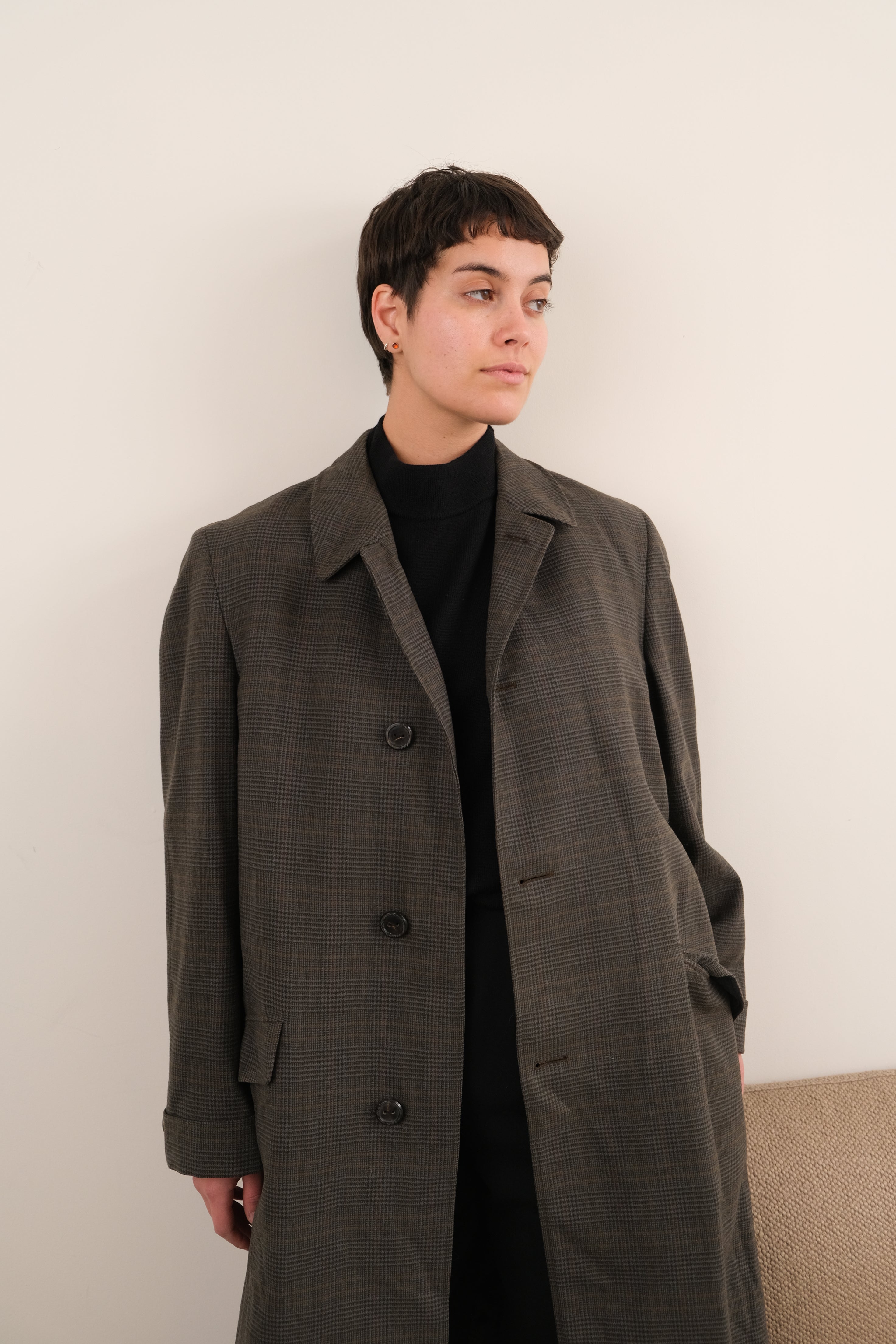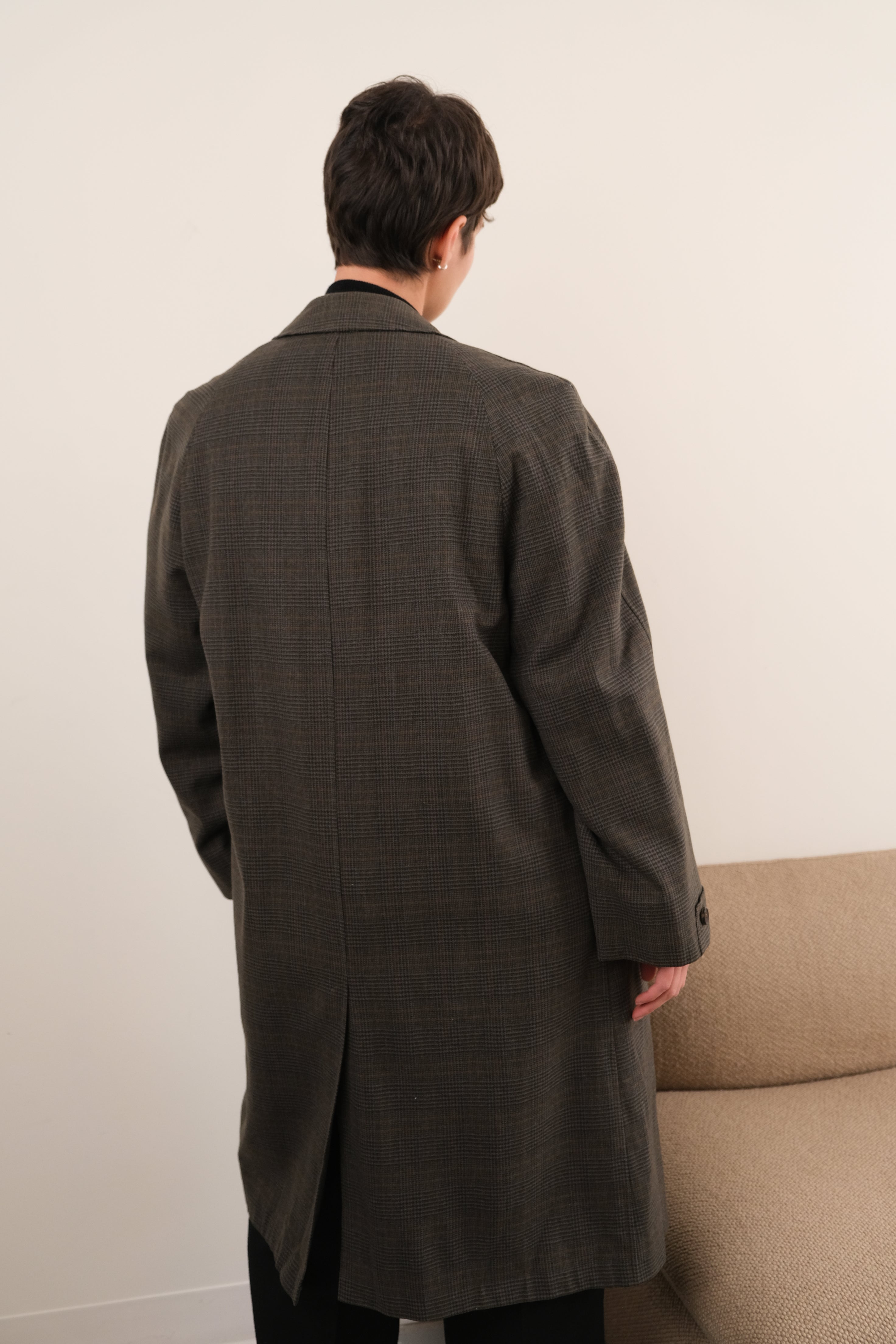 Cut in dark gray wool with a subtle charcoal plaid, this coat has a smooth, lightly structured feel that reads polished and substantial without feeling heavy. The silhouette falls to a longline length with a straight, relaxed drape, finished with a three-button front, notched collar, and flap pockets that keep the look clean and balanced. Interior construction shows careful tailoring with a fully lined body for easy layering and comfort through cooler months.