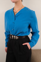 Vintage Cobalt Silk V-Neck Long Sleeve Blouse