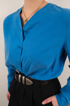 In vivid blue silk, this blouse feels smooth and fluid with a beautiful, light-catching finish. Cut with a clean v-neckline, button front, and lightly structured shoulders, it drapes easily through the body for a refined, effortless shape.