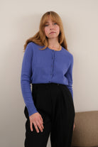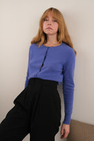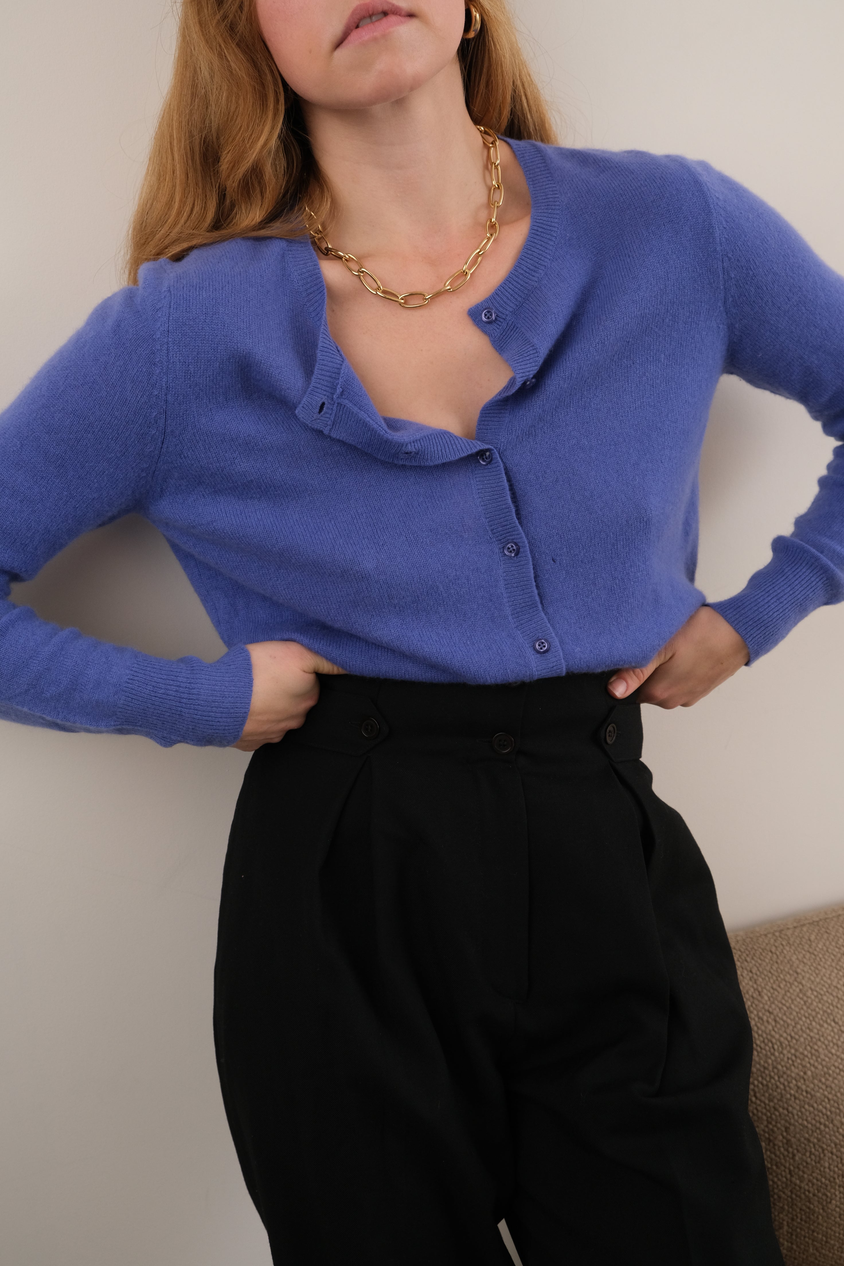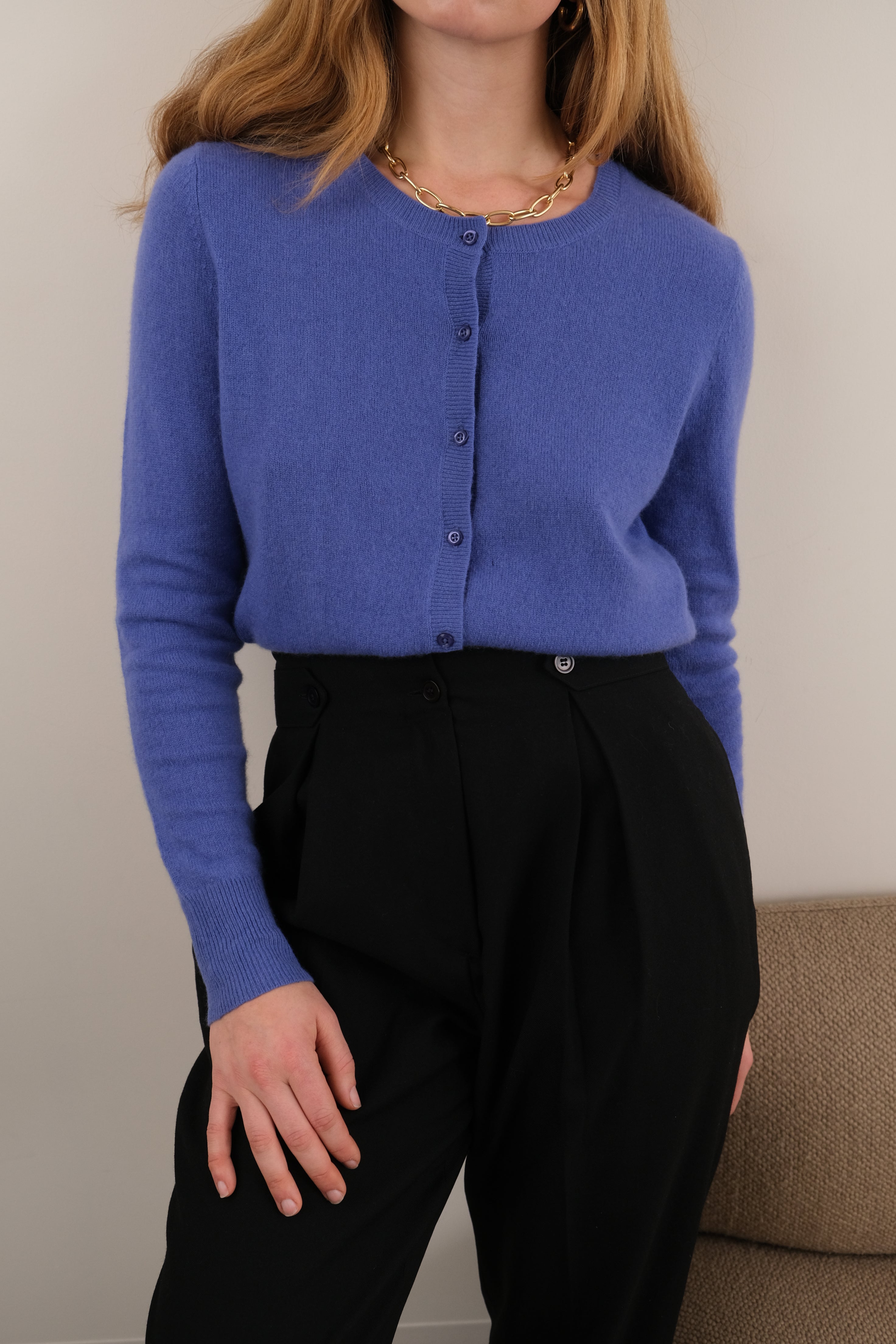 In a gentle purple cashmere, this sweater feels soft, lightweight, and gently warming against the skin. Designed with a clean crew neckline, full button front, and finely ribbed cuffs and hem, it has a refined, understated finish that reads polished without feeling precious.