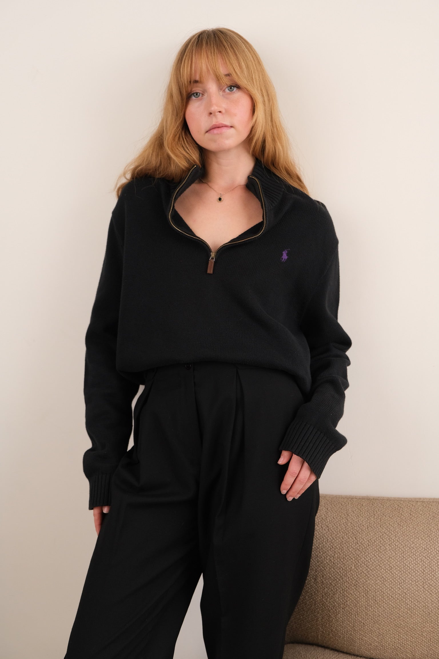 In sleek black 100% cotton knit, this quarter-zip sweater feels soft and lightly structured, finished with a ribbed mock neck and wide rib cuffs and hem. A small polo rider embroidery at the chest in purple thread adds a subtle point of contrast.