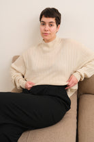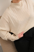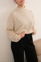 In soft cream wool, this sweater feels gently warm and breathable with a fine ribbed knit that gives subtle texture throughout. Designed with a relaxed mock neckline, dropped shoulders, and long sleeves with ribbed cuffs and hem, it wears easy through the body with a clean, understated silhouette.
