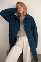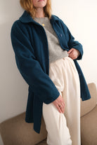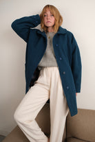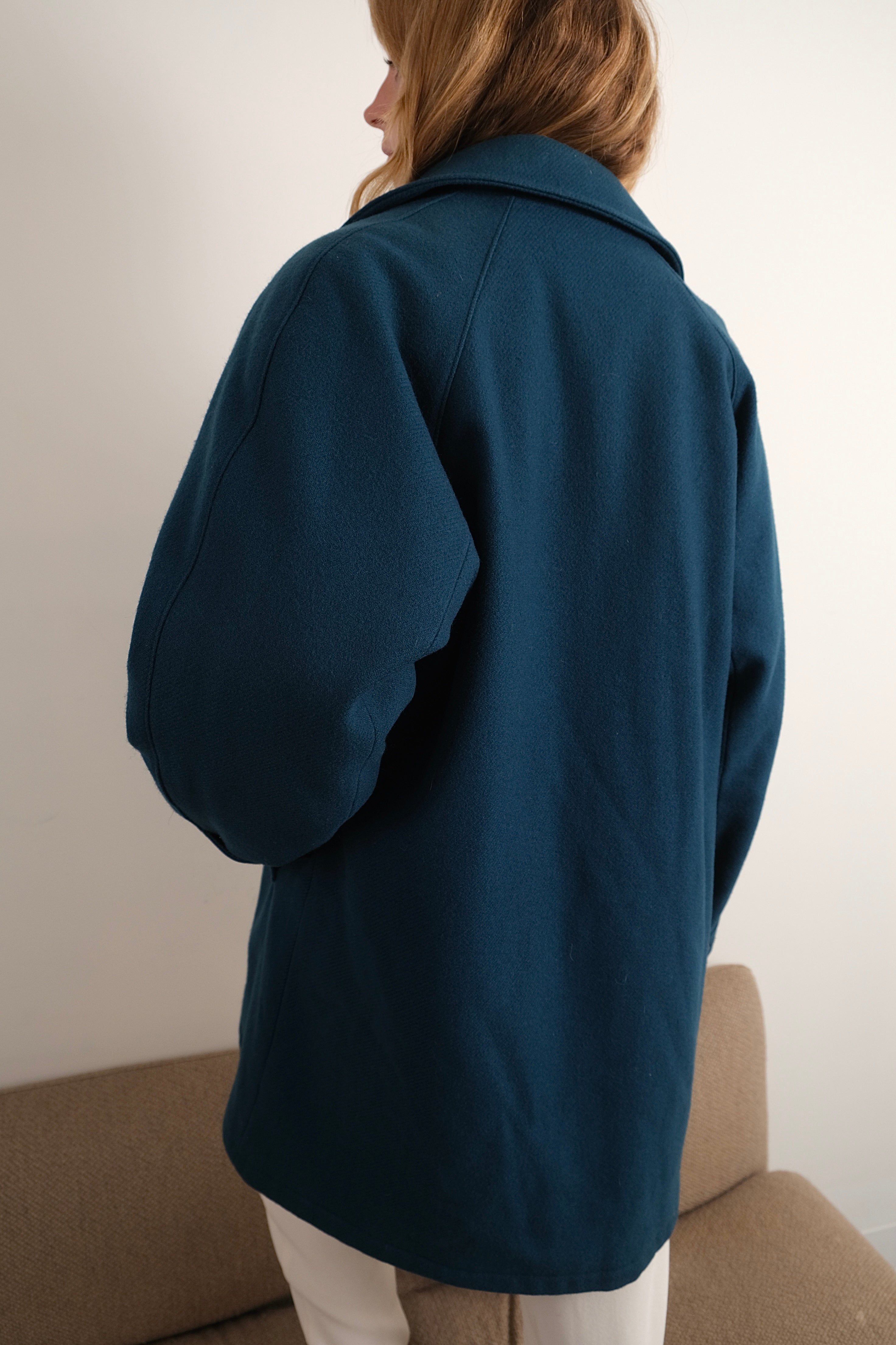 In dark teal pure wool, this coat feels softly structured and warm with a brushed, mid-weight finish. It’s fully lined in a plaid wool-blend for extra insulation and comfort. Cut with easy raglan sleeves and a rounded collar, it features a clean five-button front, slanted welt pockets, and a hidden interior zipper under the placket for wind protection.