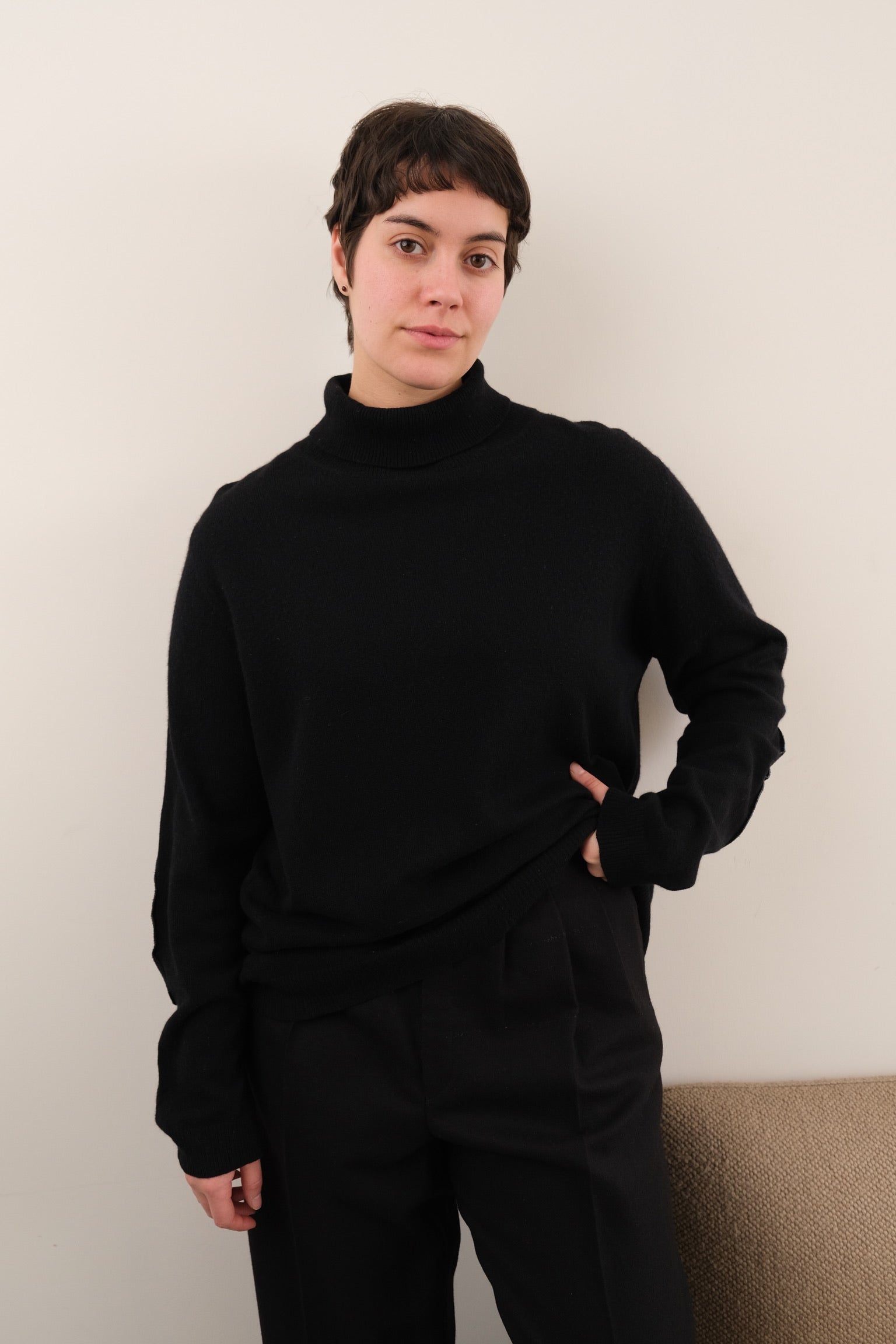 Finished in deep black wool, this pullover has a super soft, matte surface that reads sharp and understated. Designed with a mock neckline, long sleeves, and reinforced elbow patches in smooth black suede, it offers a relaxed, straight silhouette with ribbed cuffs and hem that sit comfortably at the hip.