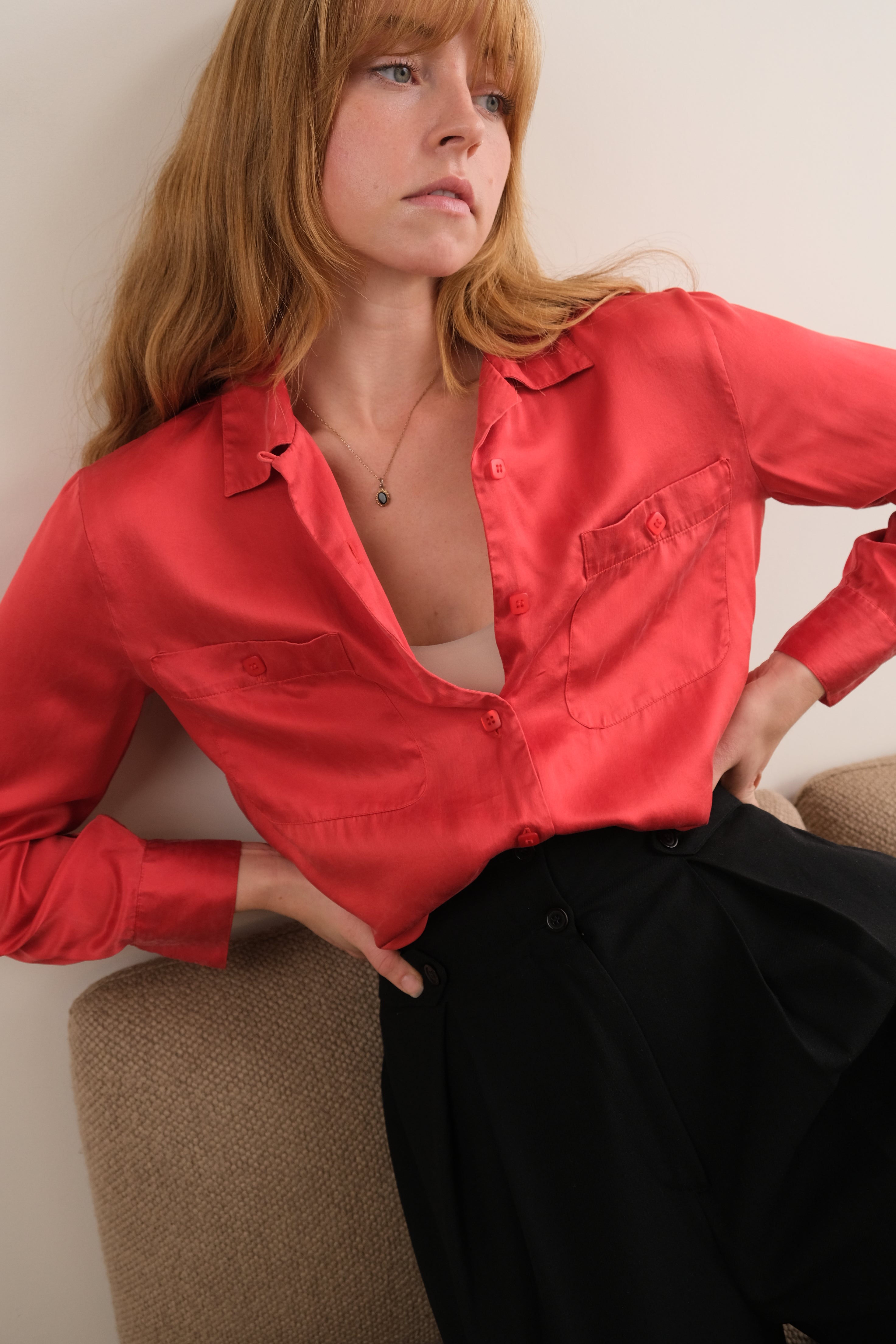In vivid red 100% silk fabric, this shirt feels smooth and lightly fluid, catching the light with a beautiful soft sheen. Designed with a relaxed straight cut, it features a pointed collar, tonal red buttons, and two chest patch pockets that add structure to the drape.
