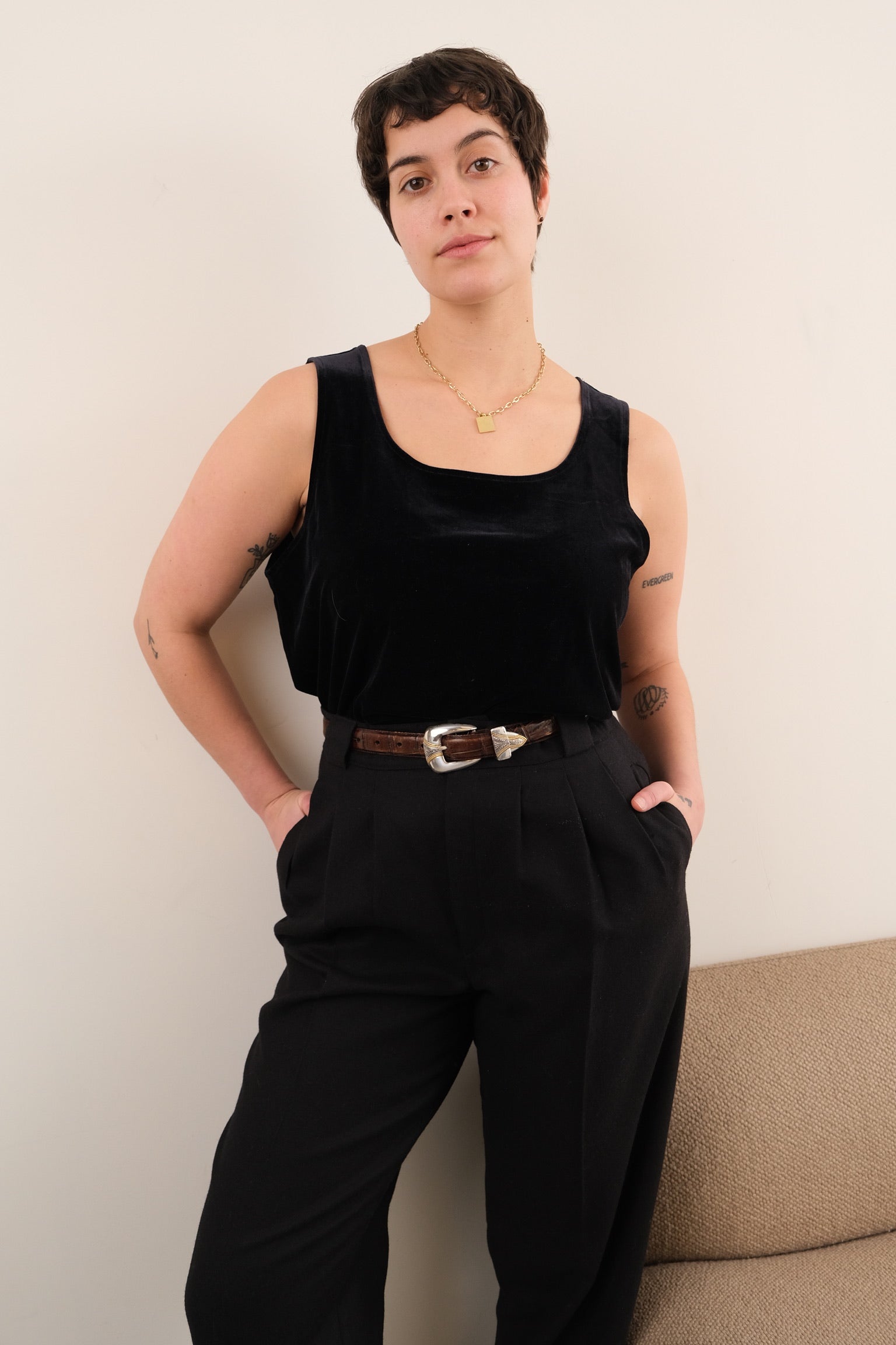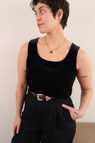 In black poly blend stretch knit, this sleeveless top feels smooth and lightly elastic with a soft matte velvety finish that sits cleanly against the body. The scoop neckline and straight-cut arm openings give it a streamlined, unfussy silhouette that layers easily or wears well on its own.