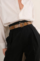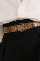 In a taupe-brown leather with a textured reptile finish, this belt has a softly structured feel with natural surface variation that gives it depth and character. An aged brass buckle and matching keeper complete the piece with a warm, timeworn finish.