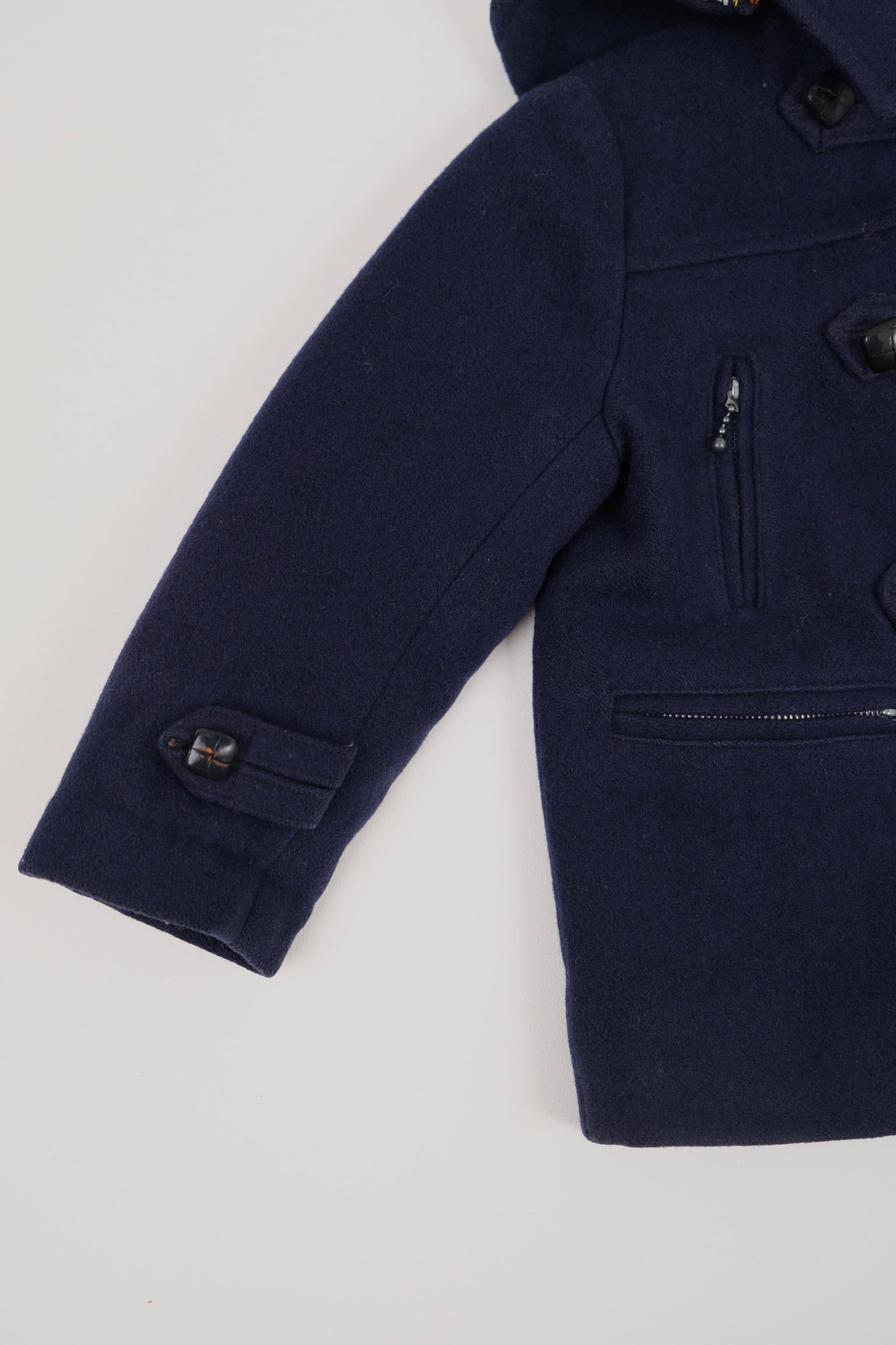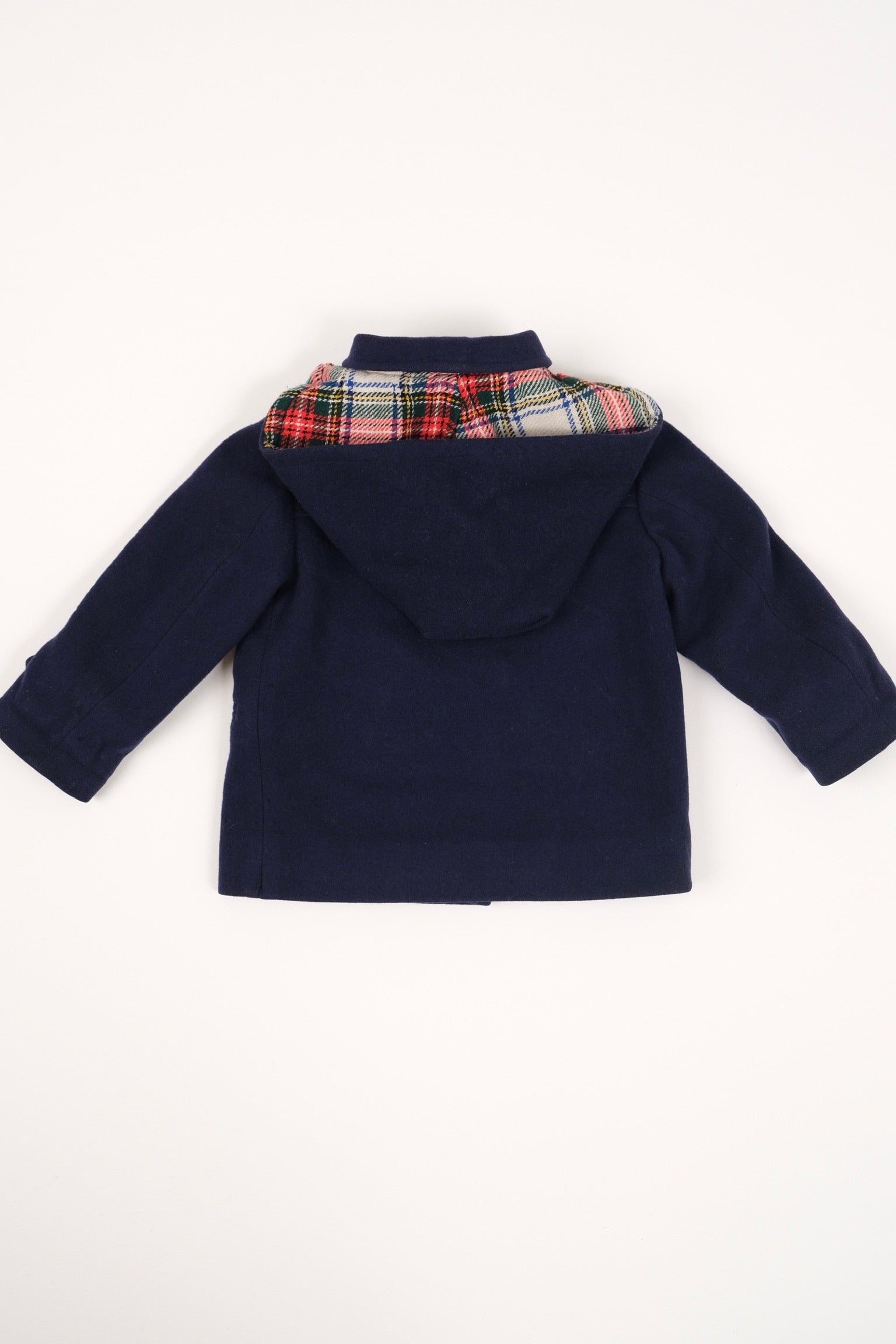 Deep navy 100% wool duffle coat featuring a structured silhouette, toggle front closures, and zippered hand pockets. The removable hood reveals a colorful tartan lining while the dense wool exterior provides warmth and durability typical of classic British outerwear. Note: Coat shows gentle signs along left arm.