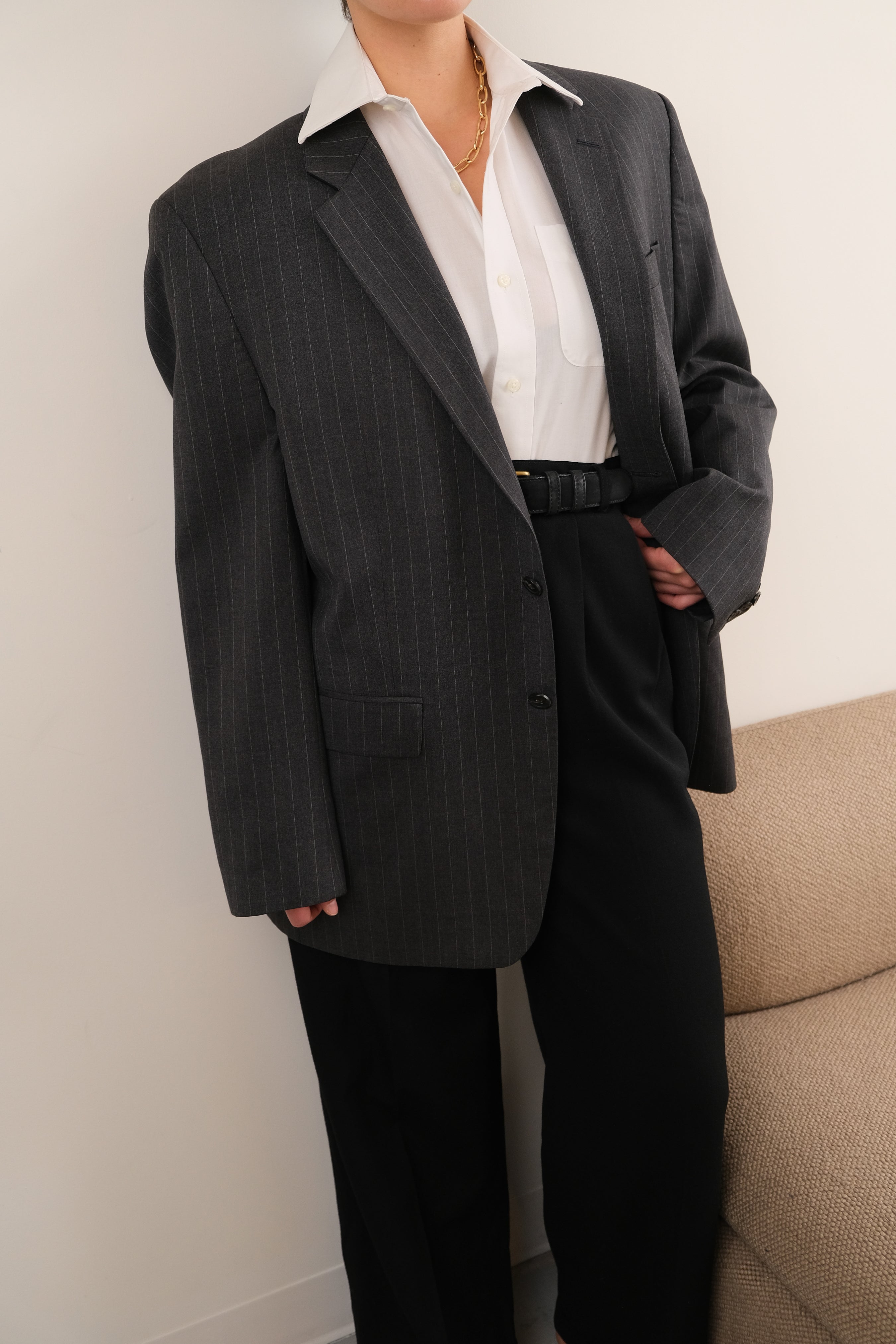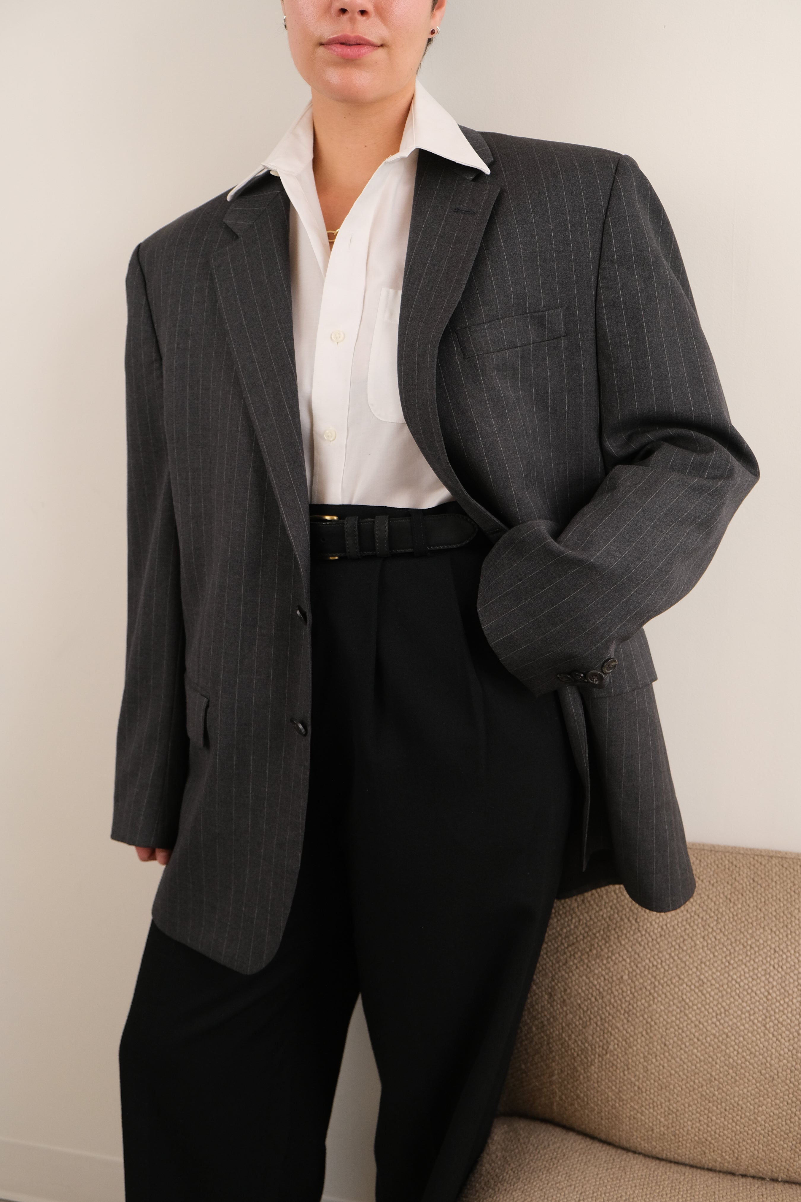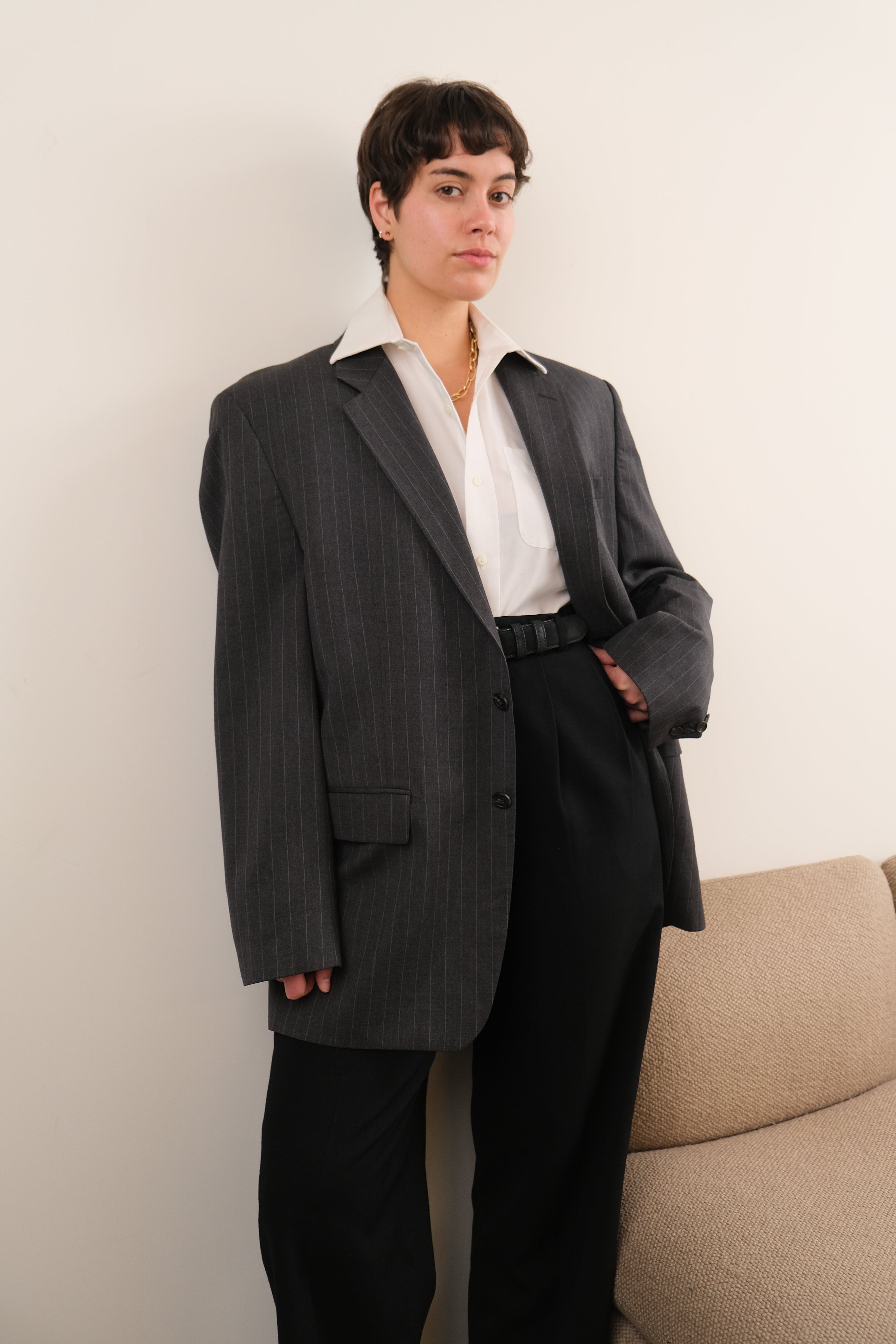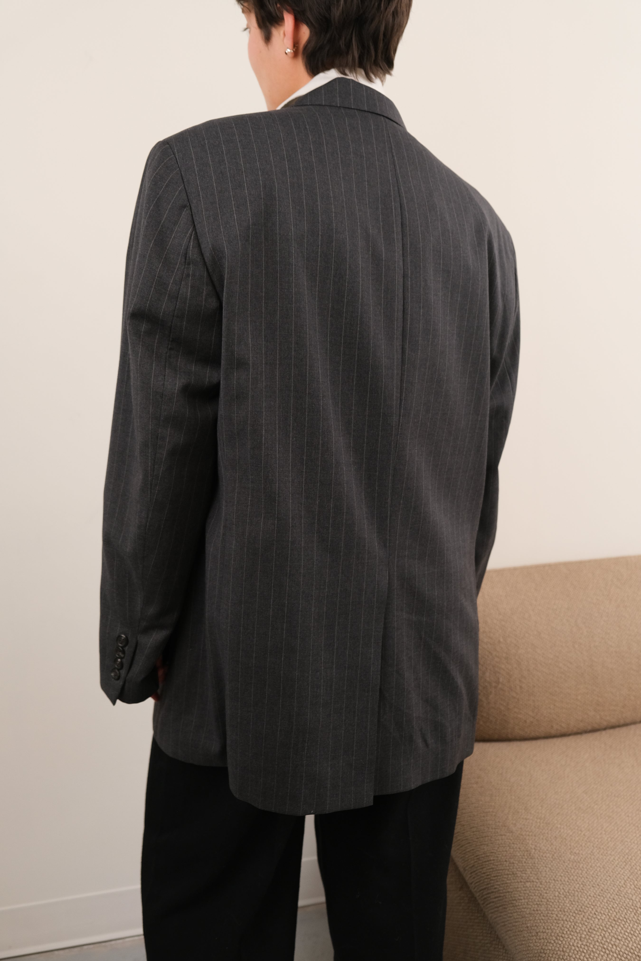 In dark gray pure wool with fine white pinstripes, this blazer carries a refined, softly structured feel. Designed with notch lapels, a two-button front, flap pockets, and a welted chest pocket, it drapes cleanly through the shoulders with light internal padding and full lining for a smooth finish.