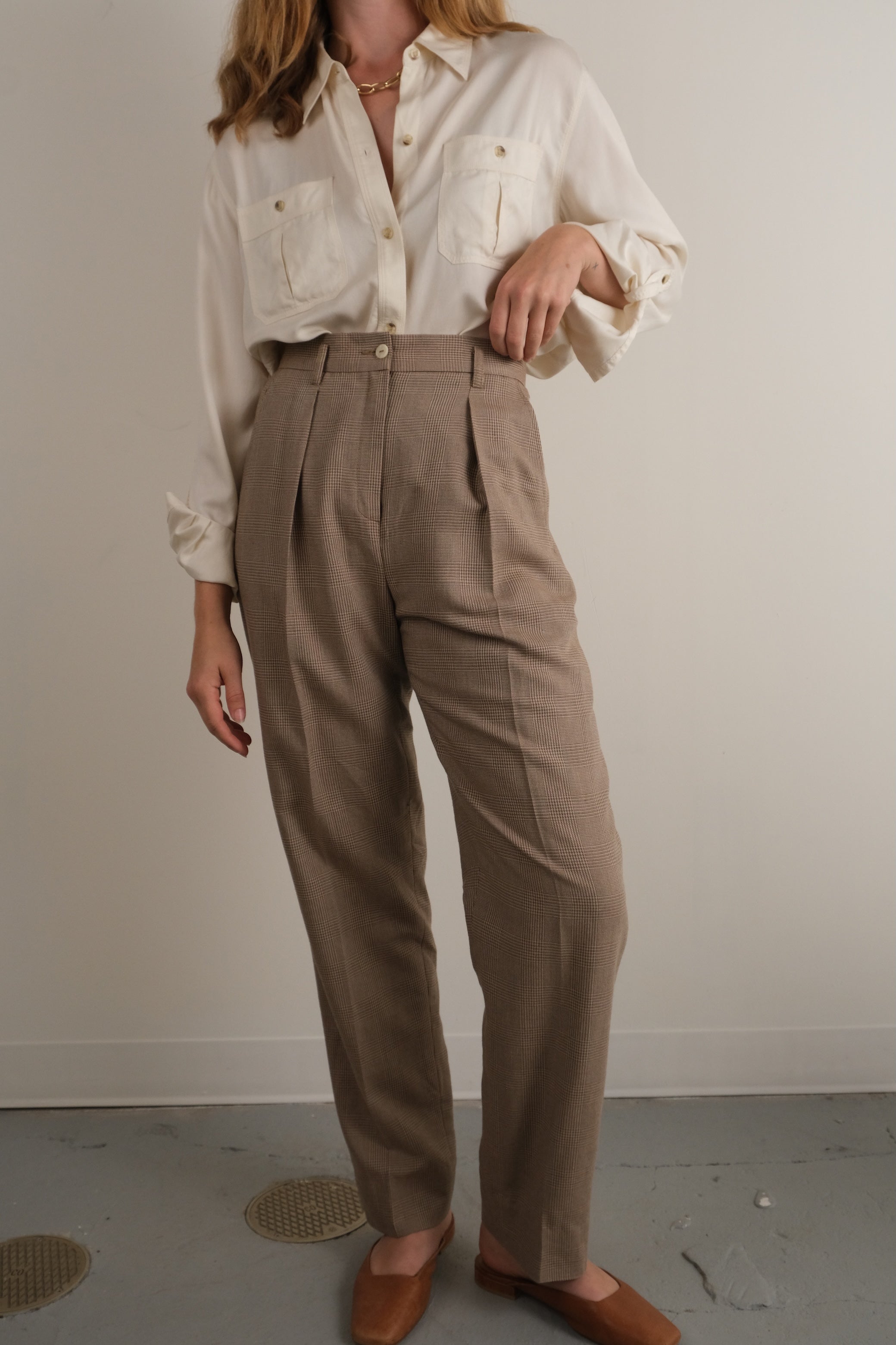 In light brown wool and rayon blend, these trousers have a softly structured yet fluid feel that drapes with ease. A subtle plaid pattern runs across the surface, giving the fabric quiet depth and visual texture. Designed with a high rise and double front pleats, the silhouette narrows into a clean taper through the leg. Belt loops, side seam pockets, and a welted back pocket finish the piece with functional tailoring.