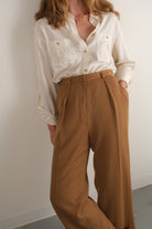 Rendered in golden yellow acetate blend, these trousers carry a softly structured yet fluid drape. The surface holds a subtle sheen, giving dimension to the fabric’s weight. Designed with a high rise, double front pleats, belt loops, and a wide leg, they are finished with a full-length hem that falls with tailored ease. Fully lined for comfort and shape, they balance refinement with wearability.