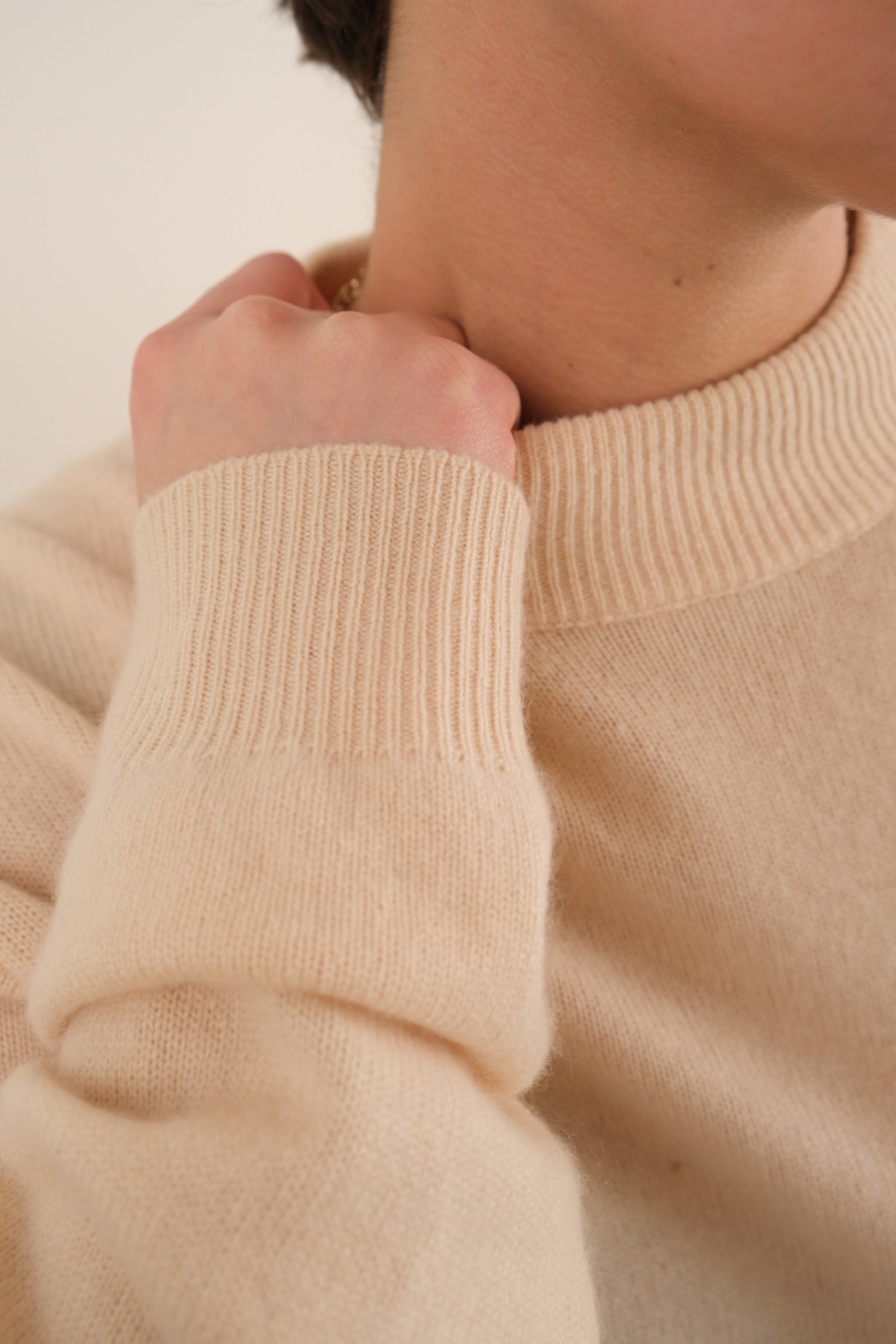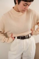 This cream cashmere sweater features a fine-gauge knit with a softly structured silhouette and a mock neckline. Designed with long sleeves and ribbed cuffs and collar, it presents a clean, minimal exterior with a smooth hand consistent with lightweight cashmere knits. The overall impression is understated and refined, with gentle drape through the body.