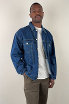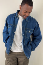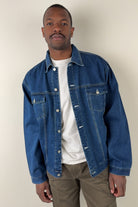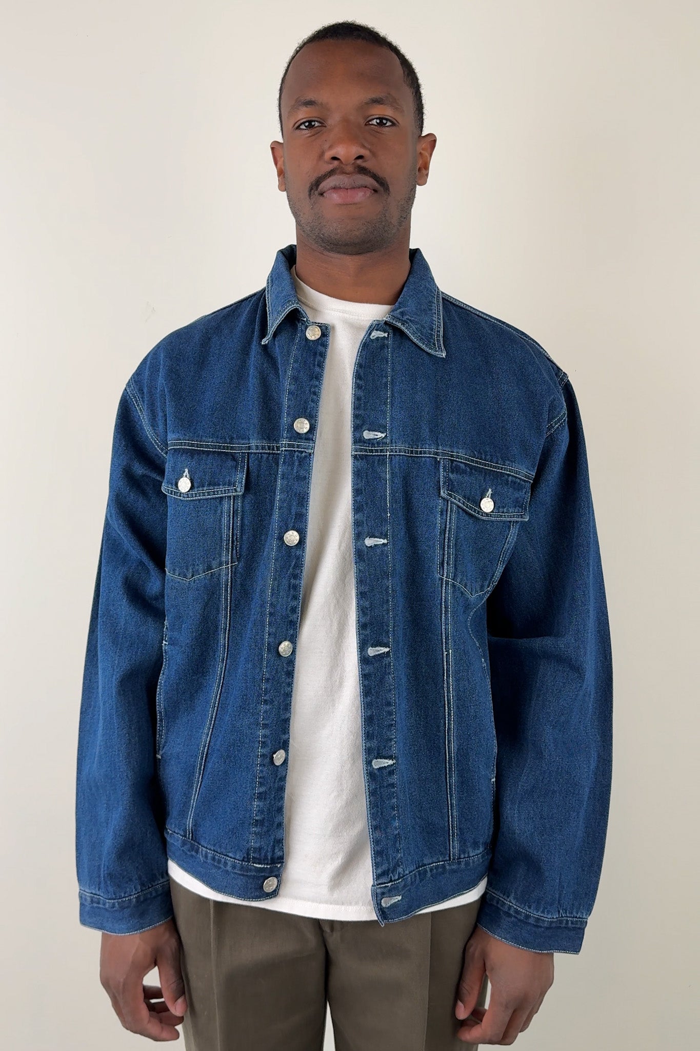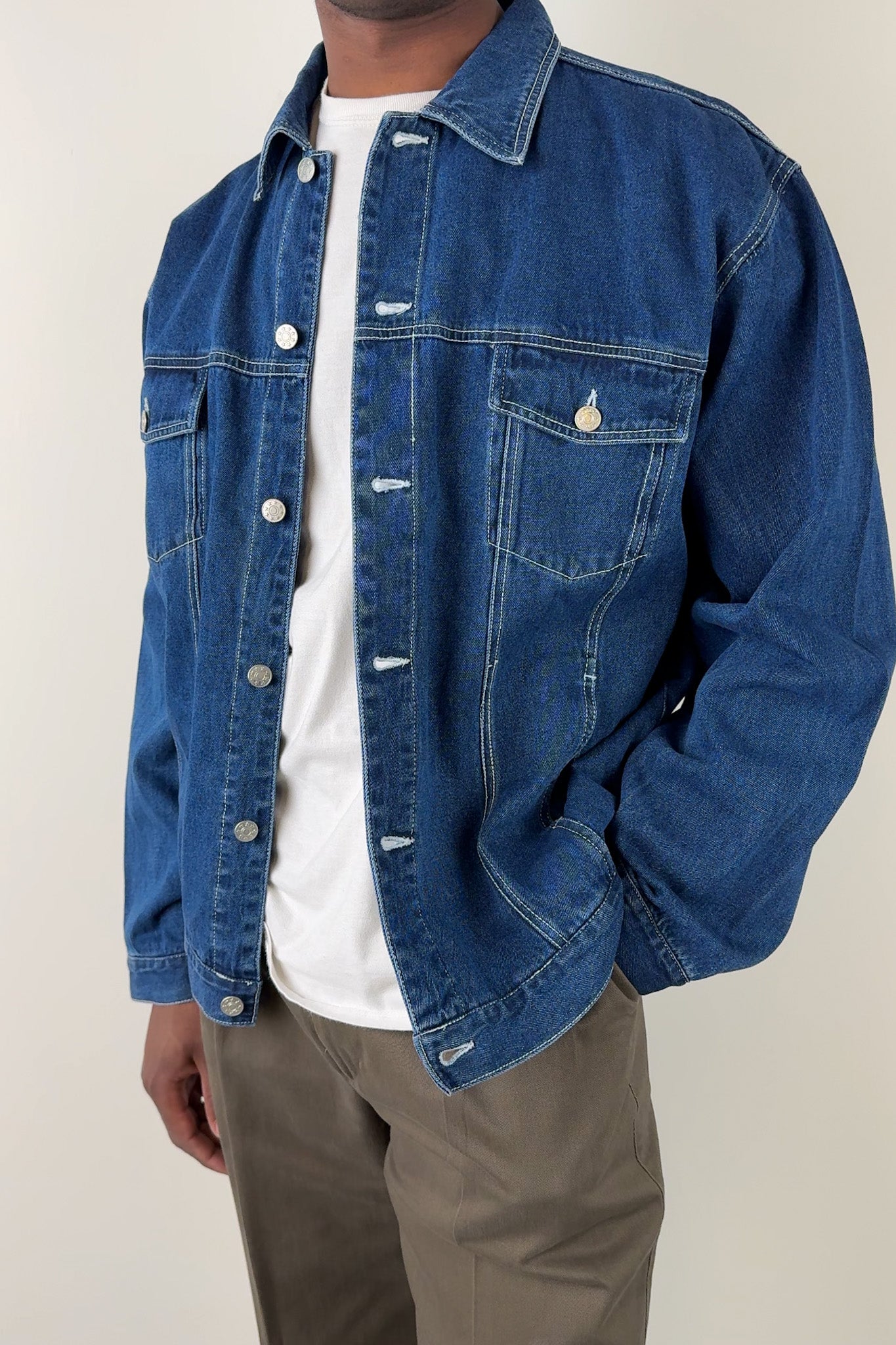 Structured and full of character, this dark blue wash jacket is cut from durable cotton denim with a naturally broken-in feel. The silhouette is clean and boxy with crisp white seamwork, featuring four functional front pockets — two flap chest and two slanted waist — along with metal shank buttons and contrast topstitching throughout. Faint softening at the edges adds a gentle note of age without compromising structure, making this an easy outer layer through every season.
