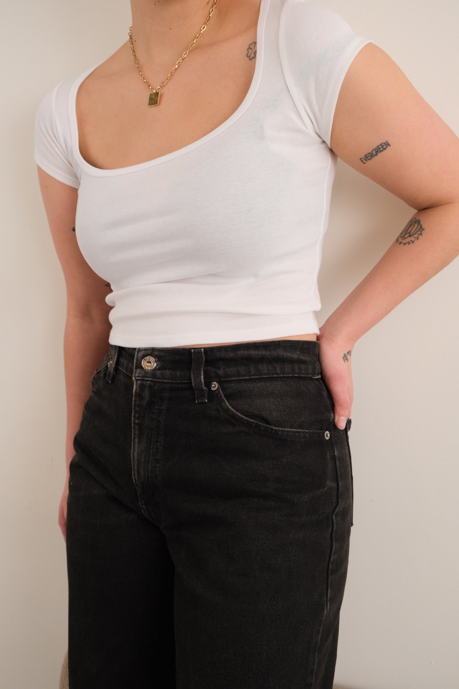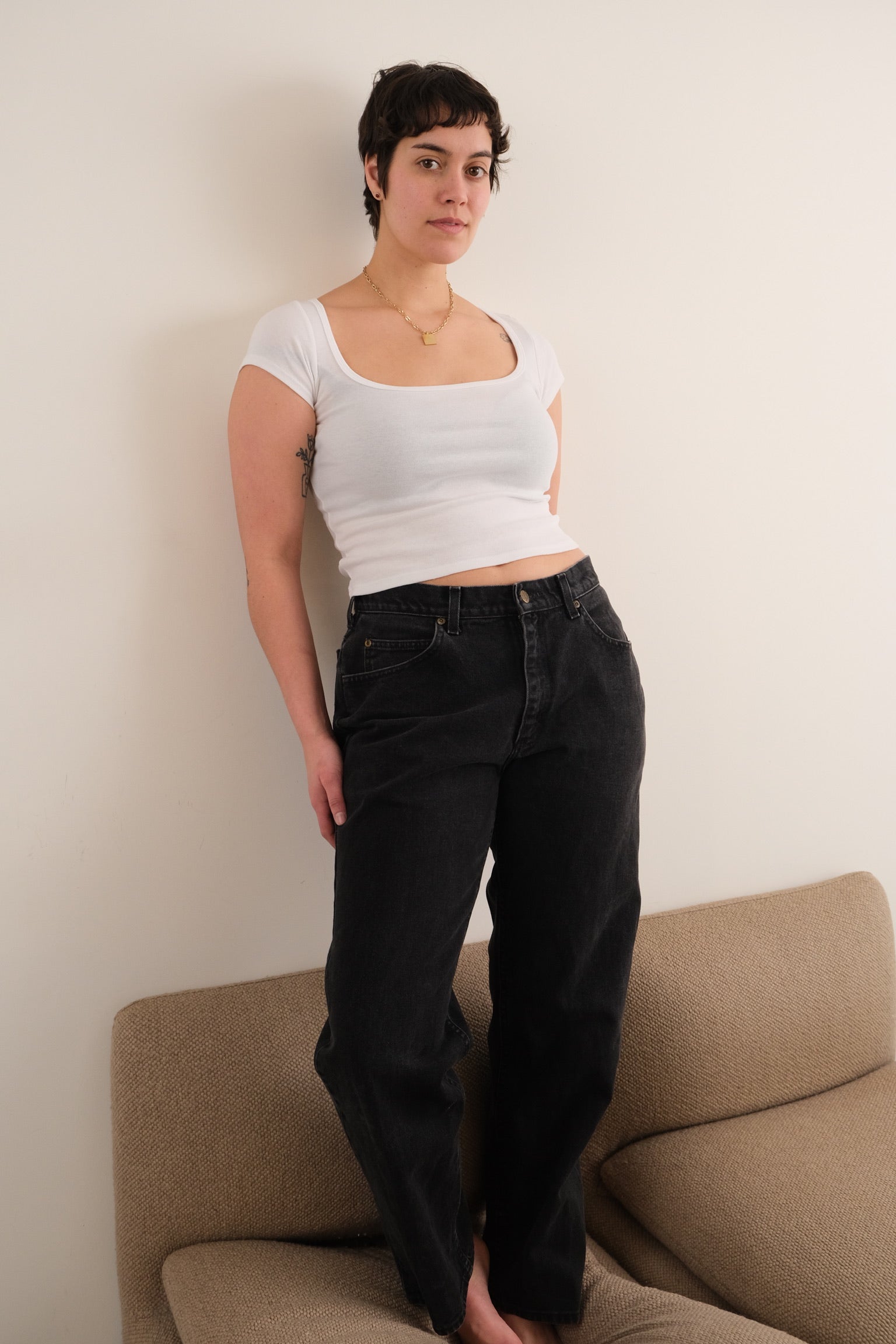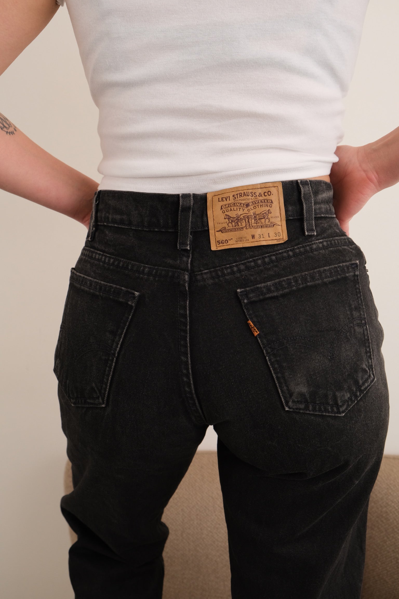 In black cotton denim, these jeans have a weighty, broken-in feel with a matte finish and subtle fading consistent with wear. Cut in Levi’s 560 silhouette, they feature a high rise, loose fit through the seat and thigh, and a tapered leg, finished with five-pocket construction, contrast stitching, and a leather jacron at the back waistband.